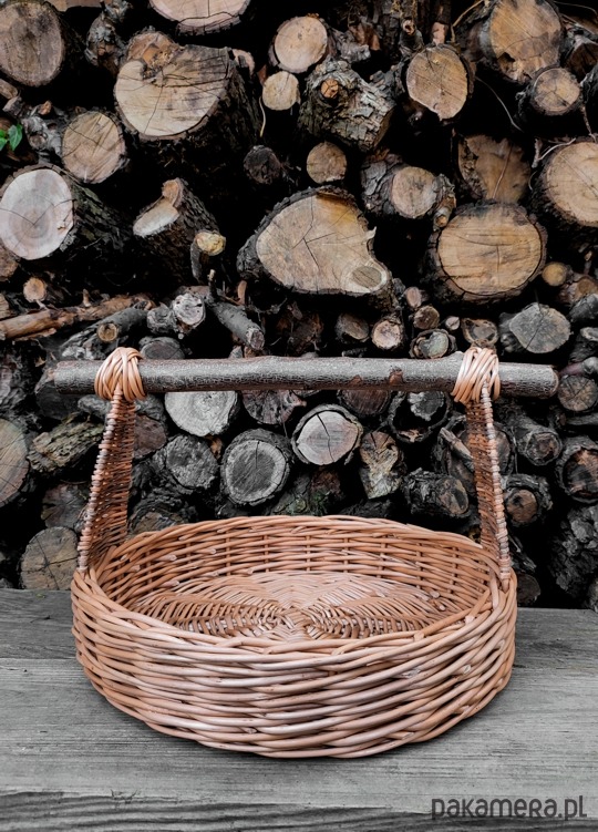 Niski kosz z drewnianym uchwytem, wypleciony na okrągłej podstawie, z wysoko osadzoną rączką. Na co dzień sprawdzi się jako kosz na owoce, do ekspozycji produktów czy kompozycji florystycznych.