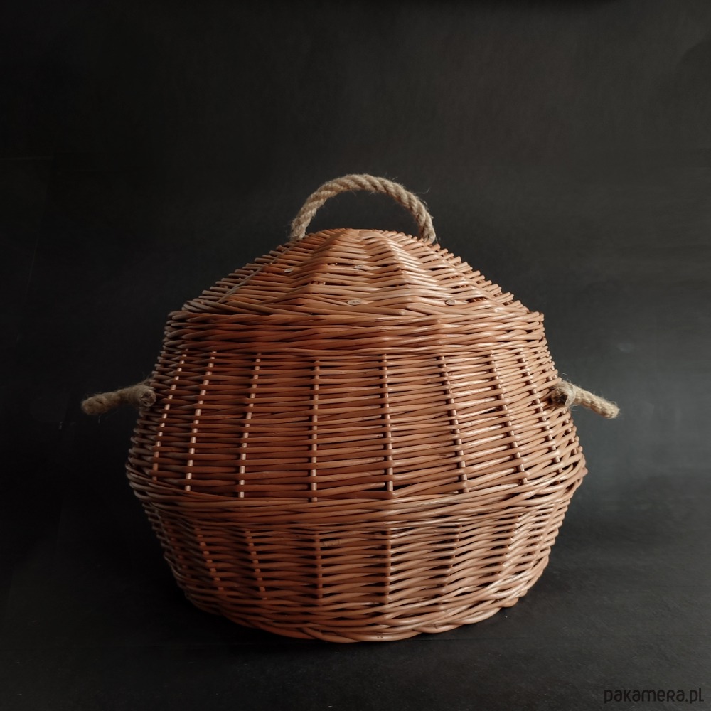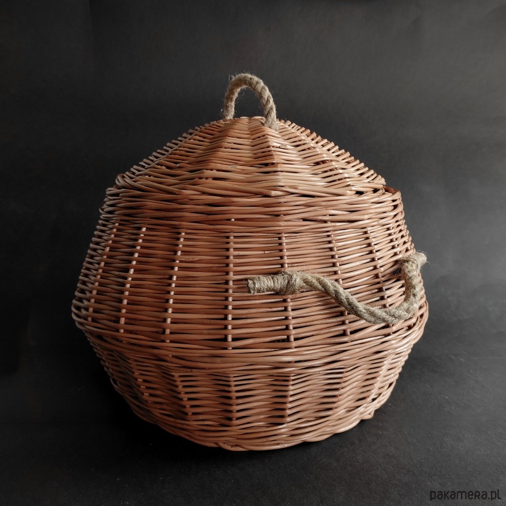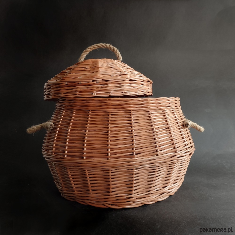 Kosz wypleciony z na okrągłym dnie, zamykany wiklinową pokrywką.