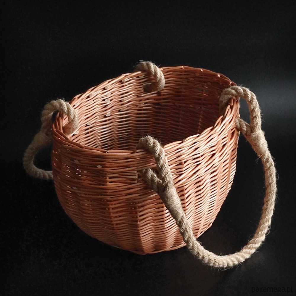Duży wiklinowy kosz zakupowy z uchwytami z jutowej liny. Ze wzwlędu na kształt jest pojemny, a jedocześnie poręczny.