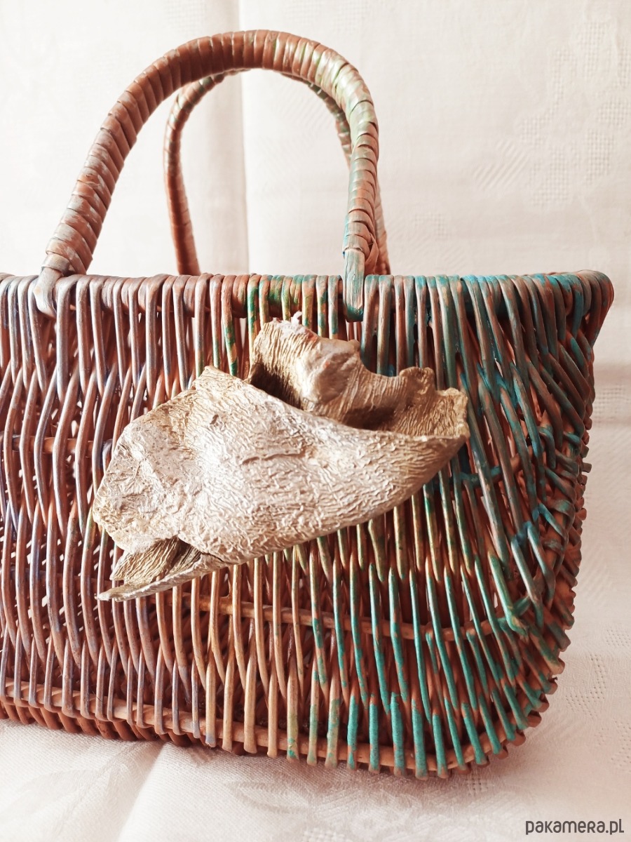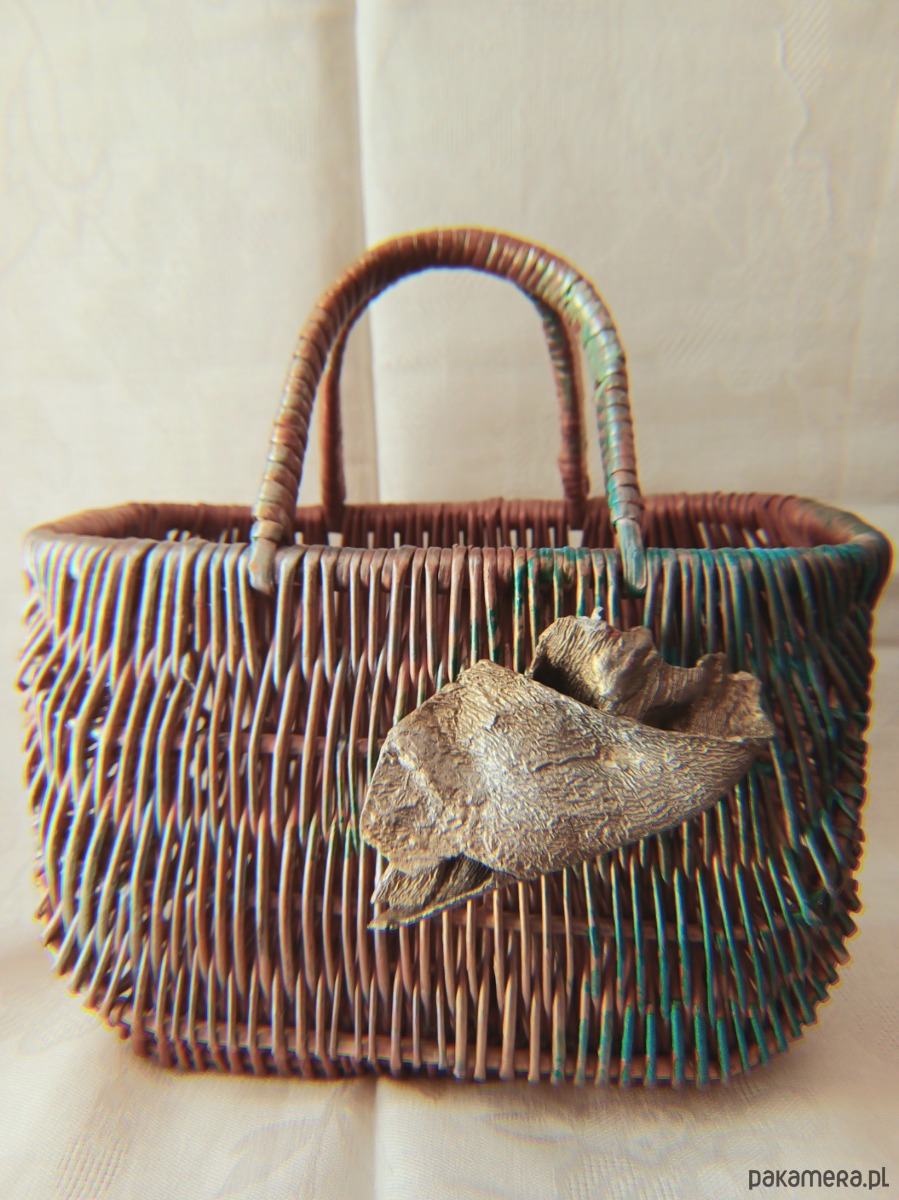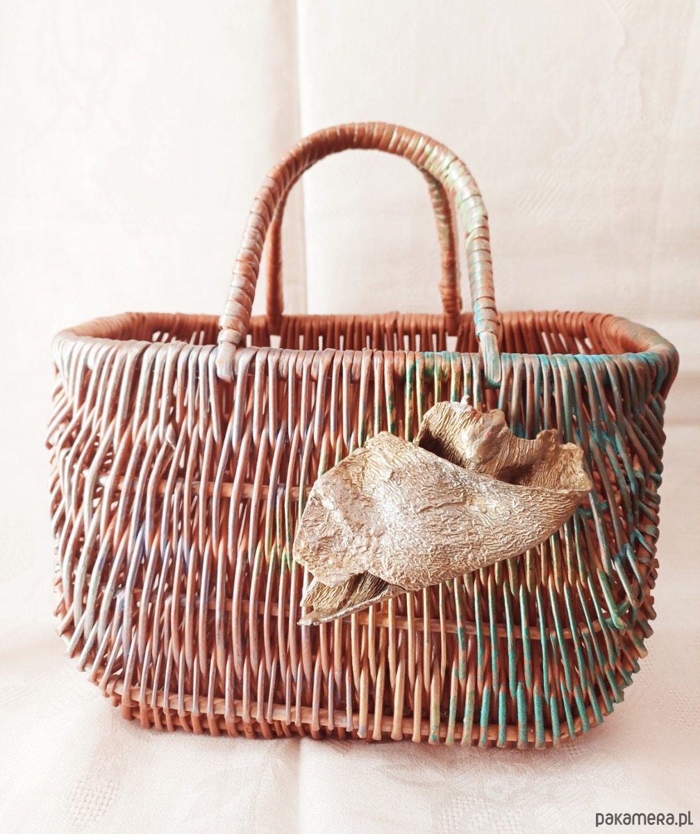 Ręcznie wyplatany koszyk z polskiej wikliny, malowany ekologicznymi farbami, z ozdobną aplikacją z suszonego liścia agawy.