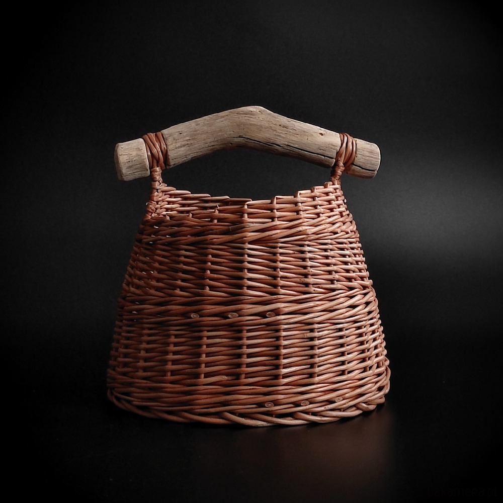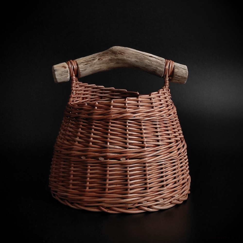 Wiklinowy koszyk z drewnianym uchwytem, wypleciony na okrągłej podstawie.