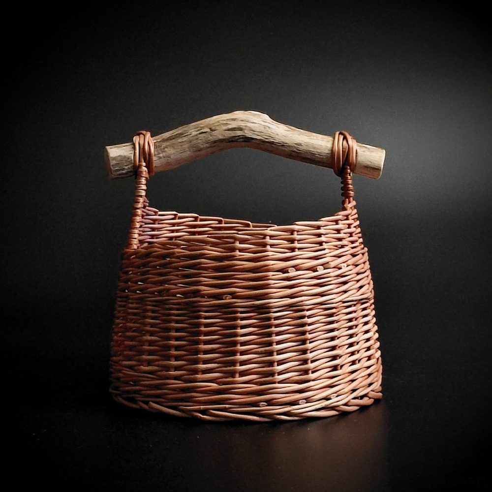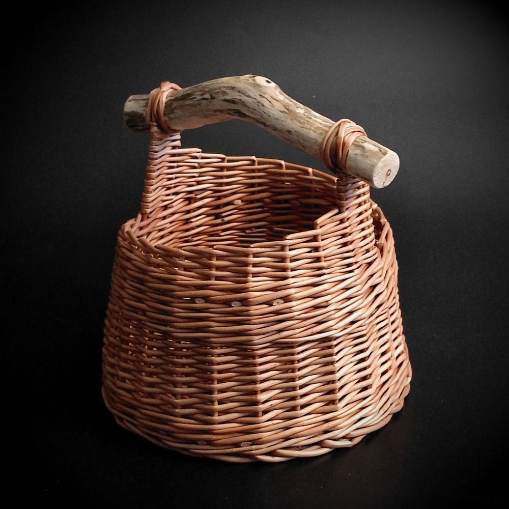 Wiklinowy koszyk z drewnianym uchwytem, wypleciony na okrągłej podstawie.