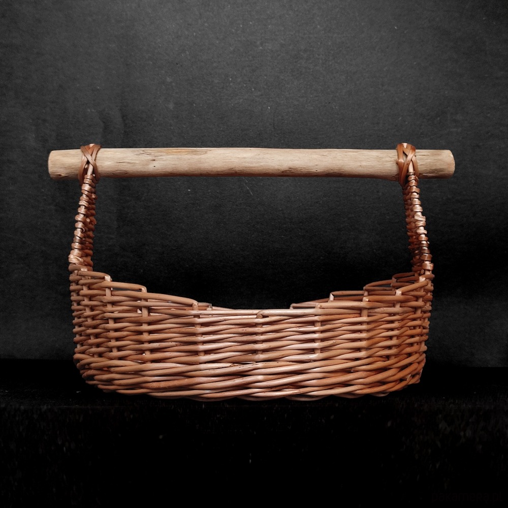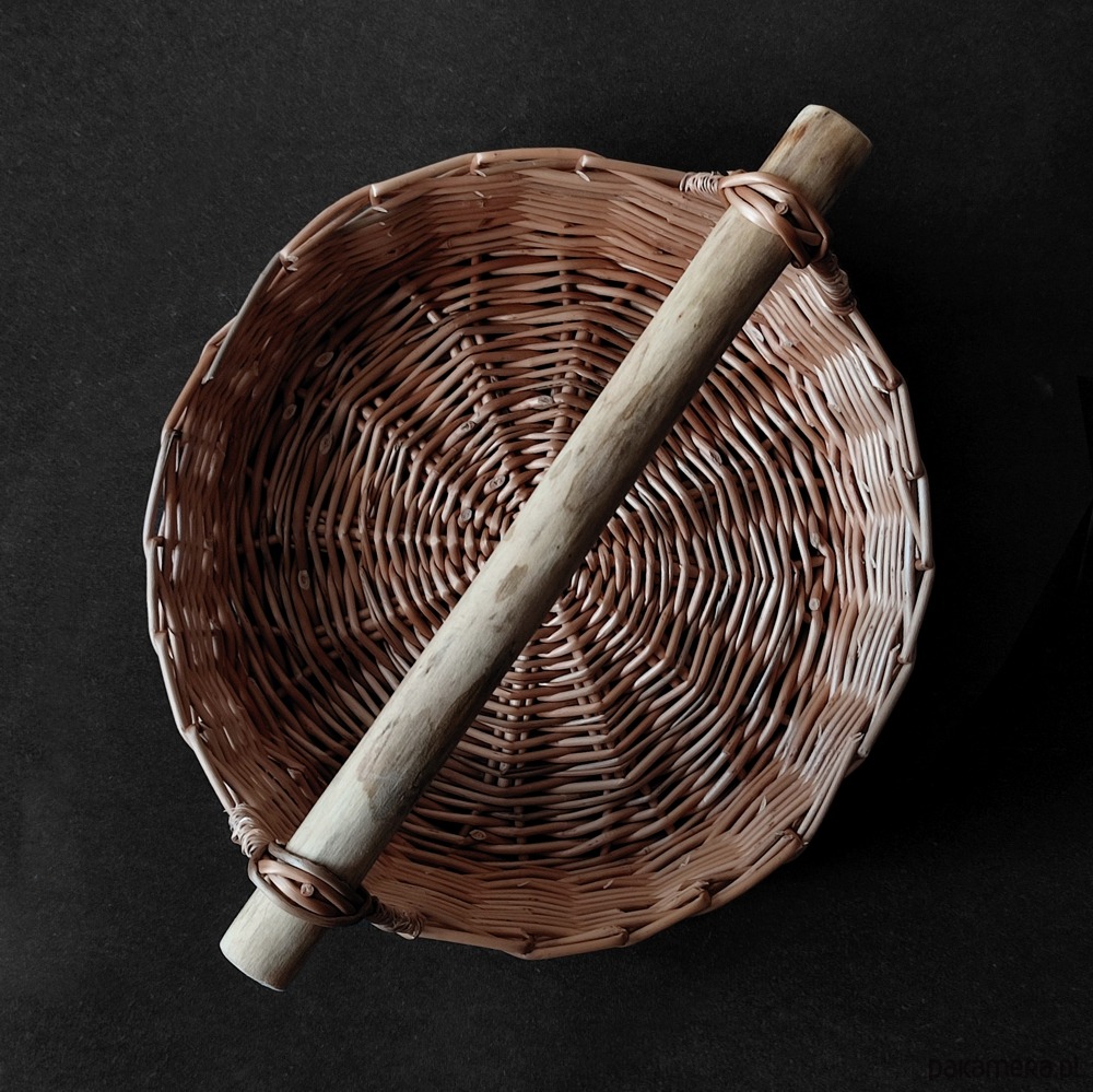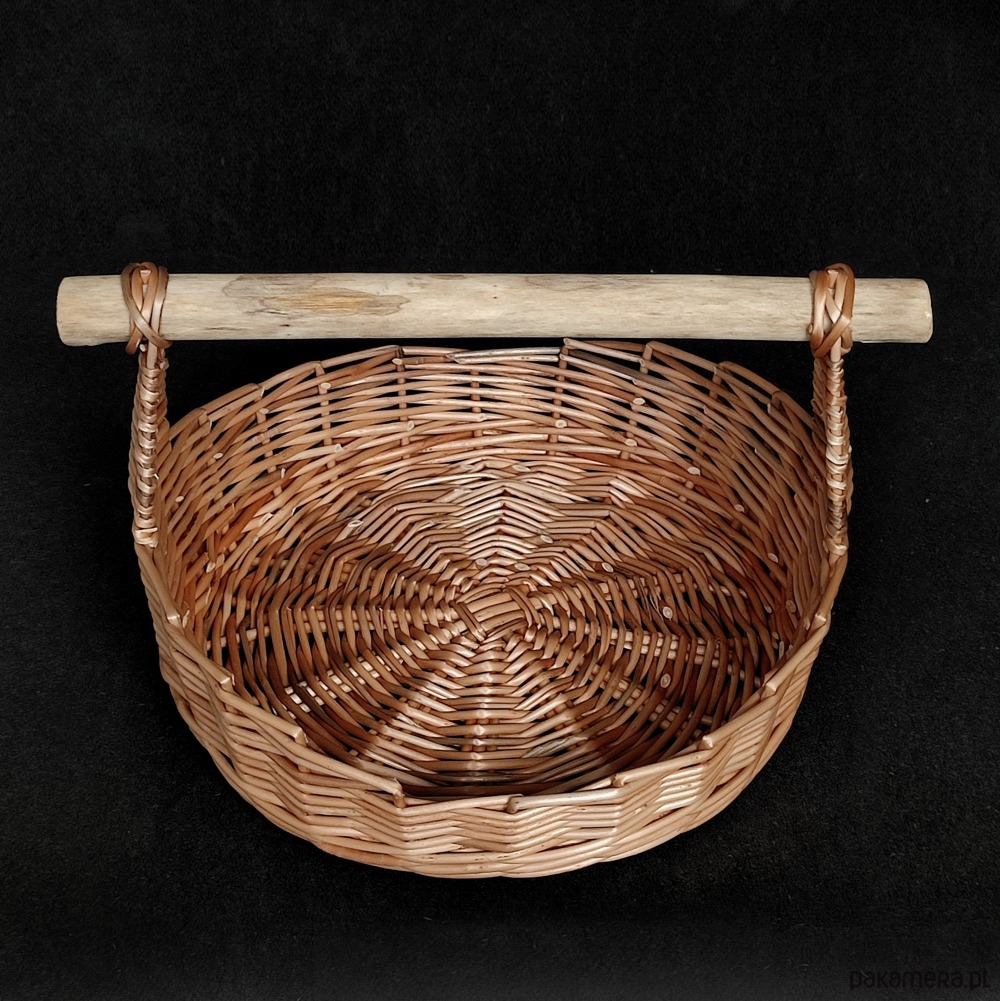 Mały płytki wiklinowy koszyk, wypleciony na okrągłym dnie.