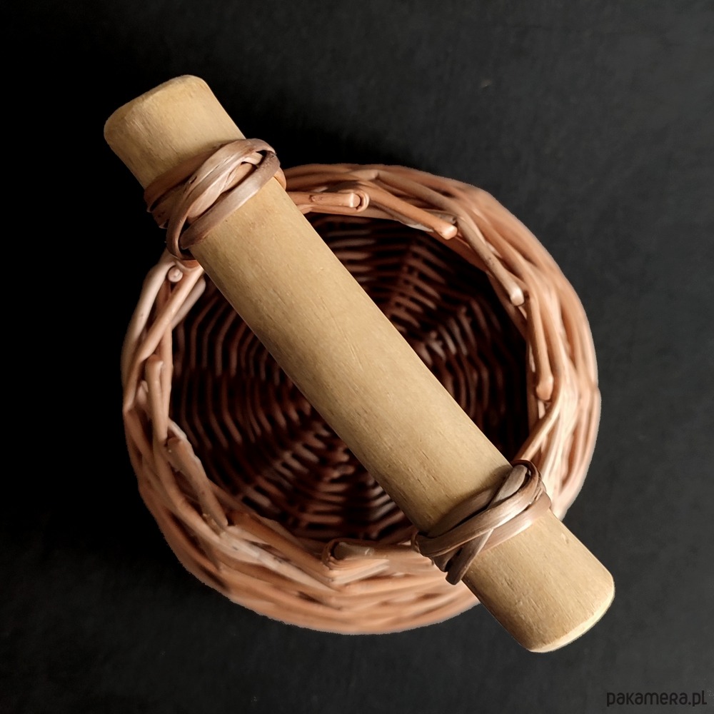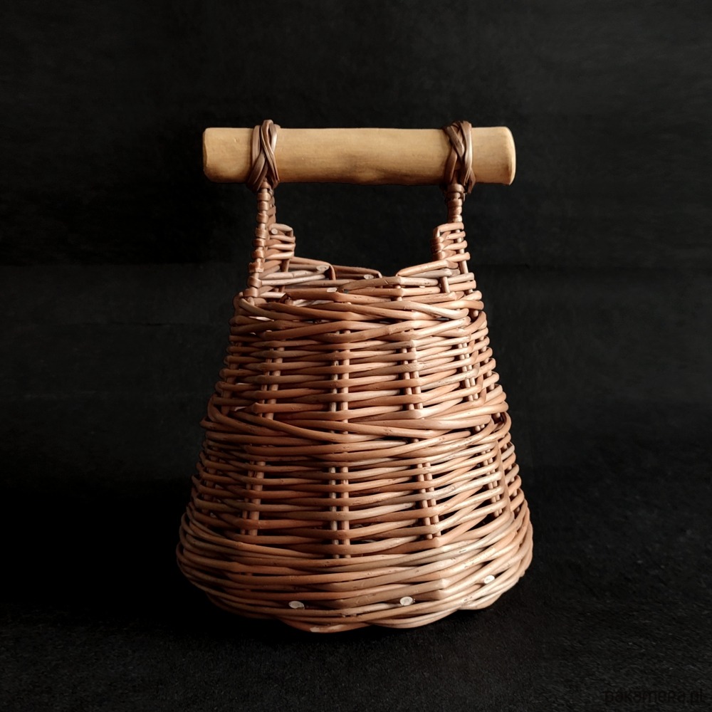 Wiklinowy koszyk z drewnianym uchwytem, wypleciony na okrągłej podstawie.