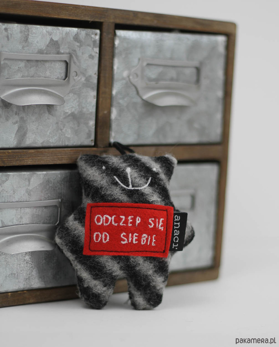 Wiktor uszyty został z dzianiny swetrowej , zaopatrzony w filcową plakietkę z wyhaftowaną dedykacją, mierzy sobie 10 cm.