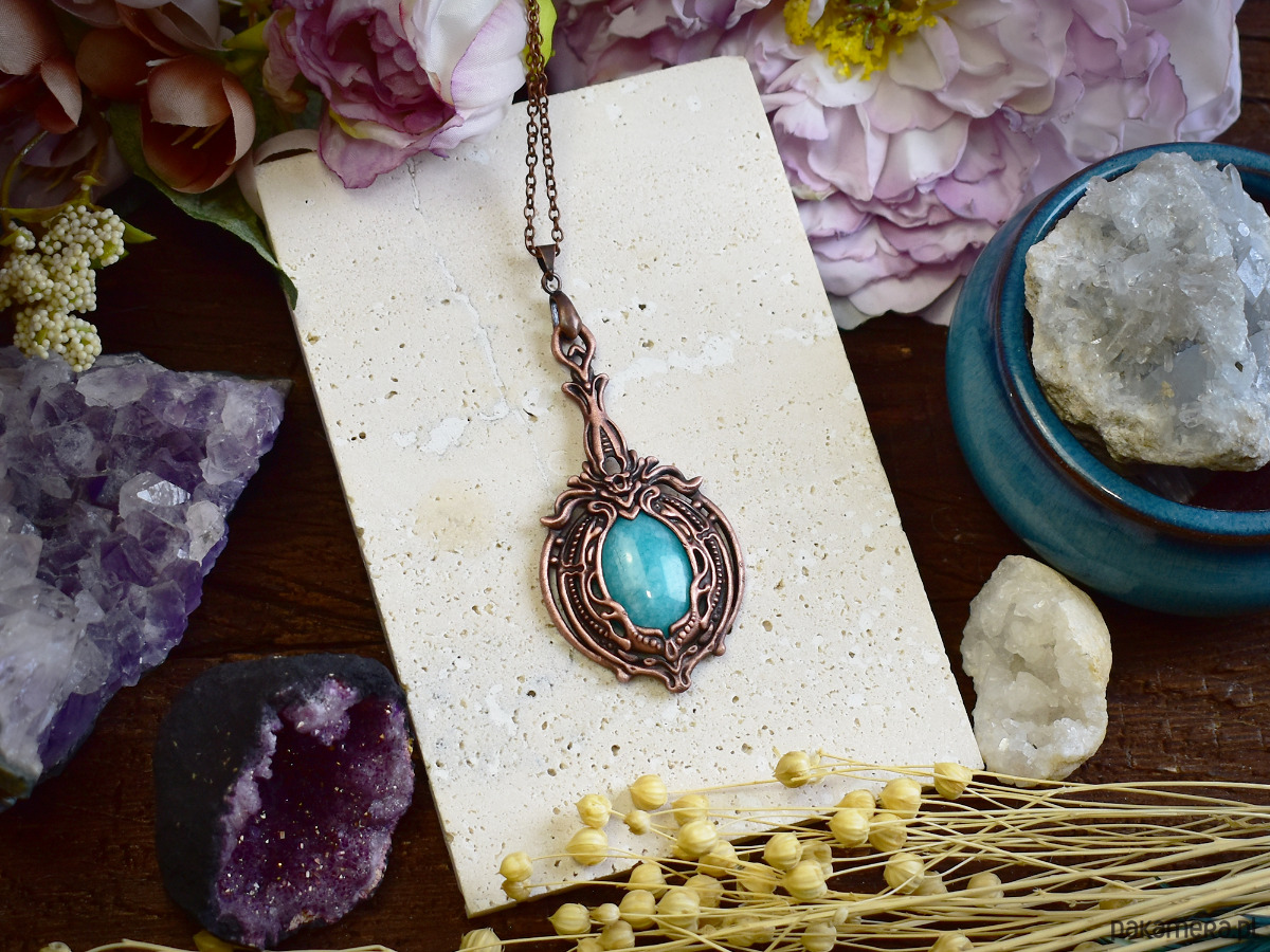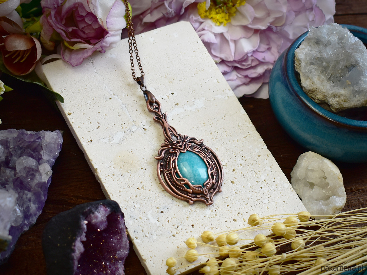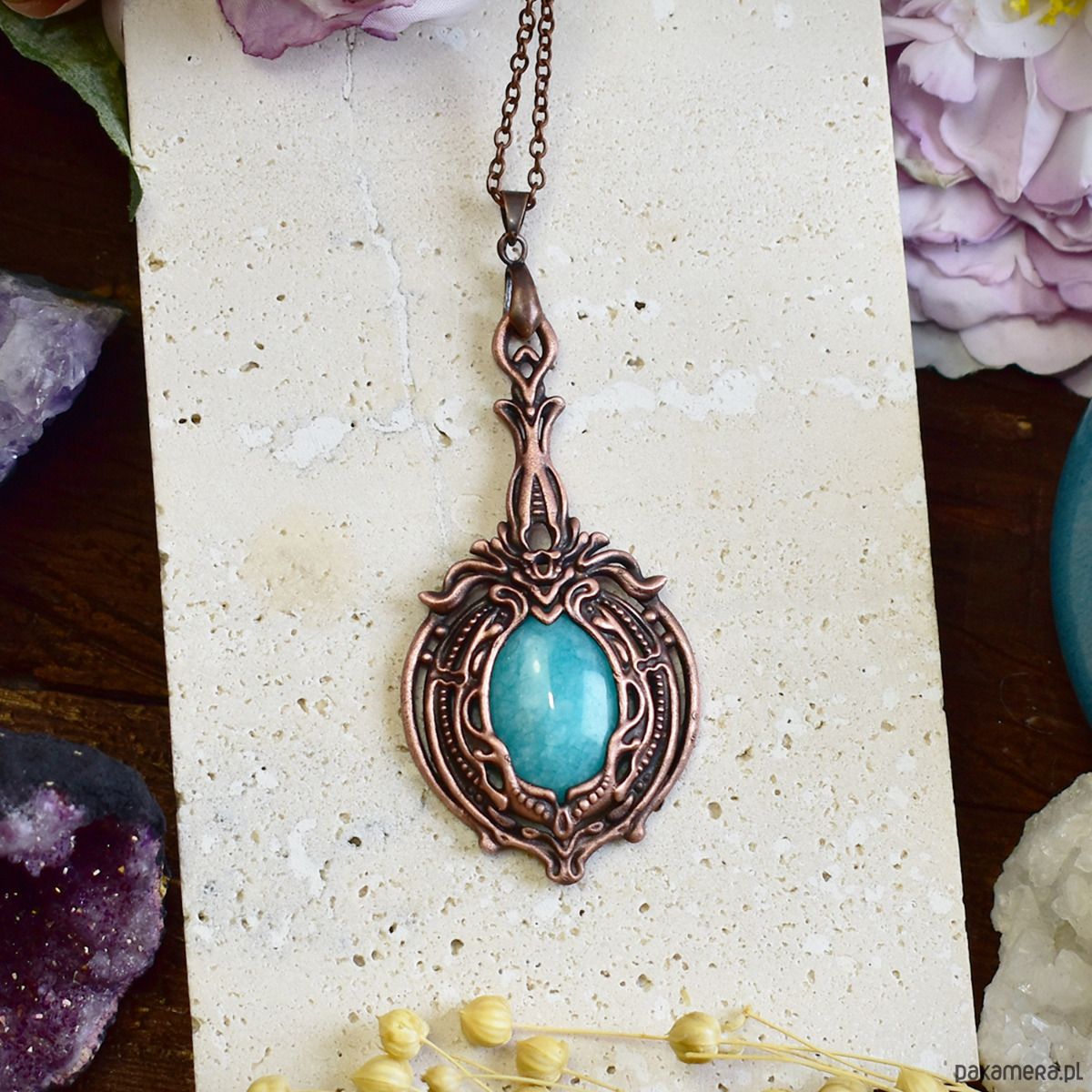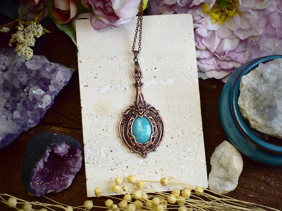 Wisiorek w stylu wiktoriańskim, wykonany z wykorzystaniem techniki elektroformowania, ozdobiony amazonitem i wykończony patyną, która nadaje mu głębi i szlachetnego, postarzanego charakteru. Delikatne detale i ornamentyka inspirowana XIX-wieczną estetyką przywodzą na myśl dawne amulety i biżuterię z epoki, w której symbolika i rzemiosło miały szczególne znaczenie. Amazonit, o swojej chłodnej, zielono-niebieskiej barwie, wprowadza do kompozycji nutę spokoju i harmonii, pięknie kontrastując z ciemniejszą, patynowaną powierzchnią metalu. Całość tworzy elegancki, nastrojowy wisiorek o wyraźnie historycznym charakterze, idealny dla osób ceniących biżuterię artystyczną, styl vintage oraz unikatowe formy inspirowane dawnymi epokami.