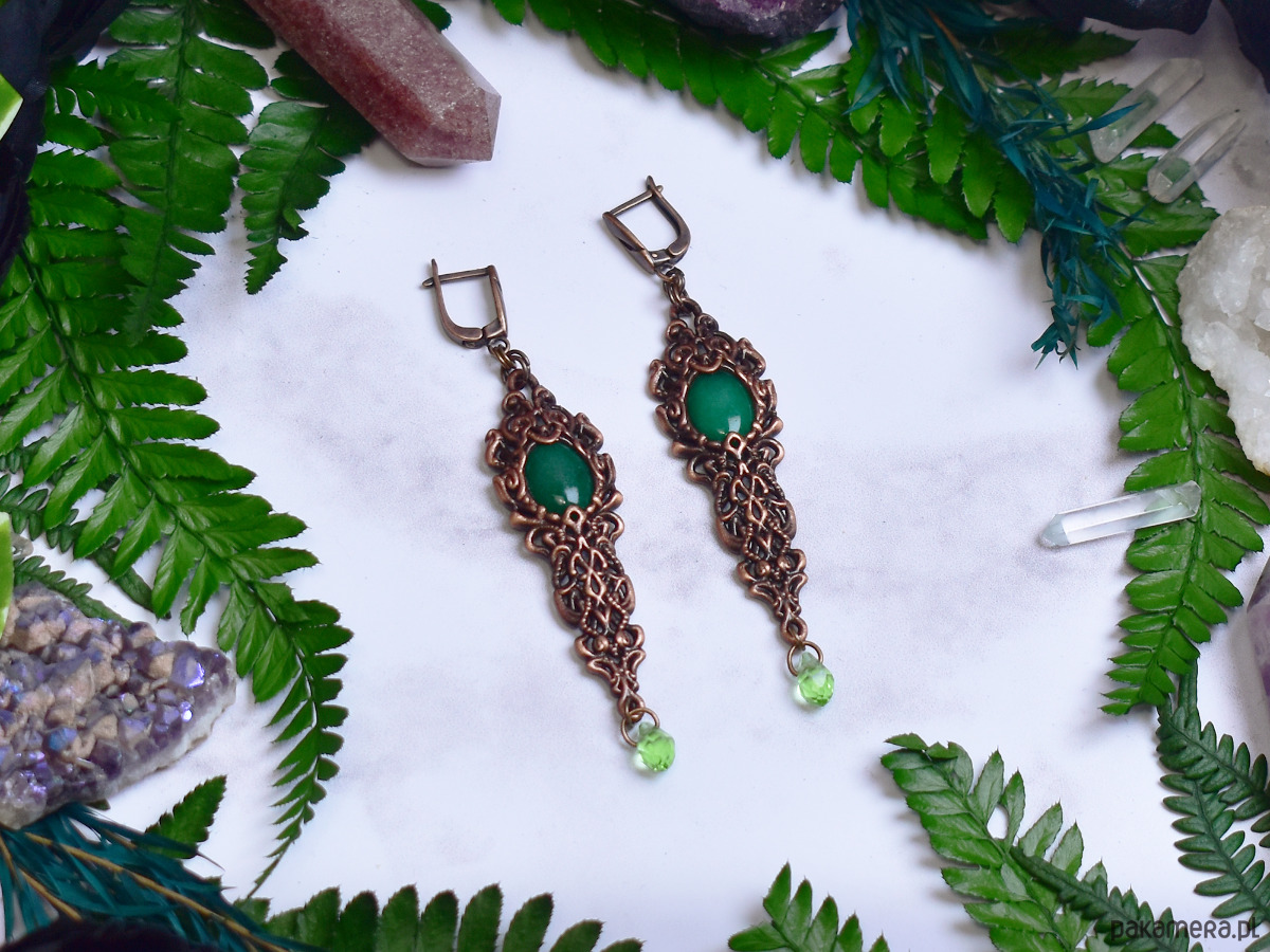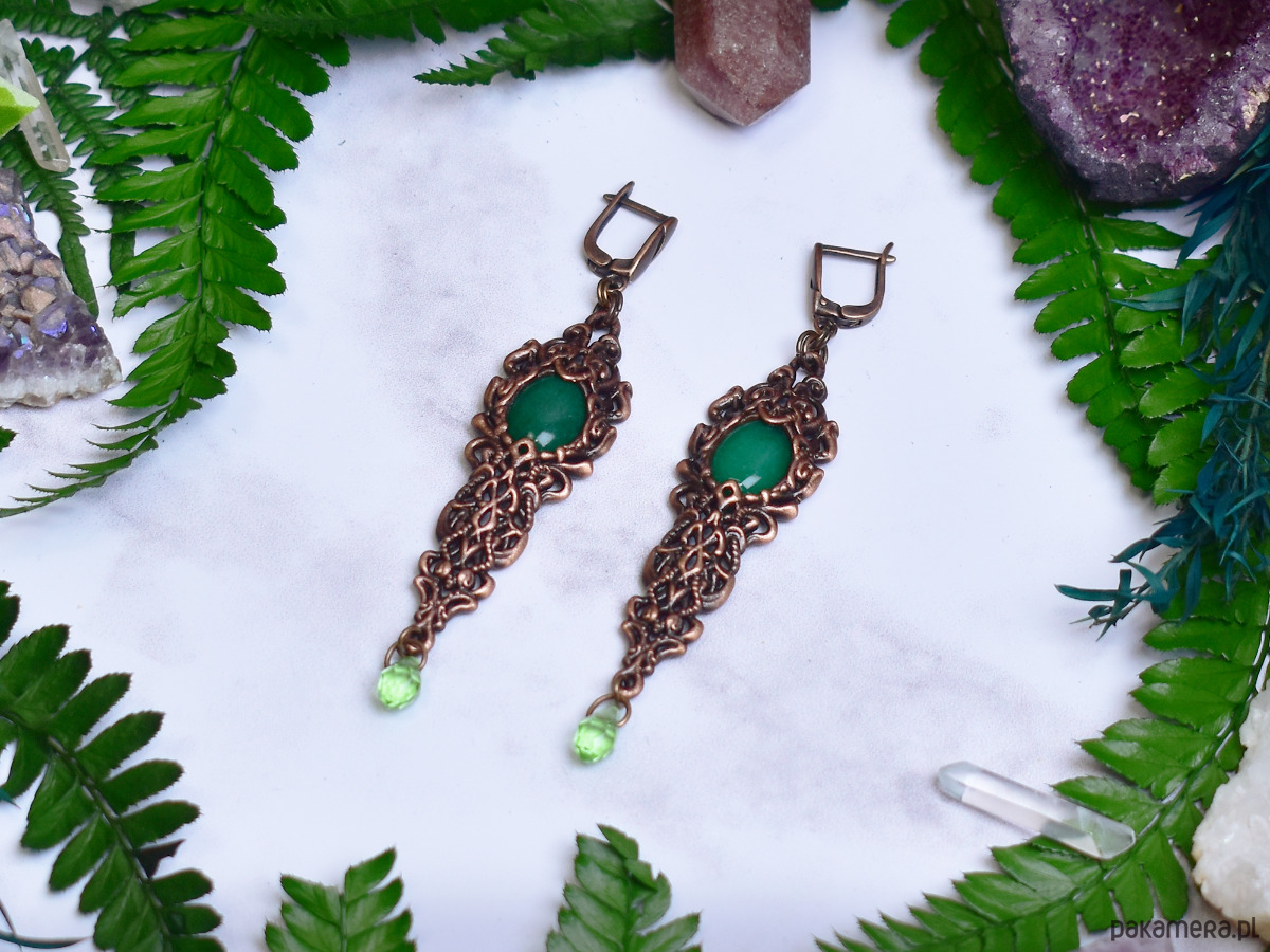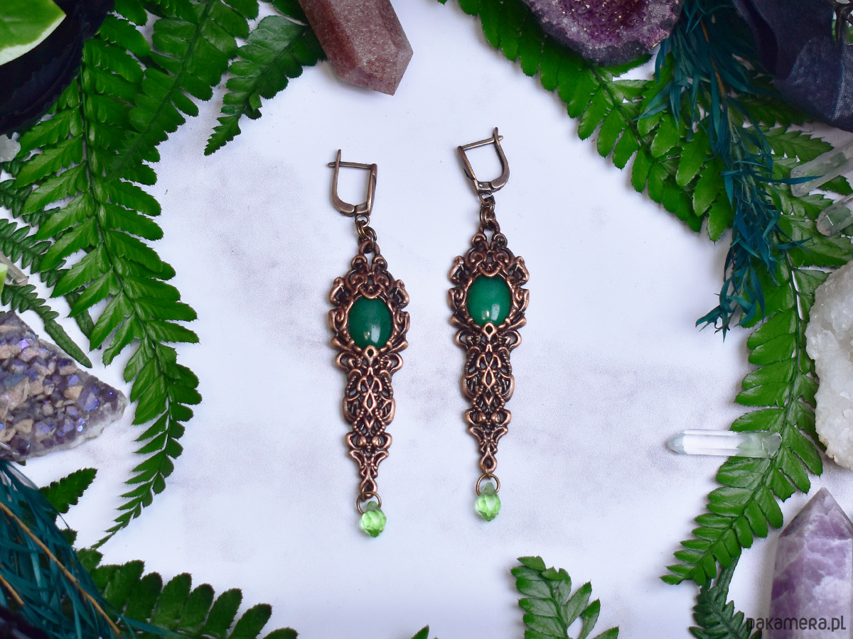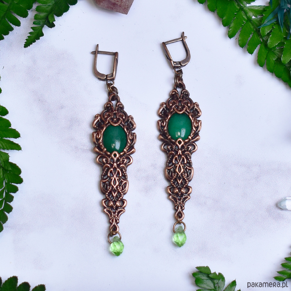 Miedziane kolczyki wykonane metodą elektroformowania, inspirowane wiktoriańskim stylem i dekoracyjną estetyką dawnych epok. Bogato zdobiona, ornamentalna oprawa o wydłużonej formie przyciąga uwagę misternymi detalami i nadaje kolczykom elegancki, szlachetny charakter. Centralnym elementem są kaboszony z zielonego jadeitu o spokojnej, naturalnej barwie, które wprowadzają do kompozycji świeżość i harmonię. Delikatne, ruchome akcenty w dolnej części kolczyków dodają lekkości i subtelnej dynamiki. Zielony jadeit kojarzony jest z równowagą i spokojem, a jego połączenie z ciepłym odcieniem miedzi tworzy biżuterię o ponadczasowym, wyrafinowanym wyrazie. Kolczyki będą doskonałym wyborem dla osób ceniących rękodzieło, historyczne inspiracje i elegancką biżuterię z naturalnymi kamieniami.