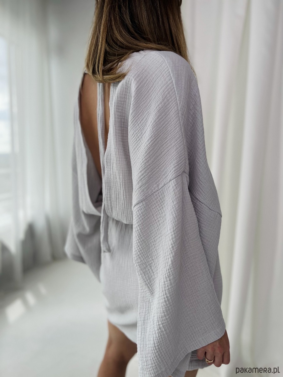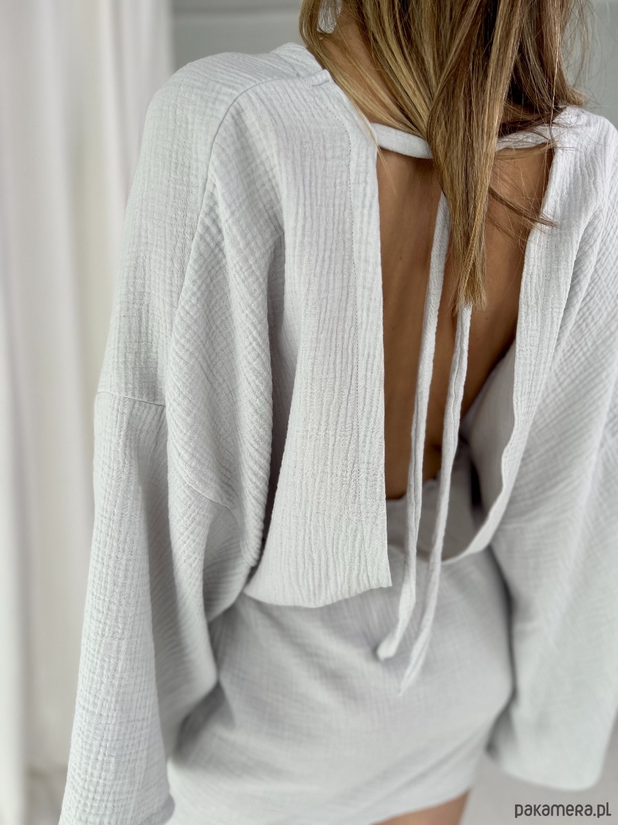 Zwiewna, delikatna. Jak mgiełka na ciele. Otwarte plecy i rozszerzane rękawy dodają jej wyrazu. Komfortowa, przewiewna, wykonana ze 100% bawełny.