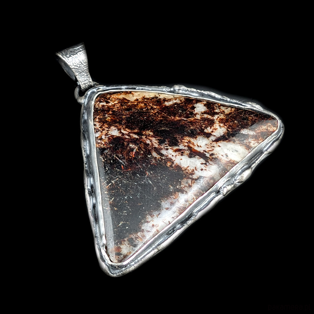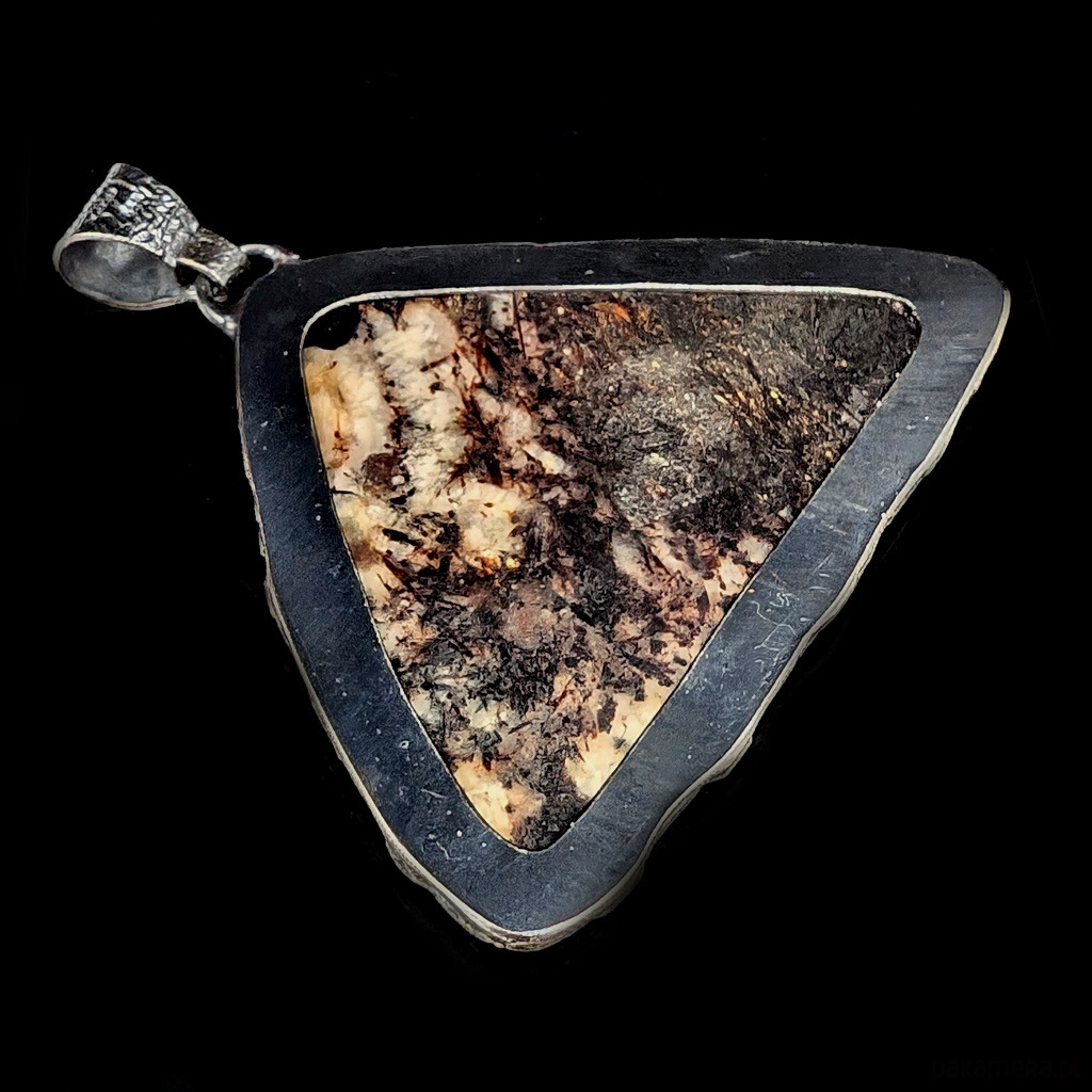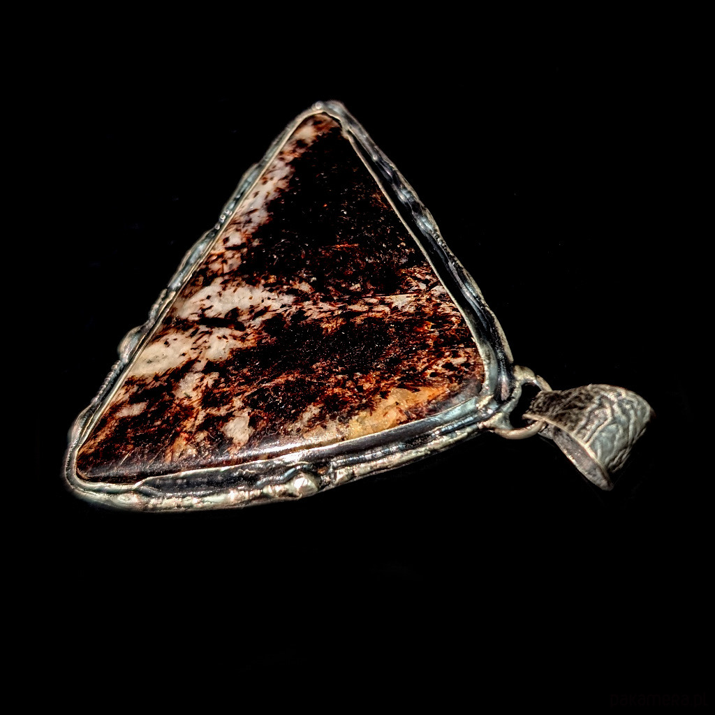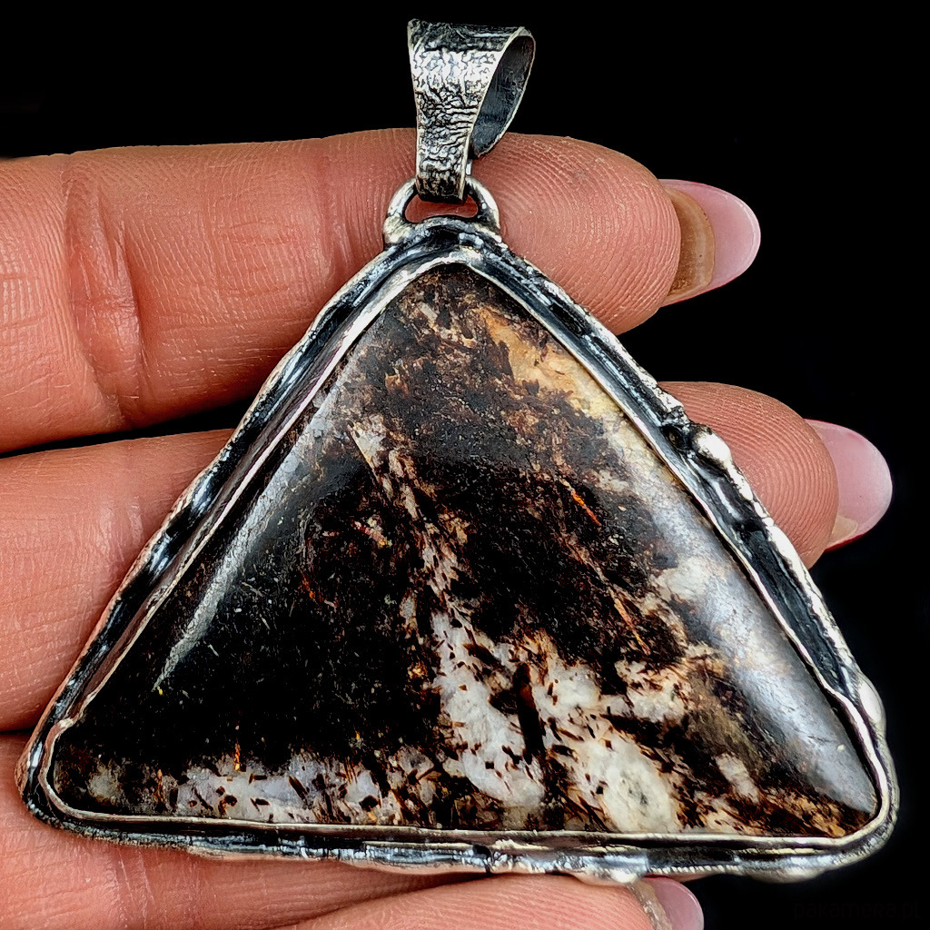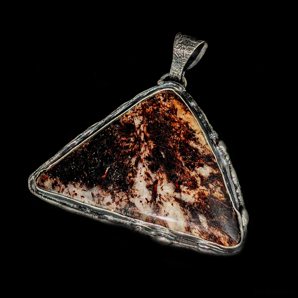 Zjawiskowy, naturalny astrofilit oprawiony w srebro pr. 925, oksydowane i mocno przecierane. Waga 21 gramów. Wymiary całej oprawy 53 x 40 mm. Z krawatką dłuość 56 mm. Powierzchnia kamienia o ciekawej strukturze, miejscami ze złocistymi i czerwonymi igłami minerałów. Niezwykłe zjawisko,nie do ukazania na zdjęciu.