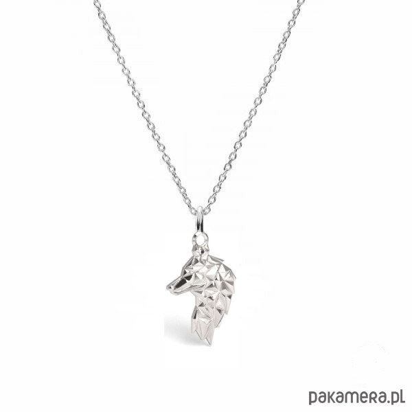 Naszyjnik z geometryczną trójwymiarową zawieszką w kształcie wilka.