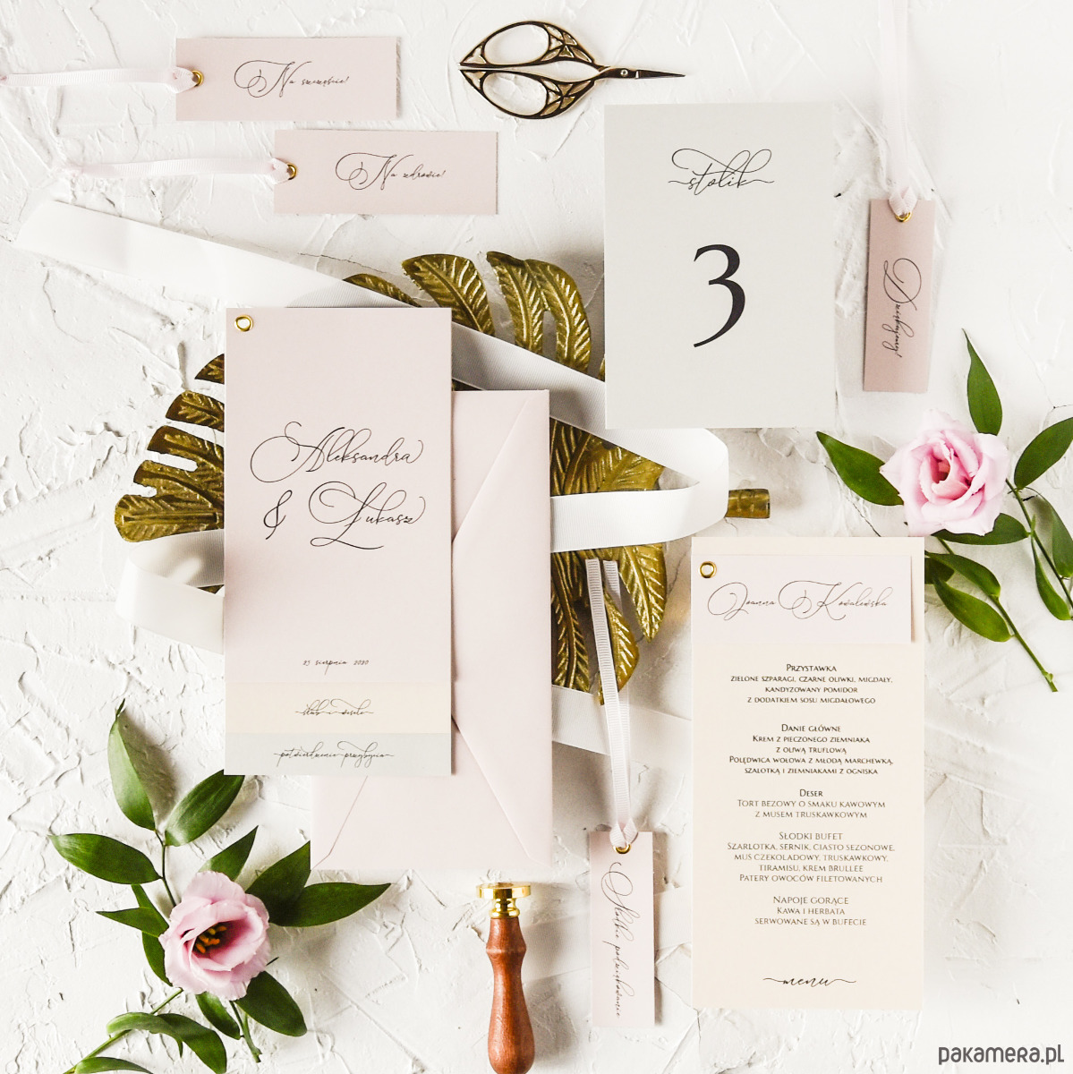 Do wykonania papeterii wykorzystany został ekologiczny papier o gramaturze 210g w dwóch idealnie współgrających ze sobą, pastelowych kolorach.