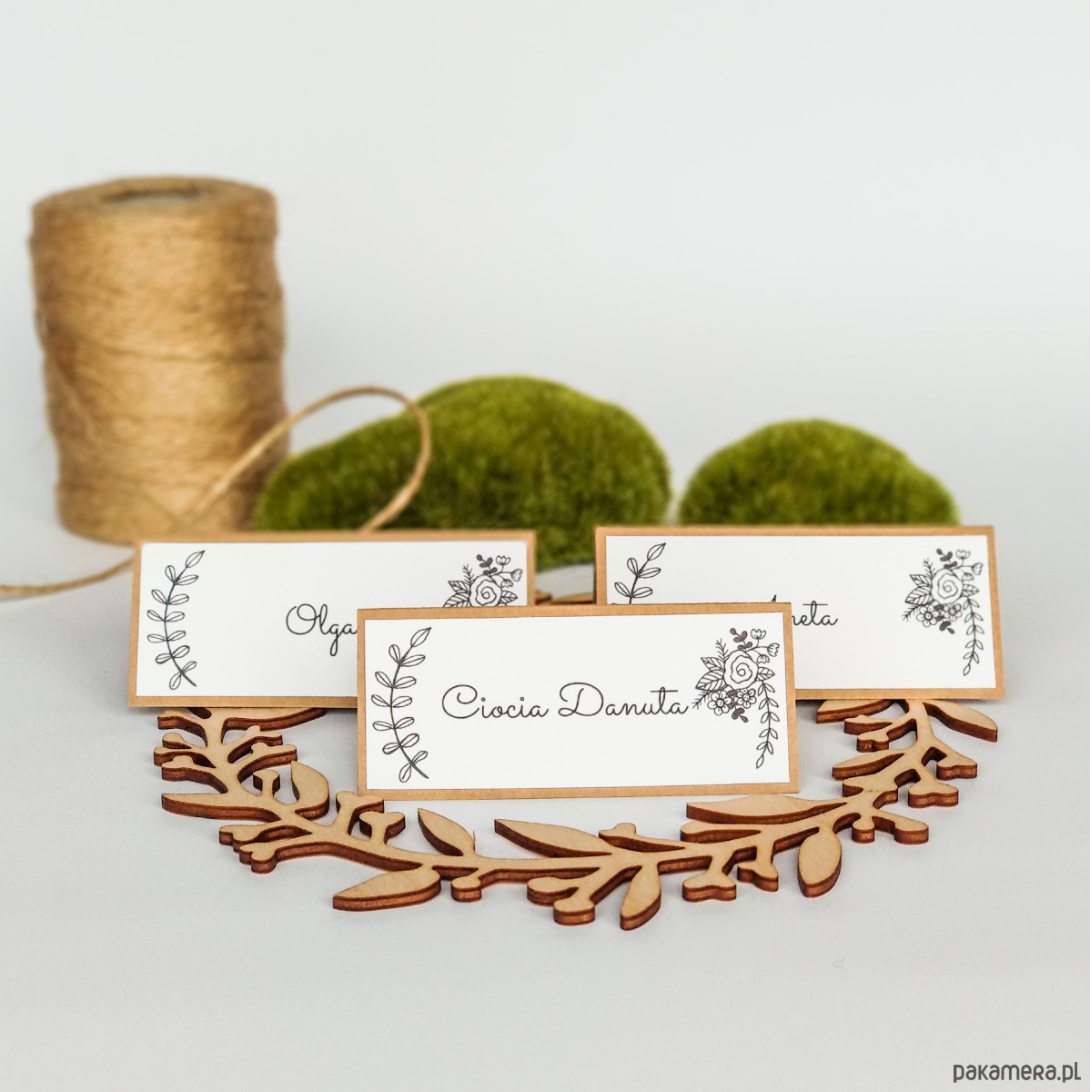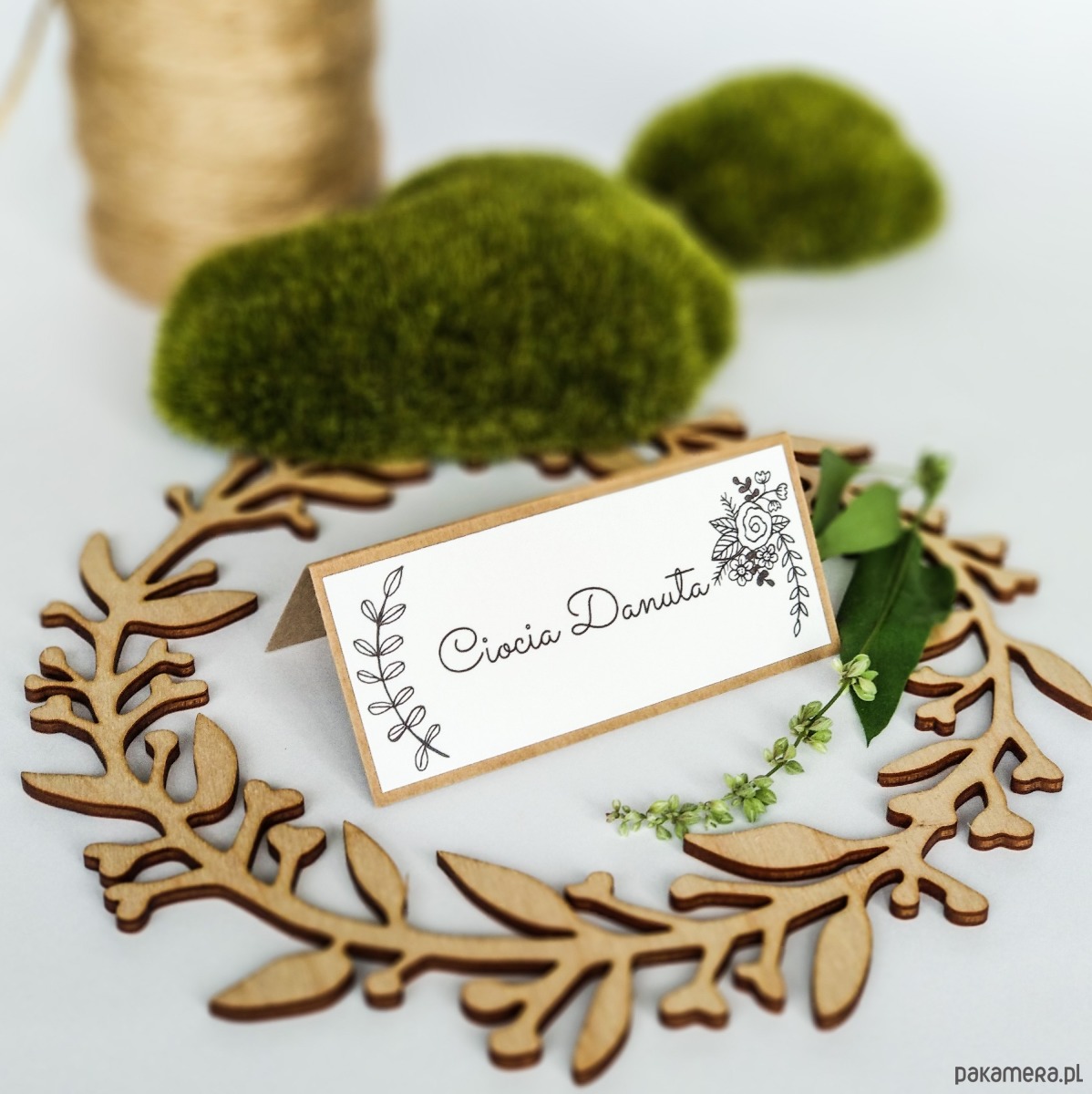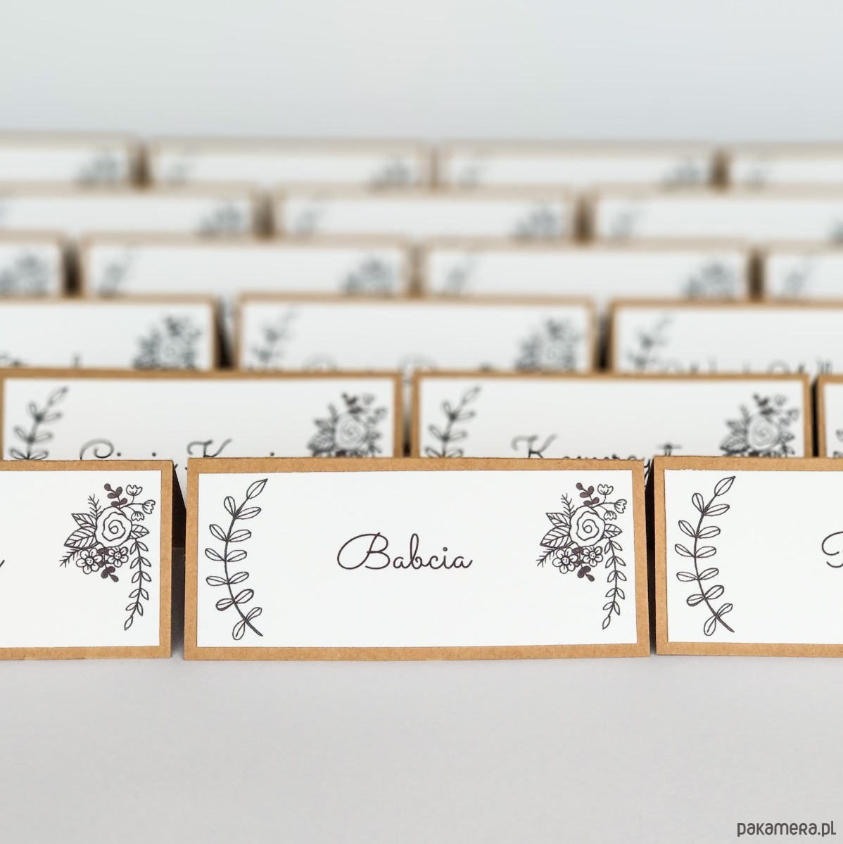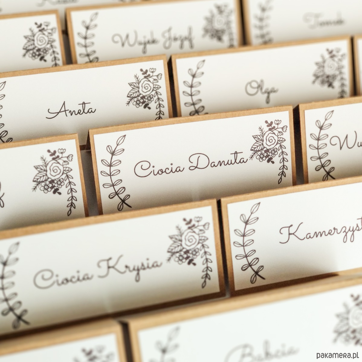 Minimalistyczne winietki wykonane z brazowego papieru ekologicznego z motywem ręcznie malowanych kwiatów.