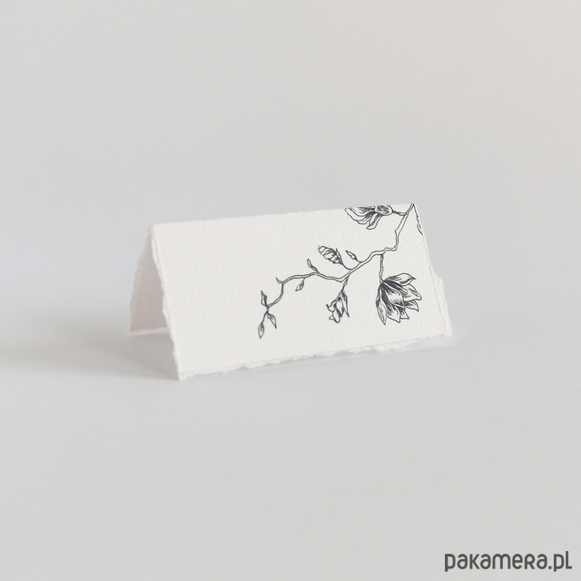Przepiękny kaligraficzny font i delikatnie fakturowany papier w połączeniu z ręcznie strzępionymi brzegami daje niebanalny efekt.