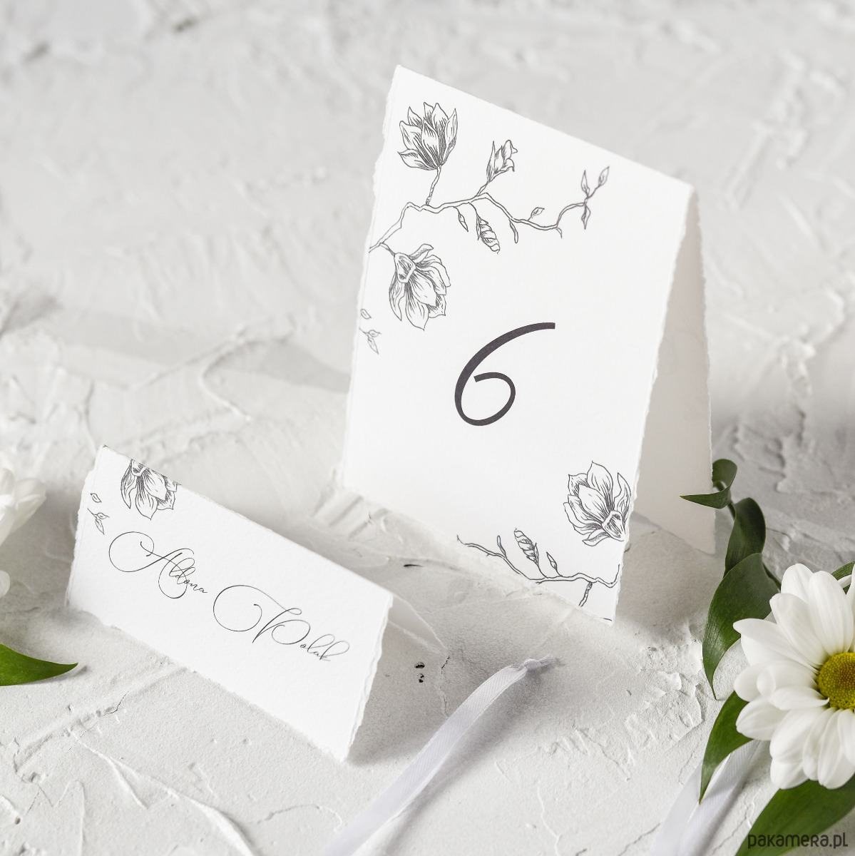 Winietki ślubne z motywem ręcznie malowanej gałązki magnolii.