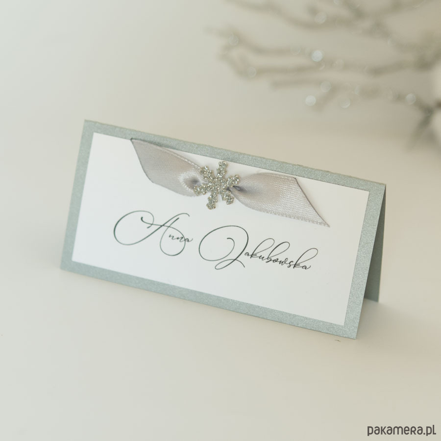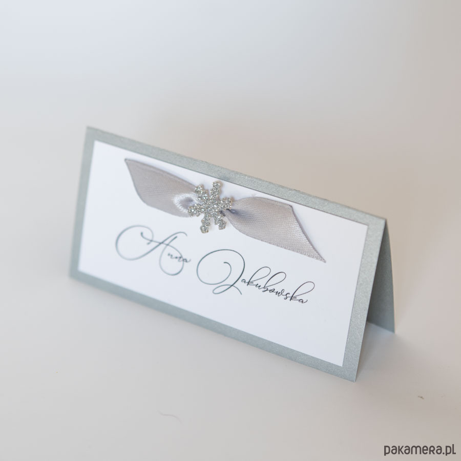 Winietki powstały z pięknego srebrnego kartonu o metalicznym połysku, wydruk ozdobiony jest satynową tasiemką i błyszczącą śnieżynką