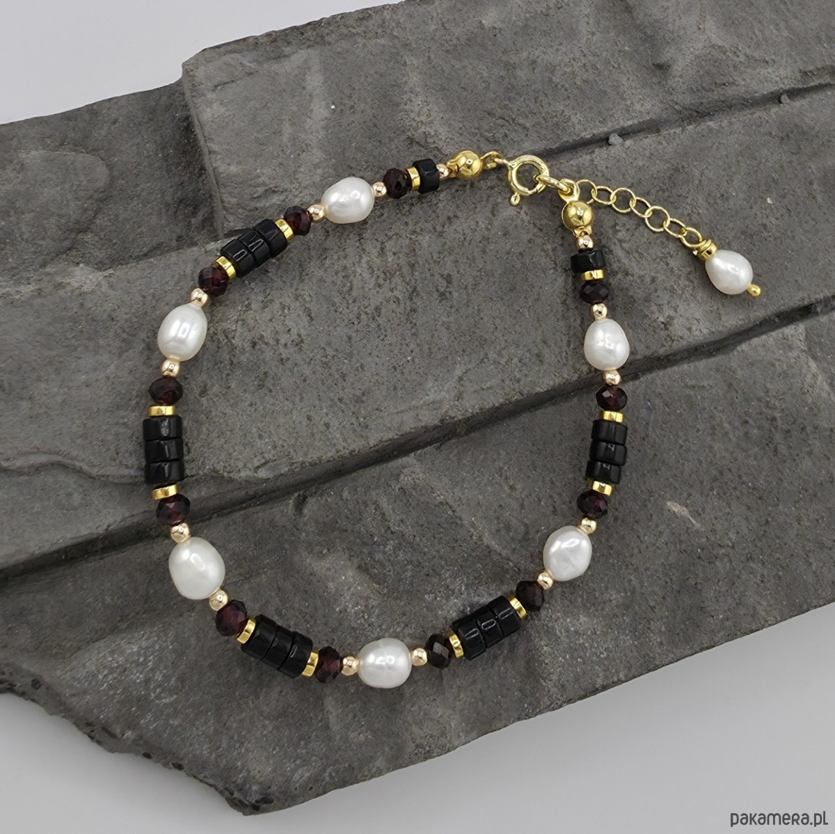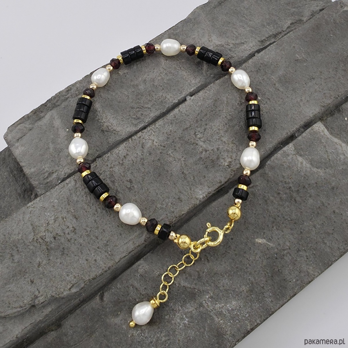 Delikatna, kobieca i wyjątkowa bransoletka na co dzień i nie tylko. Wykonana w całości z pozlacanego srebra próby 925, pereł słodkowodnych wielkości ok. 6 mm, krążków granatu i onyksu oraz oponek zlotego pirytu. Całkowita długość bransoletki regulowana w zakresie 18,5 cm - 20 cm. W mojej galerii kolczyki do kompletu. Ozdobnie zapakowana.