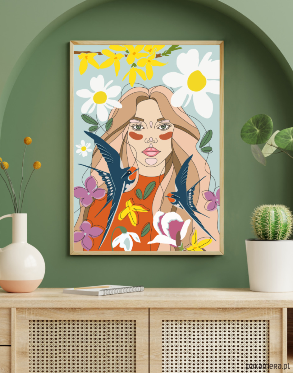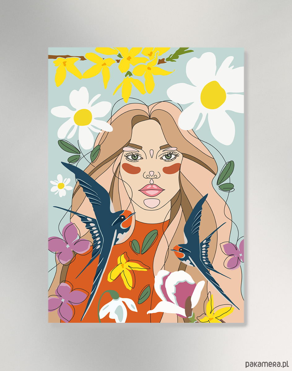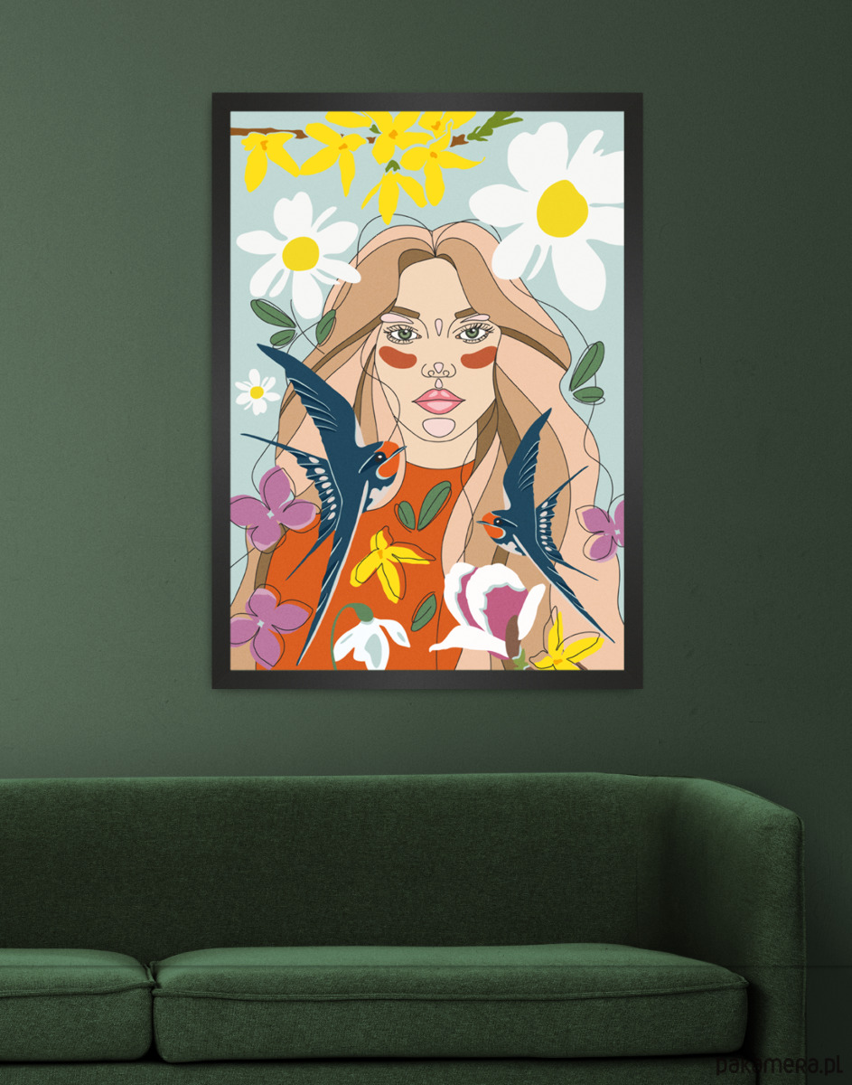 Ilustracja "Wiosna - uosobienie". To autorska grafika, która łączy w sobie młodość, piękno, świeżość, a także bogatą kolorystykę. Elementy te świetnie zaprezentują się zarówno w nowoczesnych jak i klasycznych wnętrzach. Ponadto dzięki możliwości wyboru aż trzech formatów plakat idealnie dopasuje się do dostępnej przestrzeni. Wydruk na wysokiej jakości papierze kredowym 250 g, wykończenie matowe. Sygnowany.
