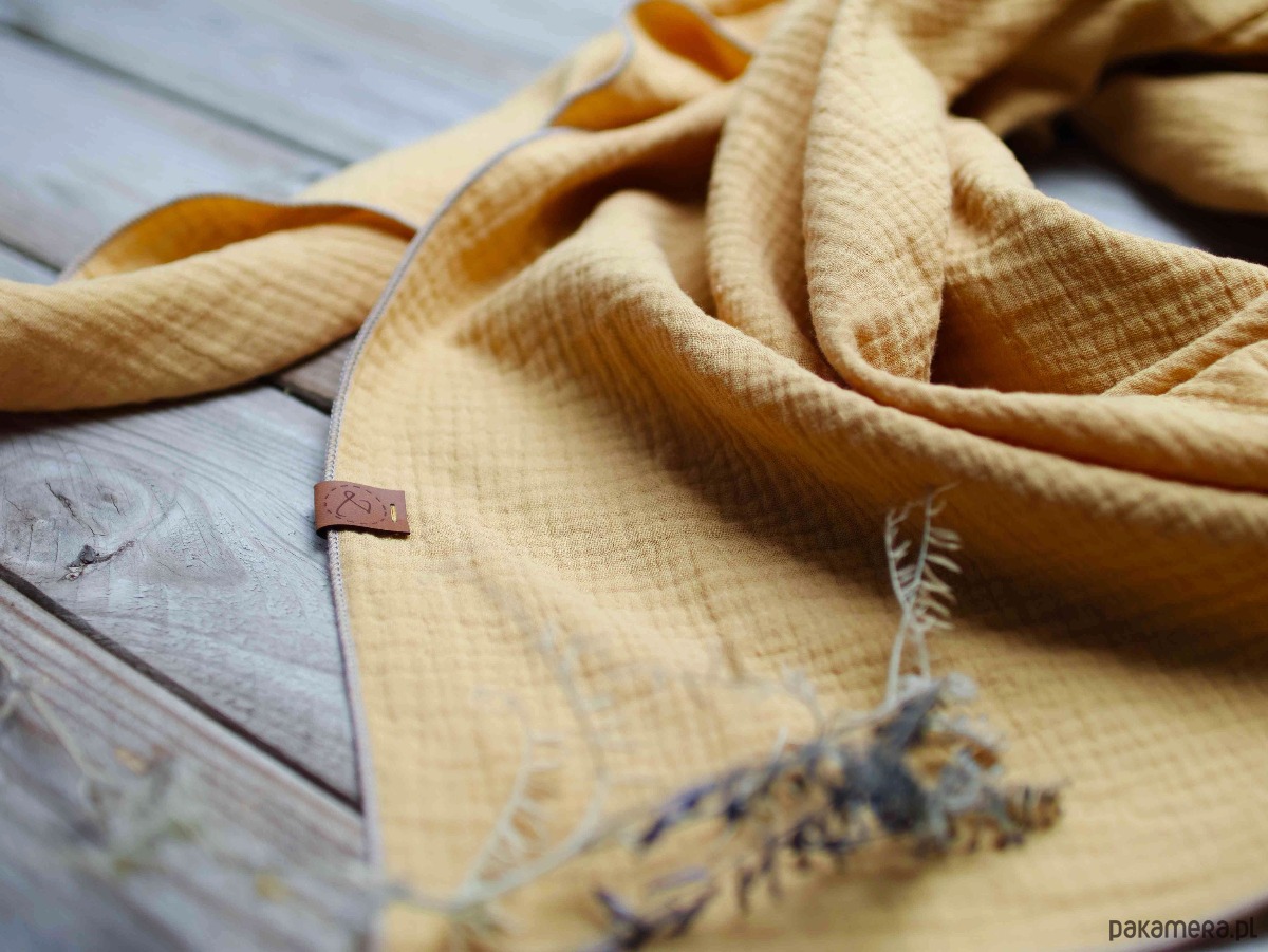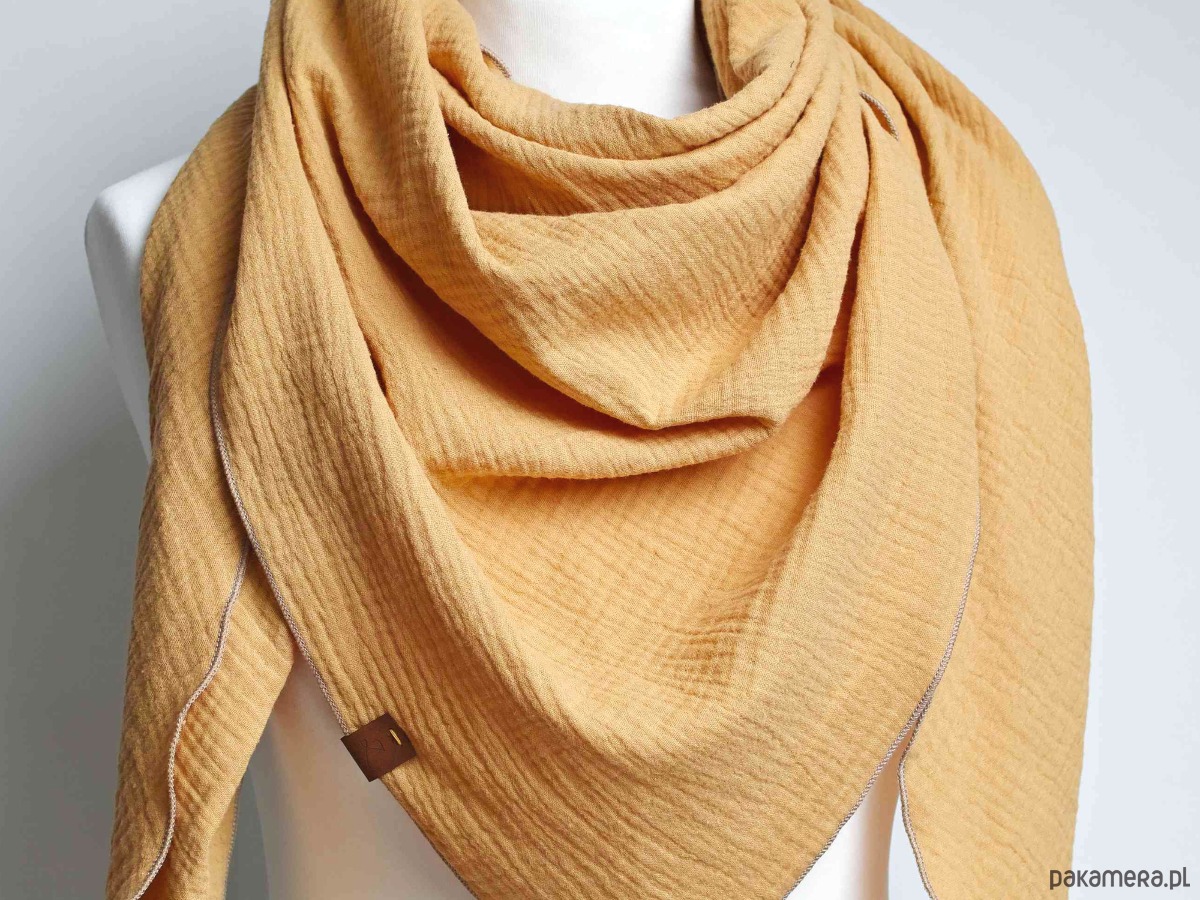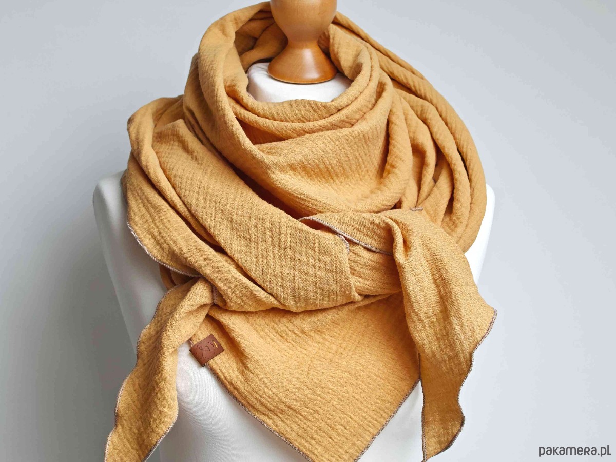 Miękka, lekka i niezwykle przyjemna w dotyku chusta damska z bawełnianego muślinu w modnym kolorze miodowym/żółtym. Naturalna tkanina jest delikatna dla skóry, oddychająca i idealna na każdą porę roku — sprawdzi się zarówno wiosną i latem, jak i jako lekka osłona jesienią.