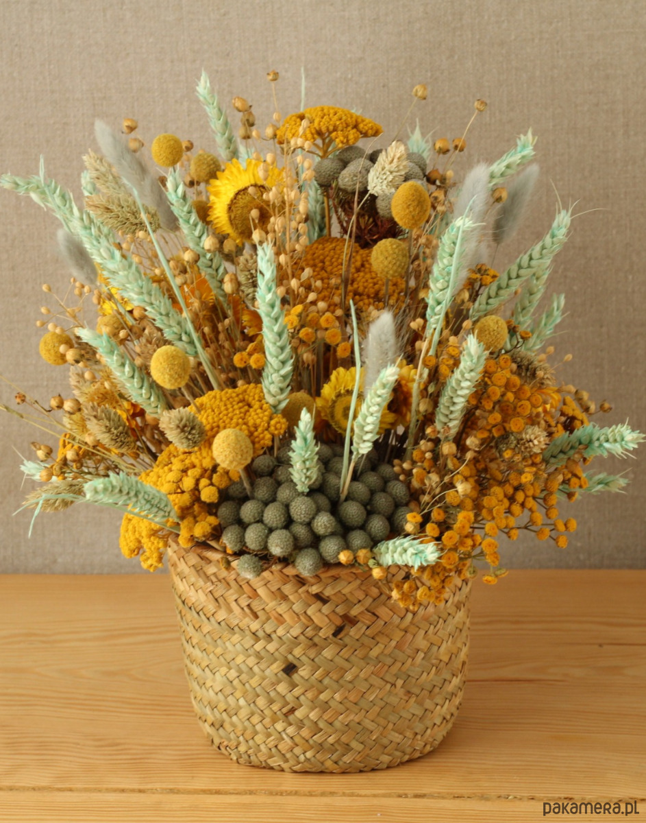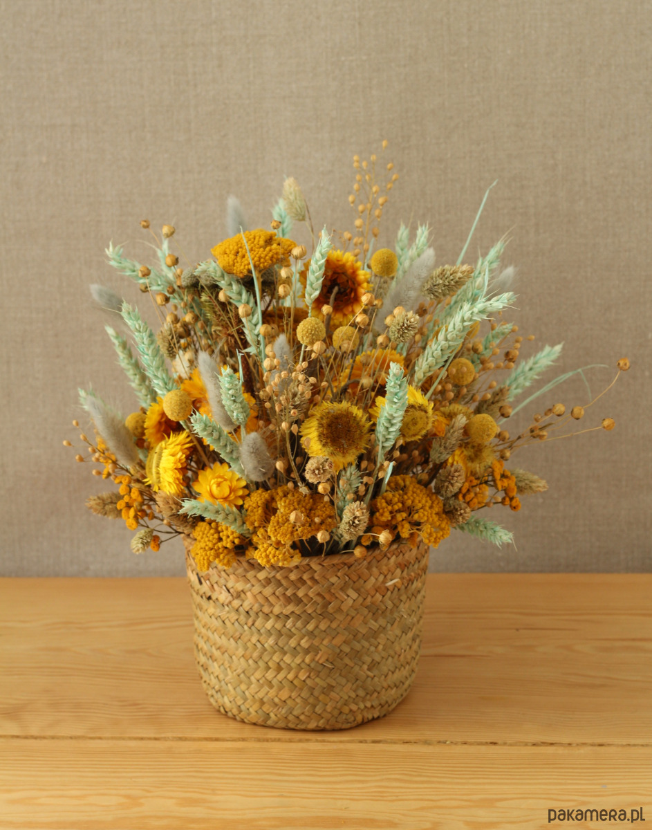Wiosenna kompozycja w pogodnych barwach. Zrobiona z suszonych kwiatów w koszyku z trawy morskiej.