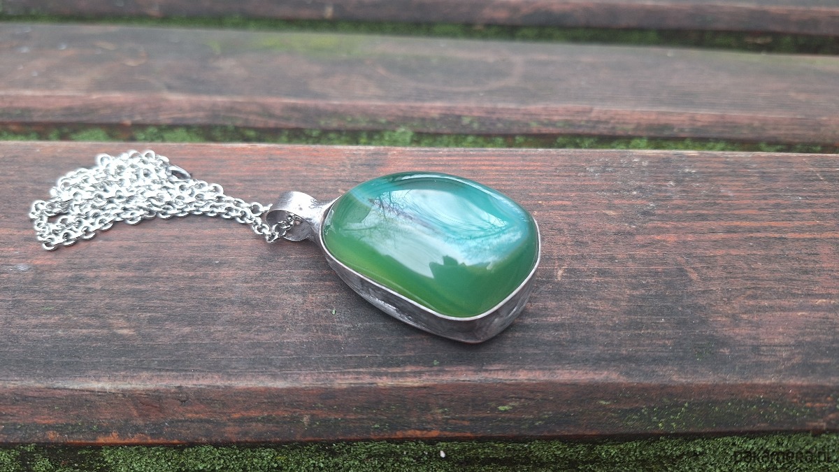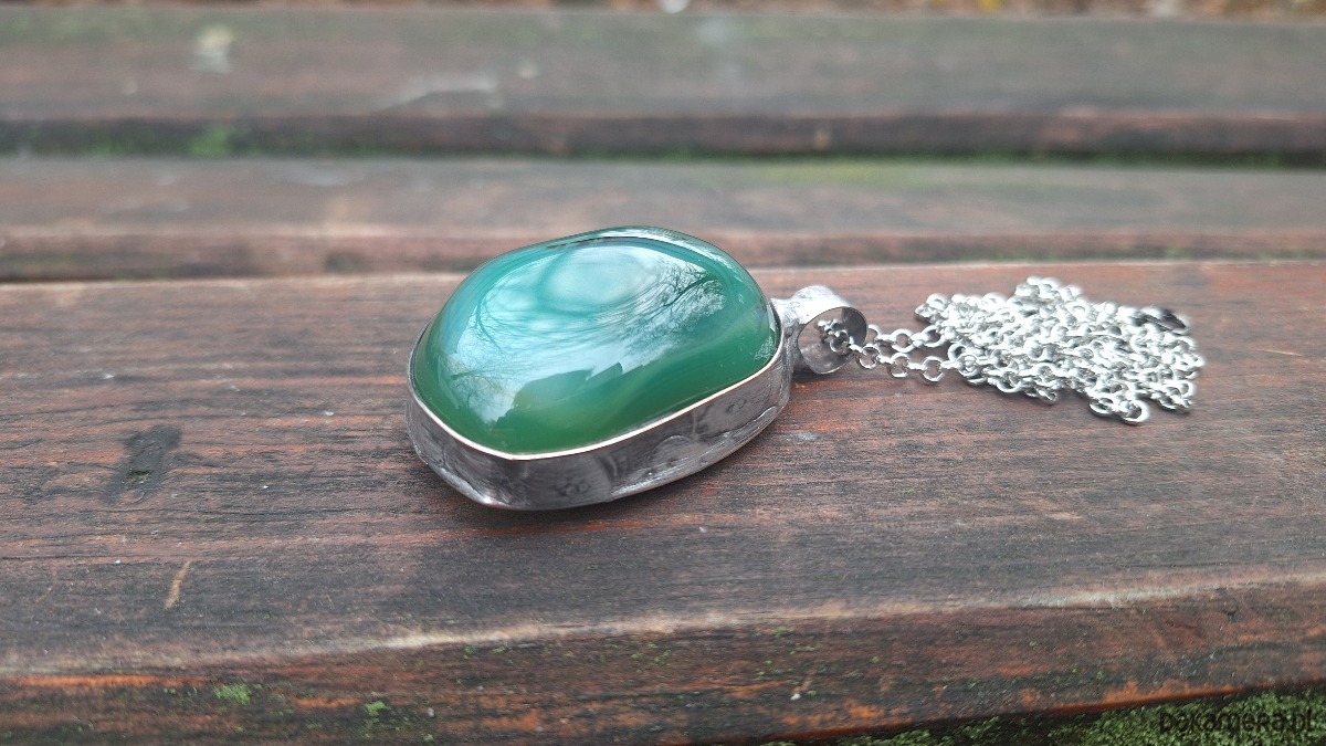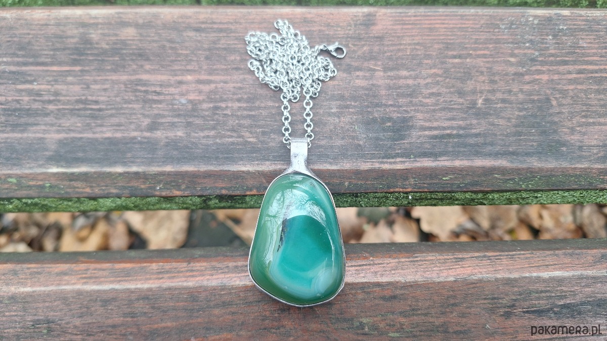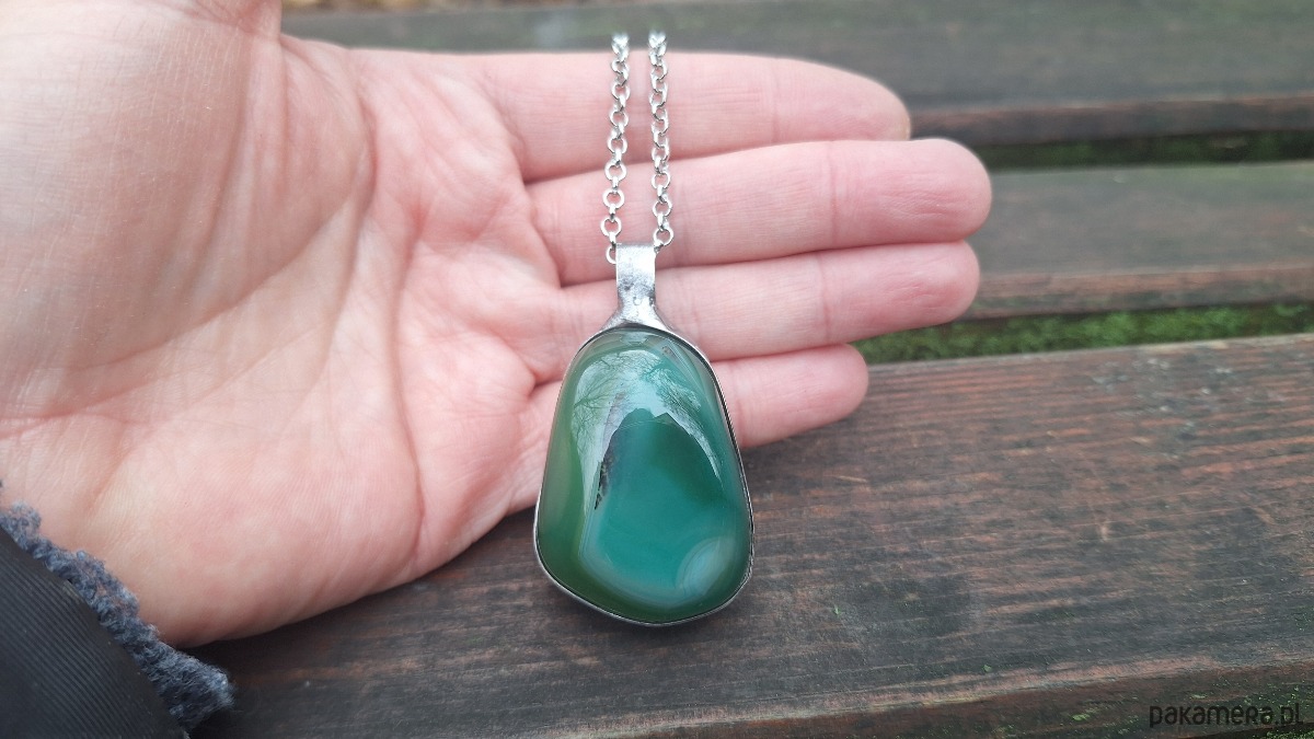Wisiorek wykonany z miedzi, cyny i agatu. Wymiary ok. 4.5 na 3 cm. Zawieszony na łańcuszku o długości ok. 50 cm.