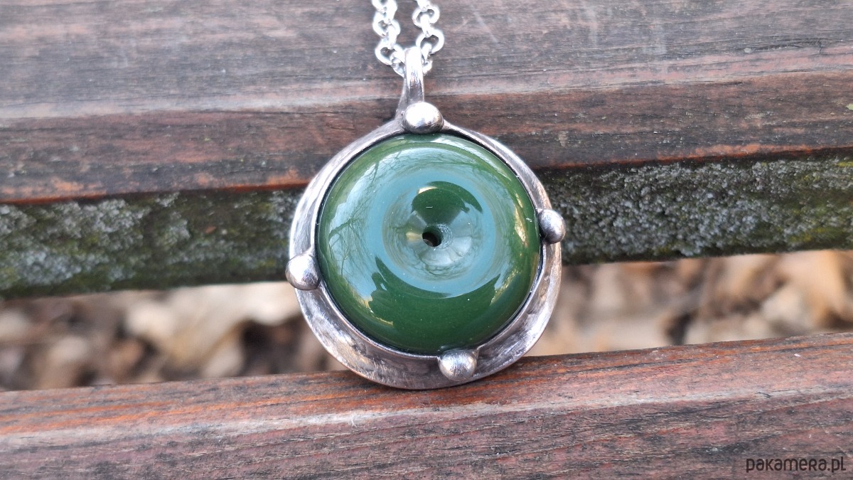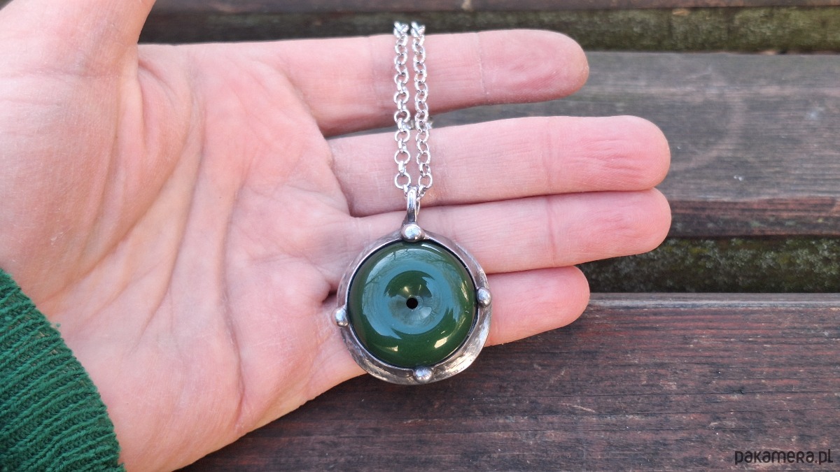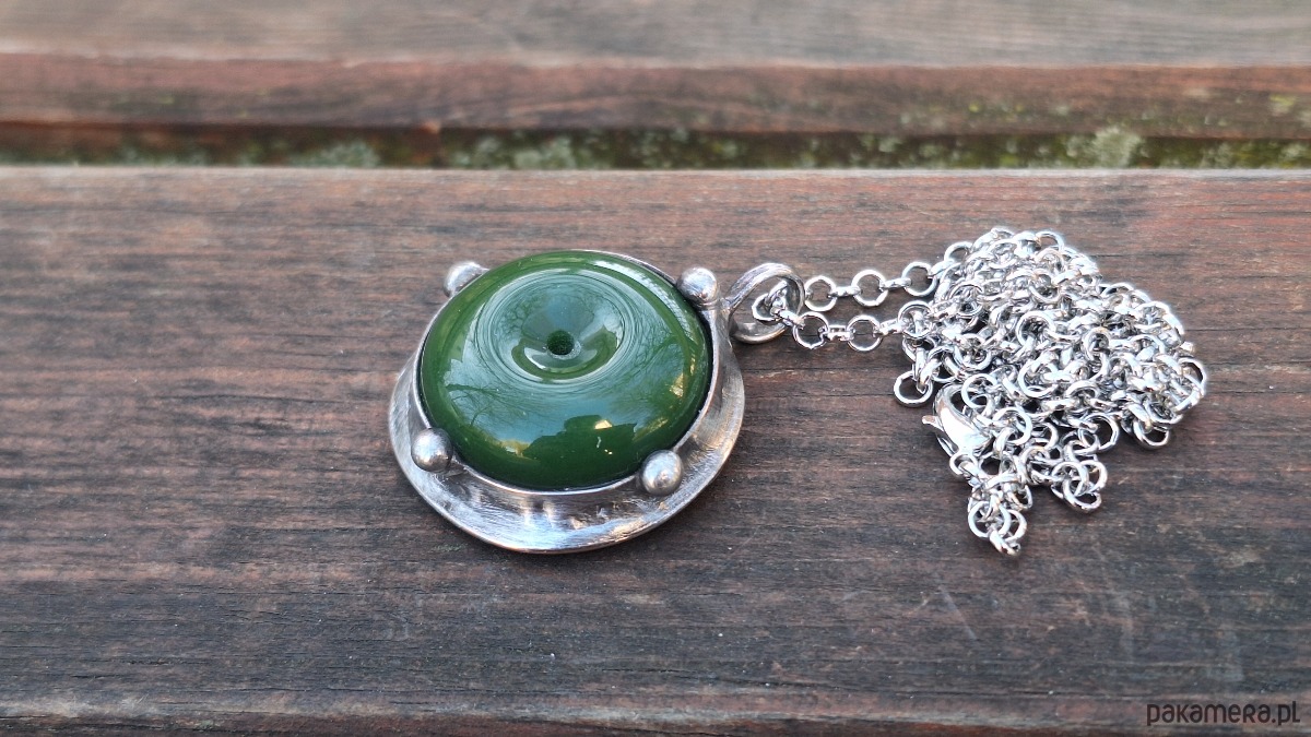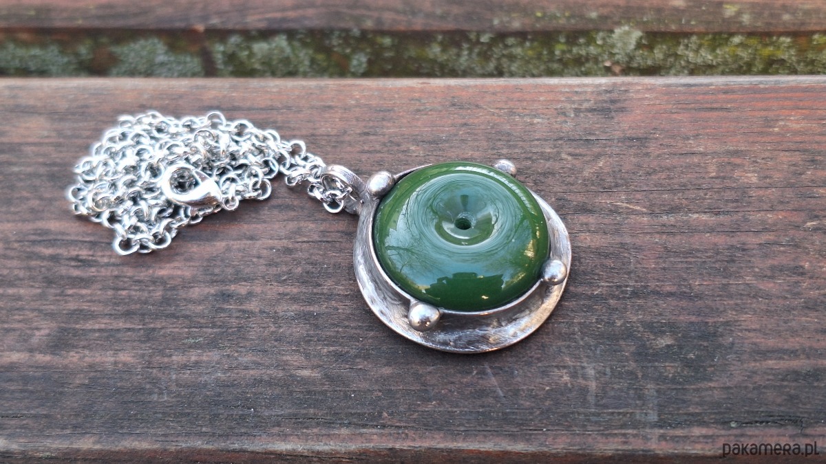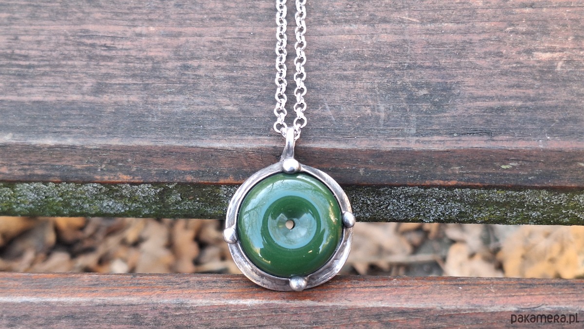 Wisiorek wykonany z miedzi, cyny i jadeitu. Wymiary ok. 3 na 3 cm. Zawieszony na łańcuszku o długości ok. 50 cm.