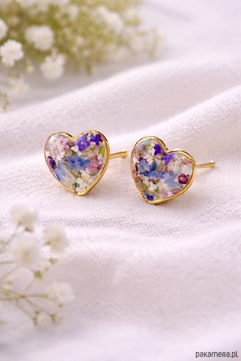 Wyjątkowe kolczyki w kształcie serca, w których zatrzymano piękno natury. W transparentnej, krystalicznej żywicy zostały zatopione starannie wyselekcjonowane, różnokolorowe kwiaty – subtelne odcienie błękitu, fioletu, pudrowego różu i bieli tworzą harmonijną, artystyczną kompozycję. Każda para to małe dzieło sztuki – niepowtarzalne i jedyne w swoim rodzaju.