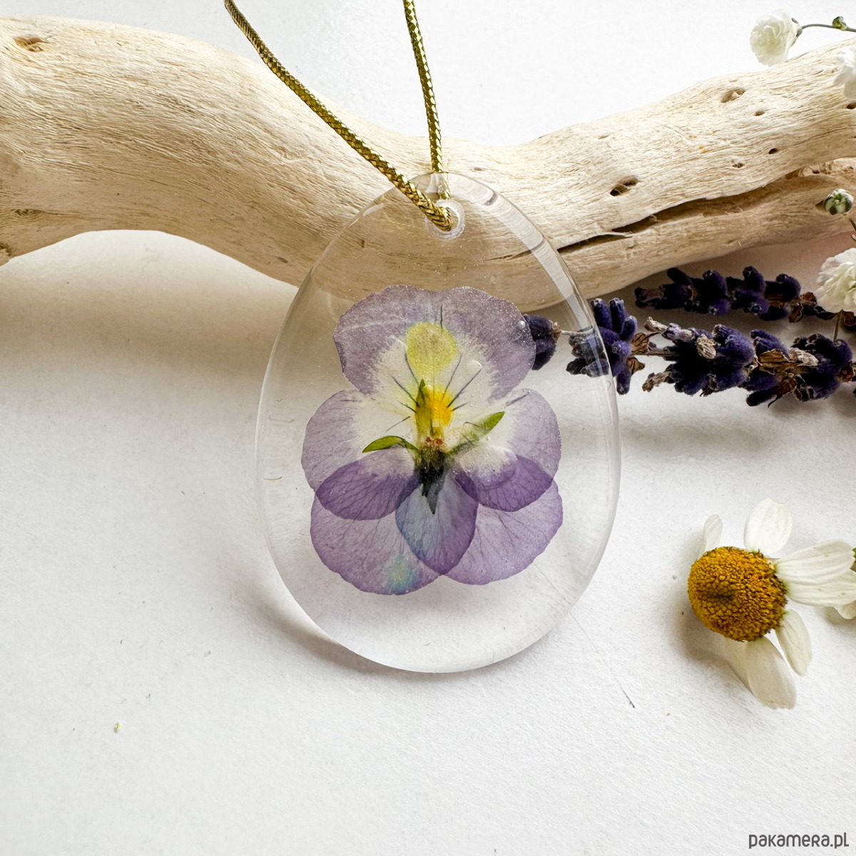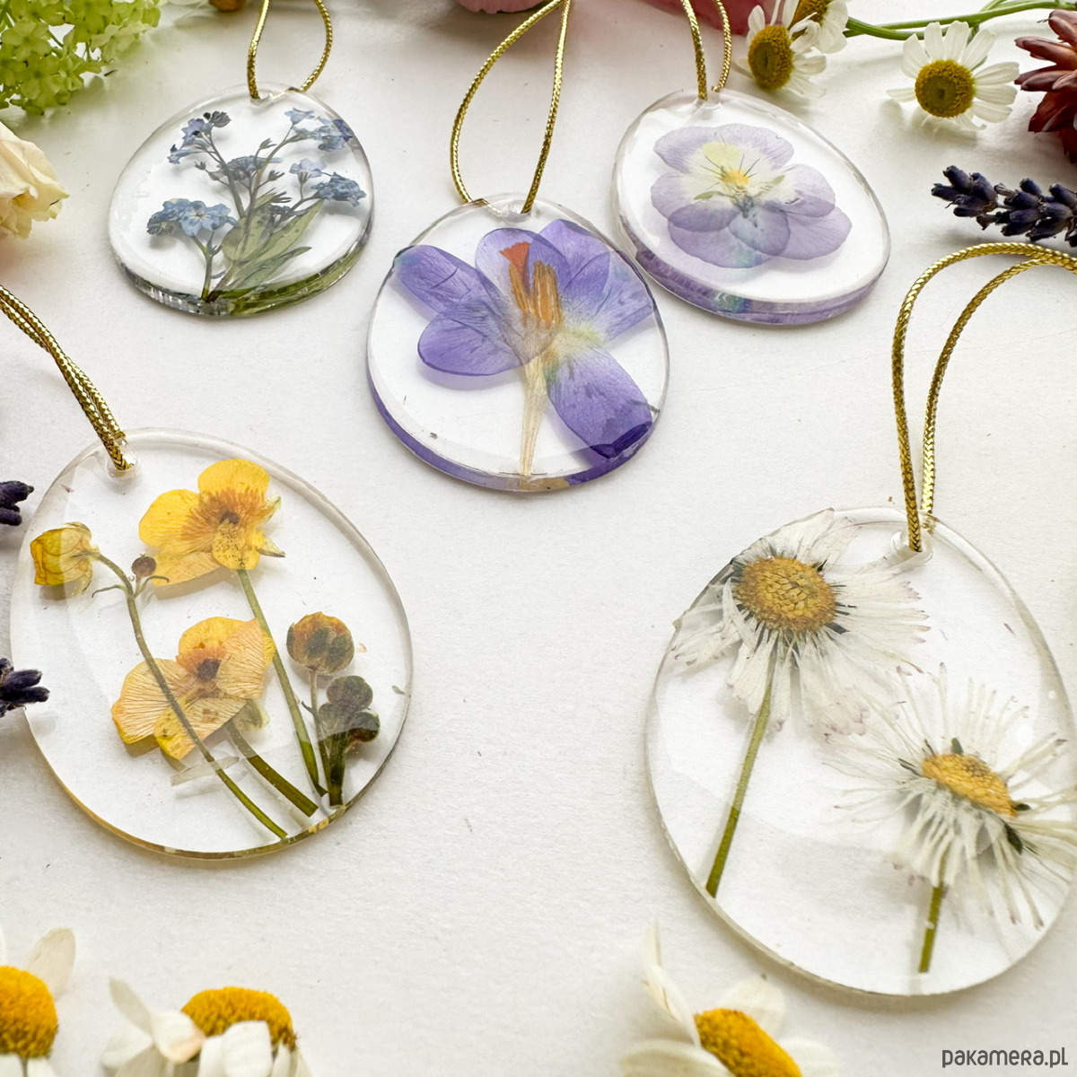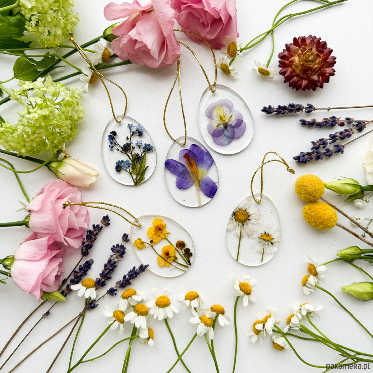 Niepowtarzalne, ręcznie robione zawieszki wielkanocne z pokrytymi żywicą suszonymi kwiatami. Zestaw zawiera 5 sztuk jajeczek na sznurku wykonanych z pleksi (zatem nie da się ich stłuc). Każda ozdoba ma wys 5cm.