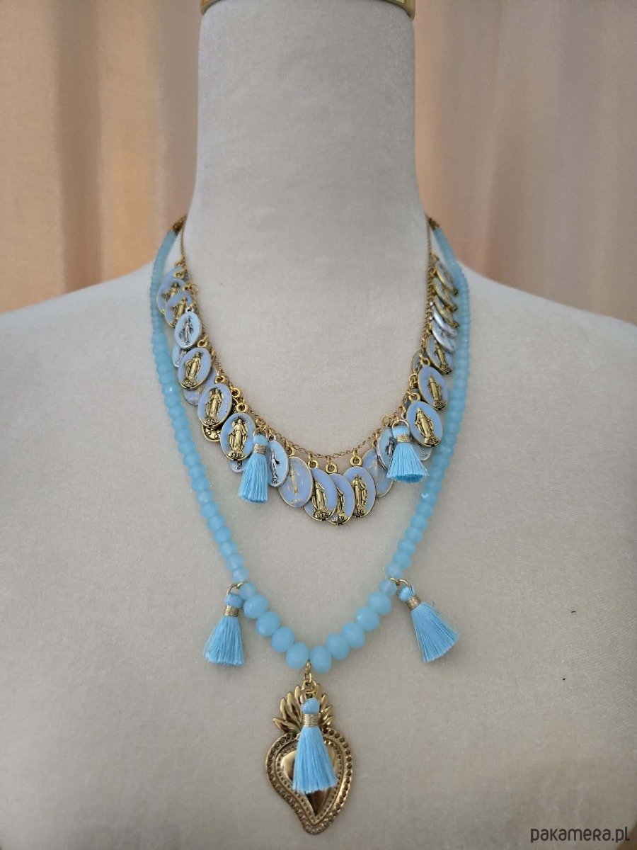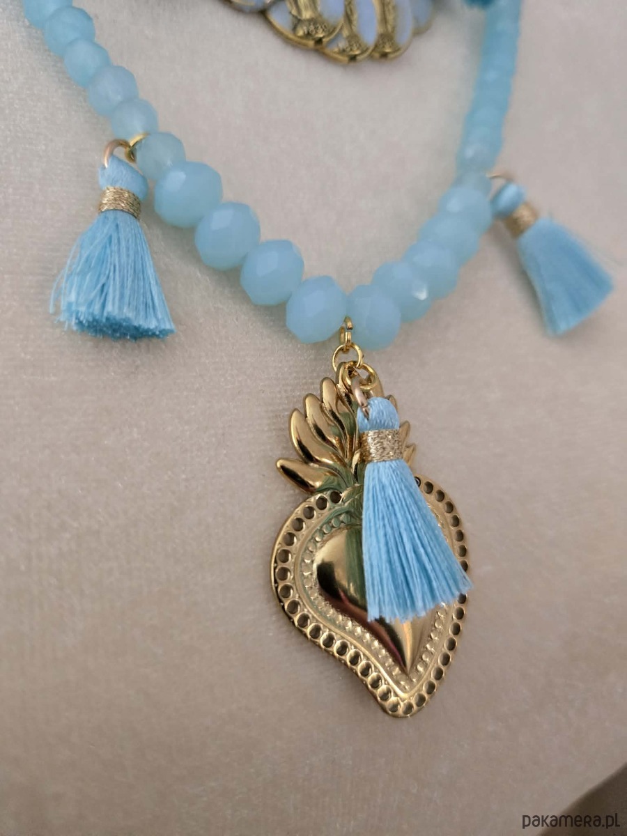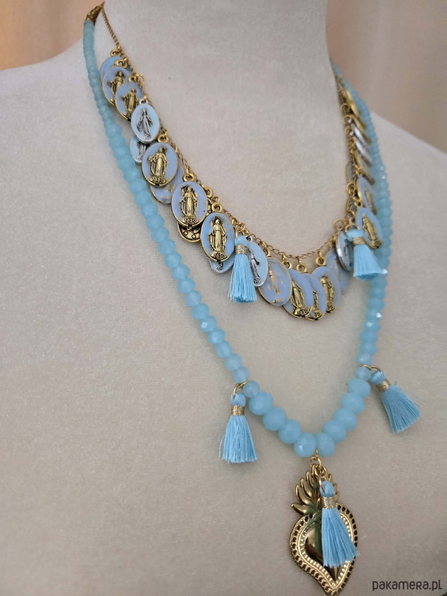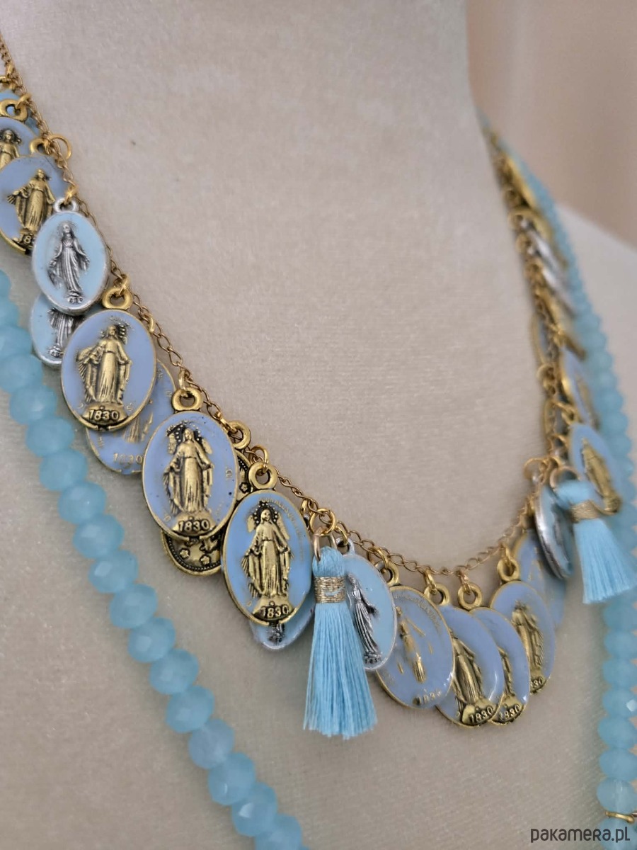 Naszyjnik zachwyca lekkością, został utkany z letnich odcieni nieba i morskiej bryzy tworząc harmonijna linie. Centralnym akcentem sa ręcznie malowane medaliki - każdy z nich to małe dzieło sztuki, utrzymane w różnych tonacjach błękitu, ich złote obramowanie pięknie kontrastuje z chłodna paleta barw .