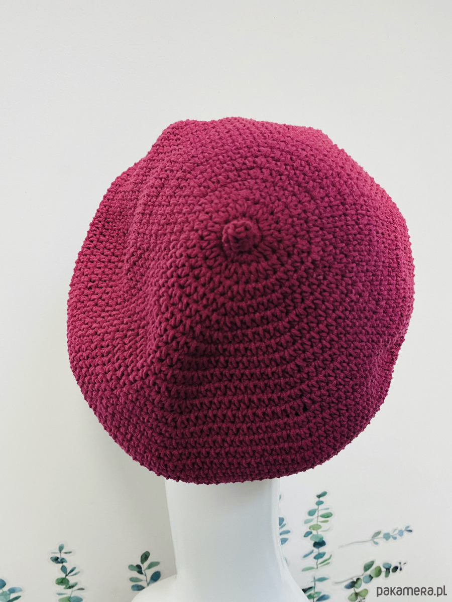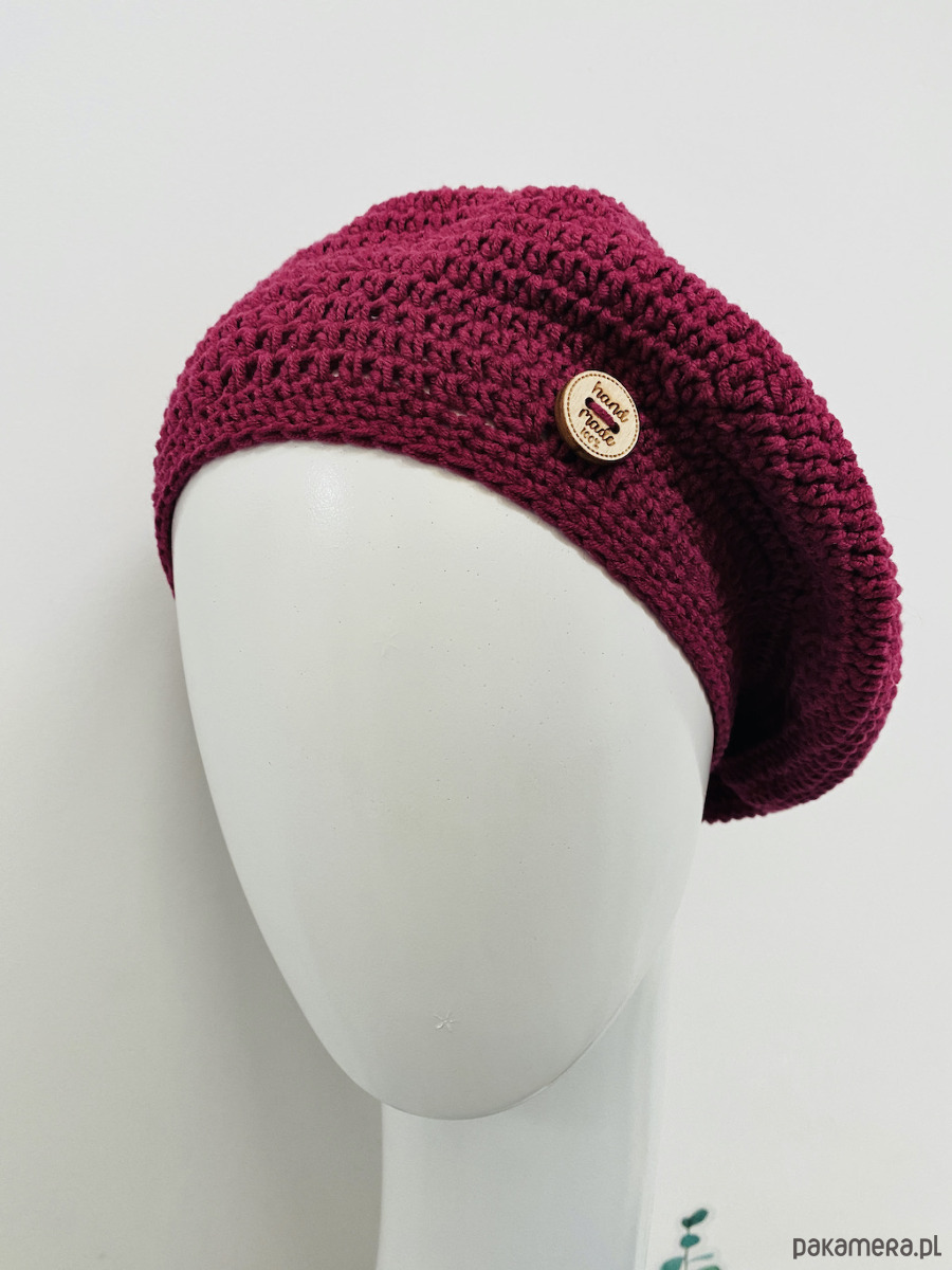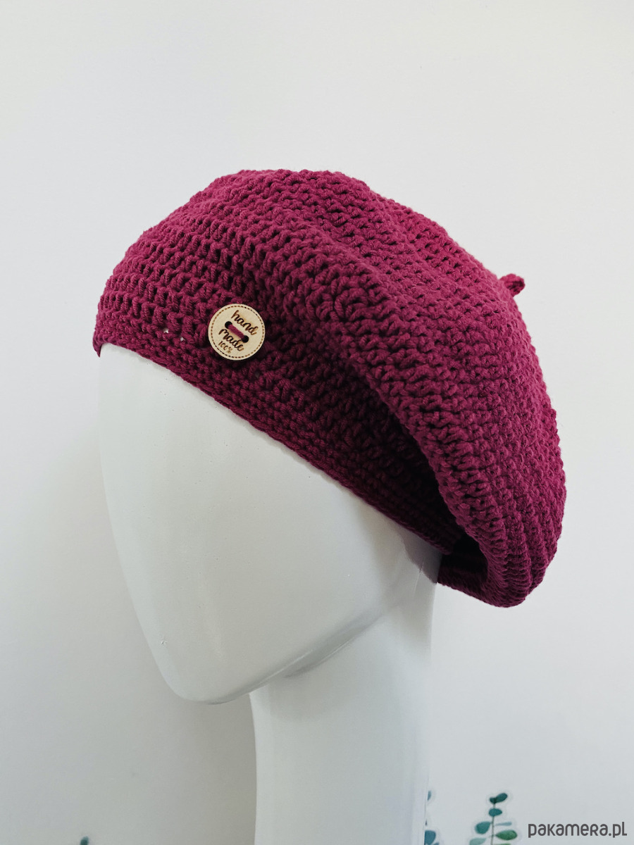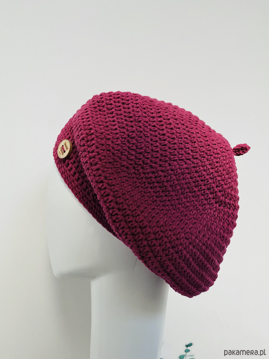 Wiosenny beret damski z antenką ręcznie robiony bawełna one size amarant