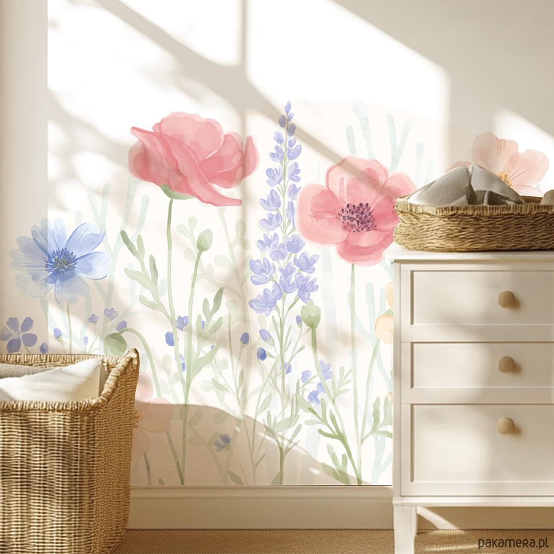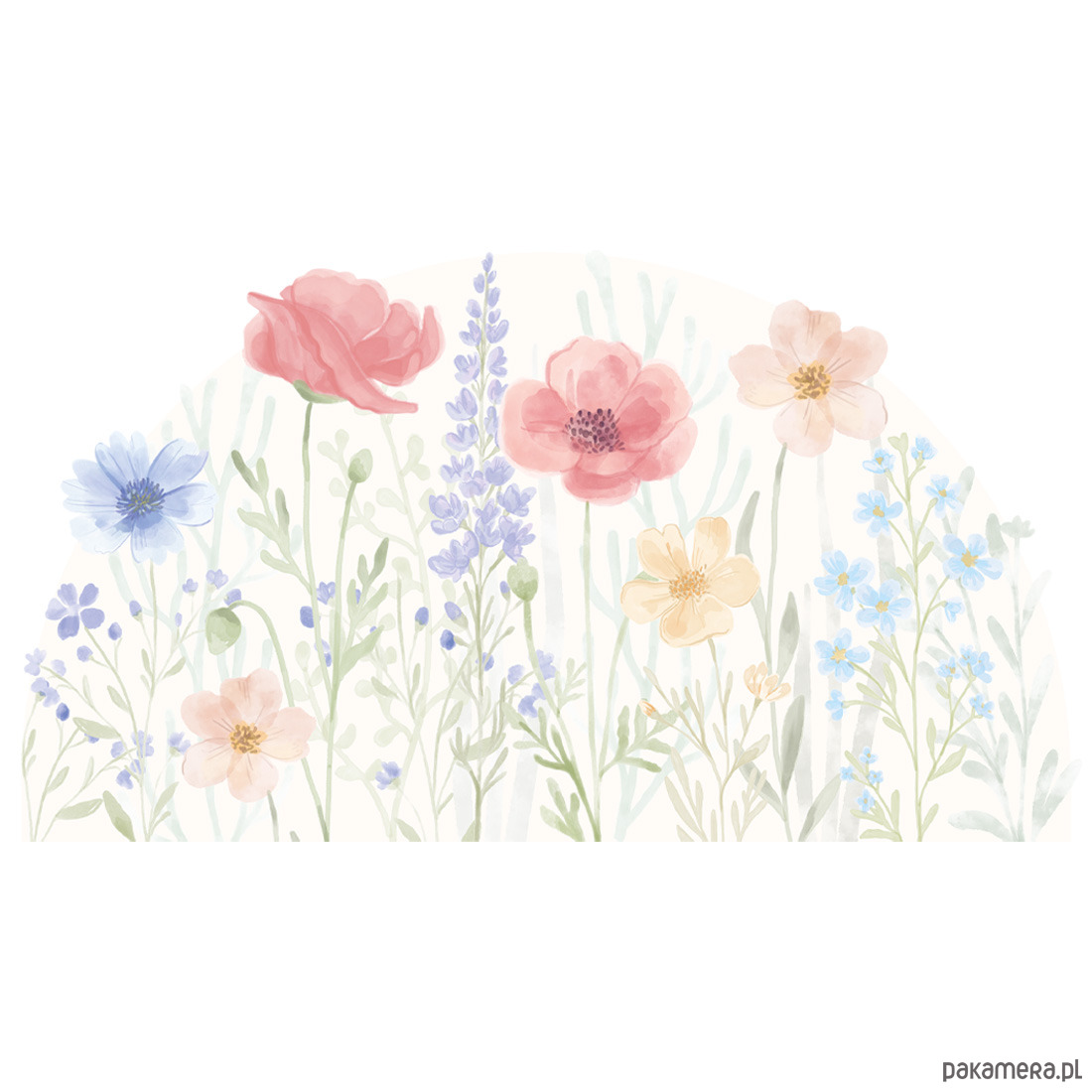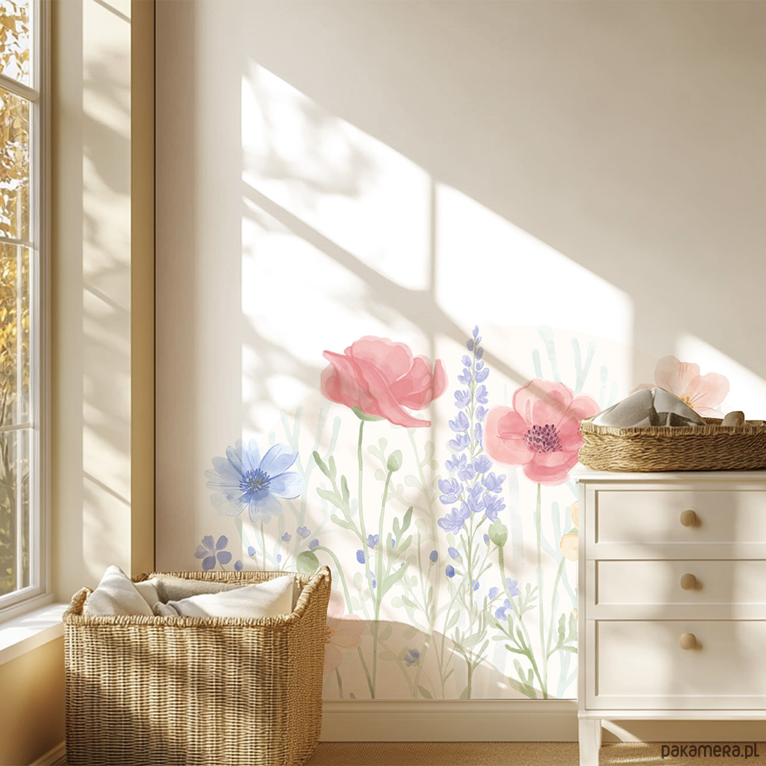 Naklejka na ścianę - "wiosenny ogród" to wyjątkowa naklejka ścienna dla dzieci z kwiatami, która wnosi do pokoju lekkość, świeżość i naturalne piękno. Pastelowe maki, drobne niezapominajki i delikatne polne kwiaty tworzą romantyczną kompozycję inspirowaną łąką w pełni wiosny.
