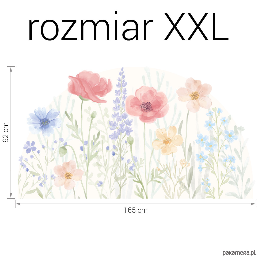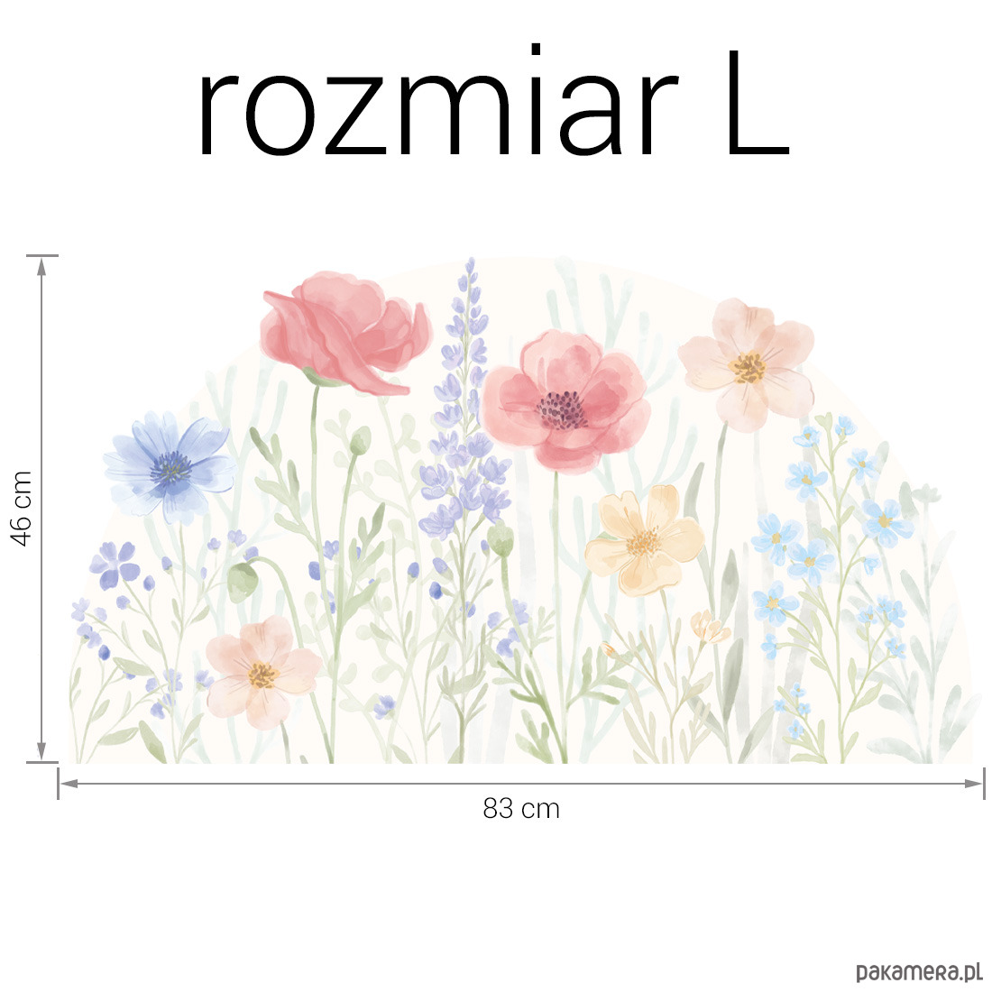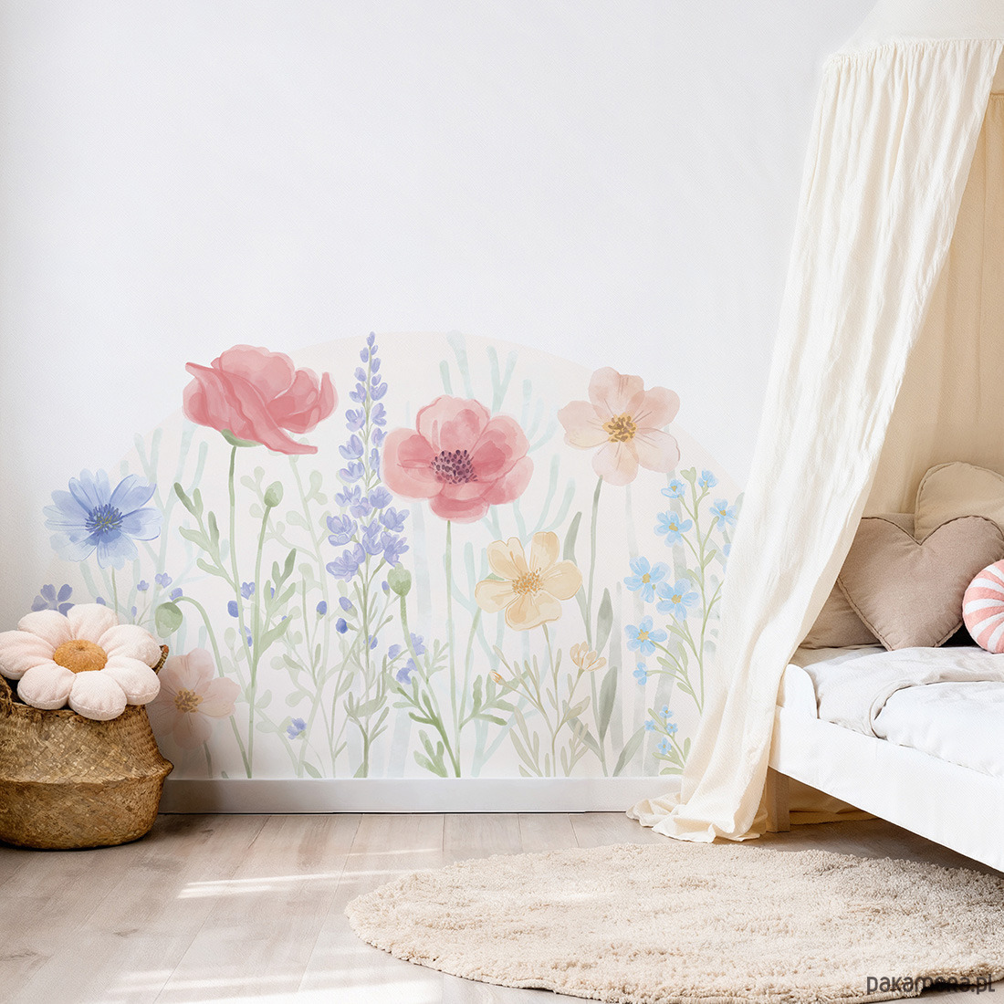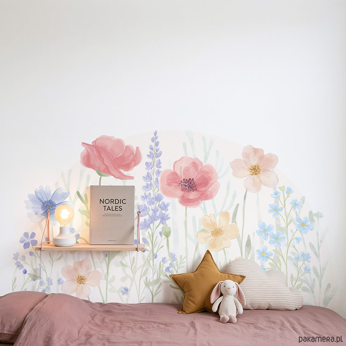 Naklejka na ścianę - "wiosenny ogród" to wyjątkowa naklejka ścienna dla dzieci z kwiatami, która wnosi do pokoju lekkość, świeżość i naturalne piękno. Pastelowe maki, drobne niezapominajki i delikatne polne kwiaty tworzą romantyczną kompozycję inspirowaną łąką w pełni wiosny.