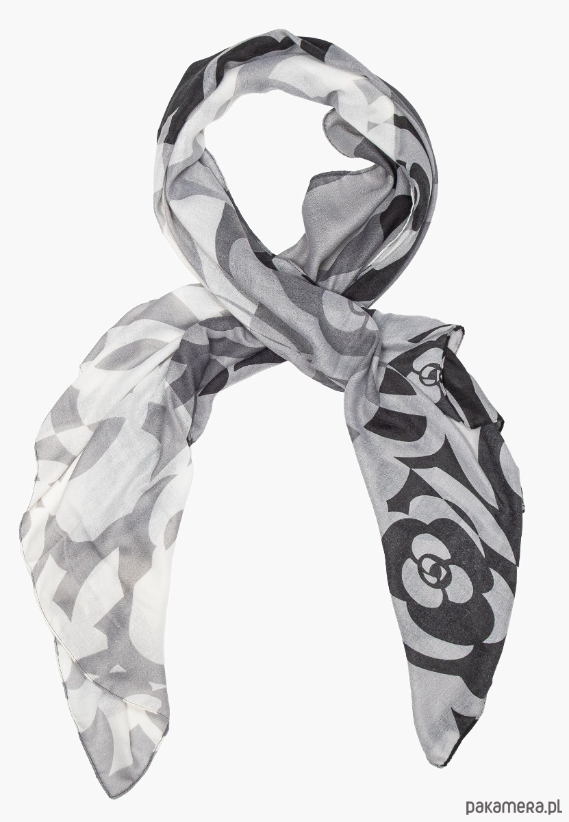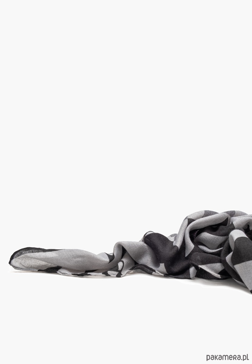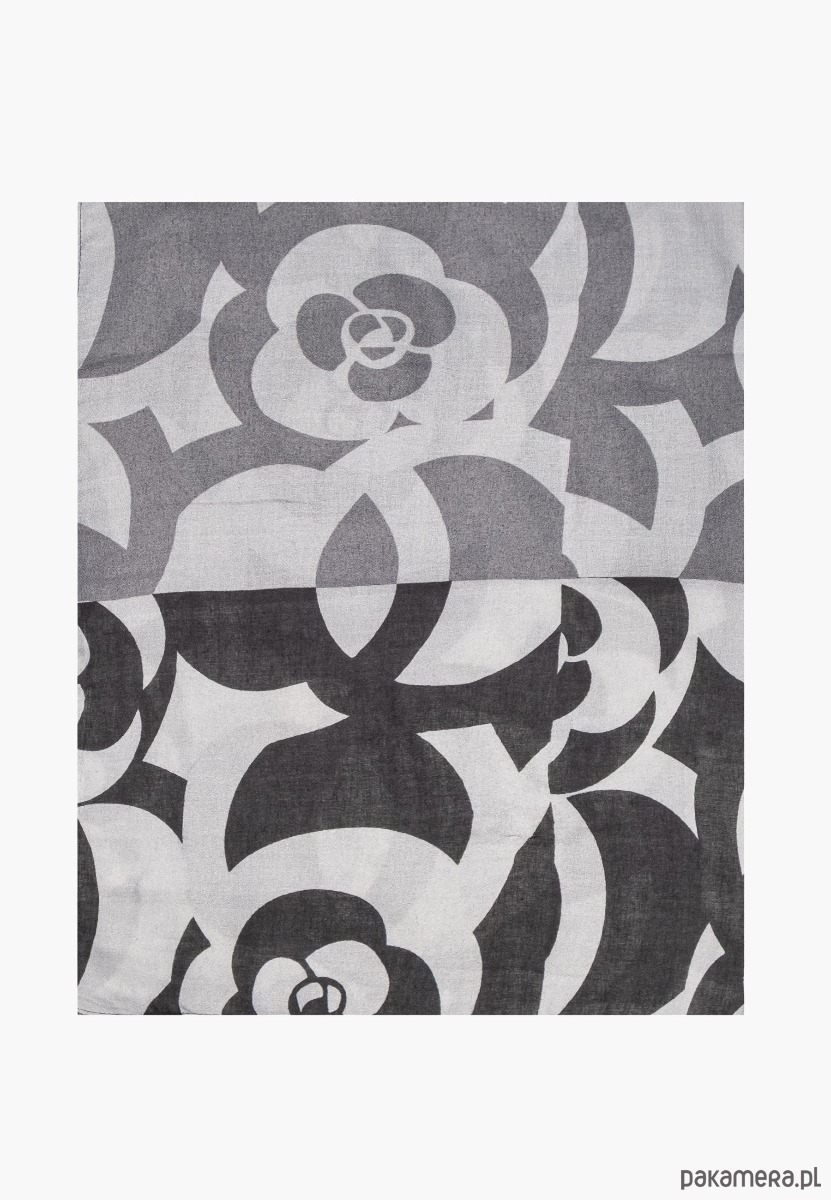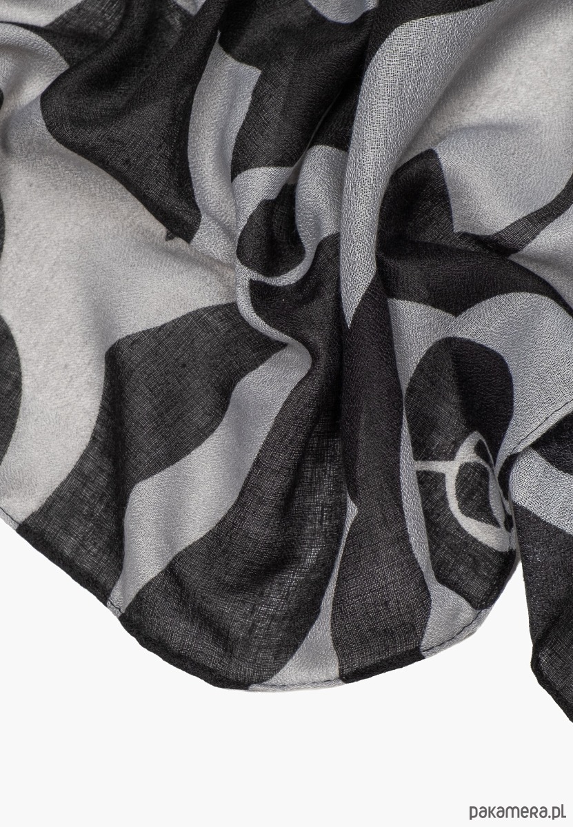 * Stylowy czarno-biały szal damski – elegancki dodatek z graficznym, kwiatowym wzorem w odcieniach czerni, szarości i bieli.