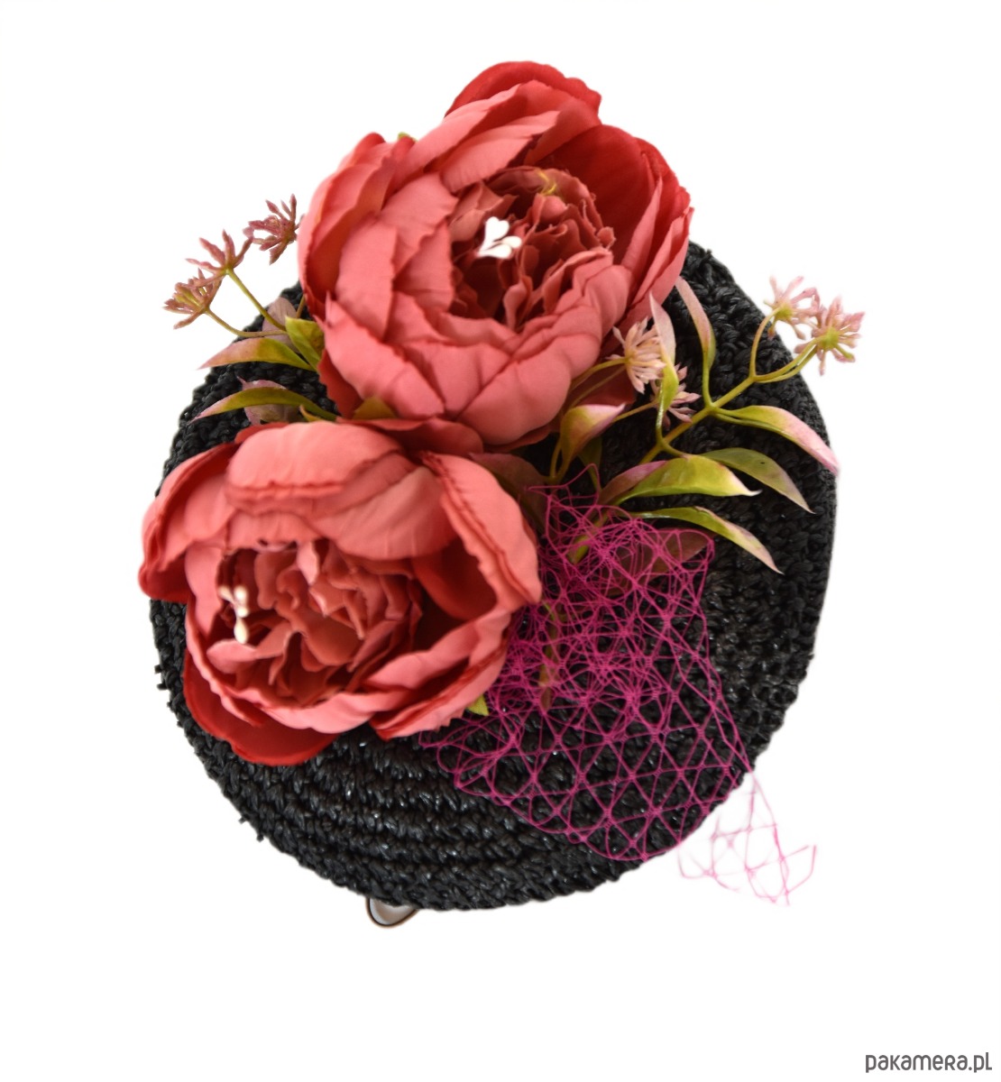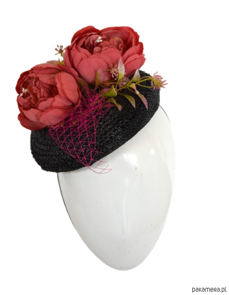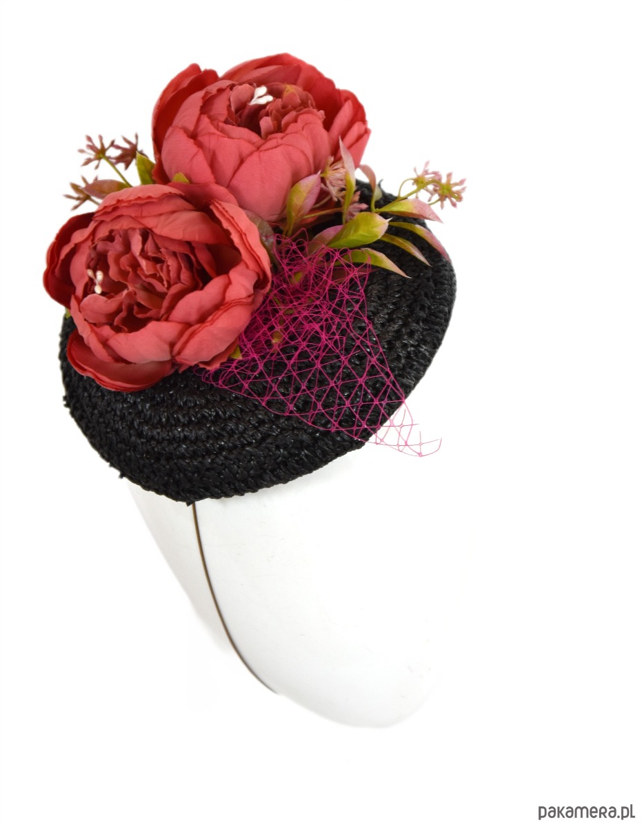 Toczek wykonany ze słomki kapeluszowej w kolorze czarnym. Zdobiony kwiatami i woalką. Mocowany na gumce kapeluszowej. Średnica 20cm.