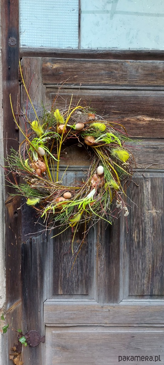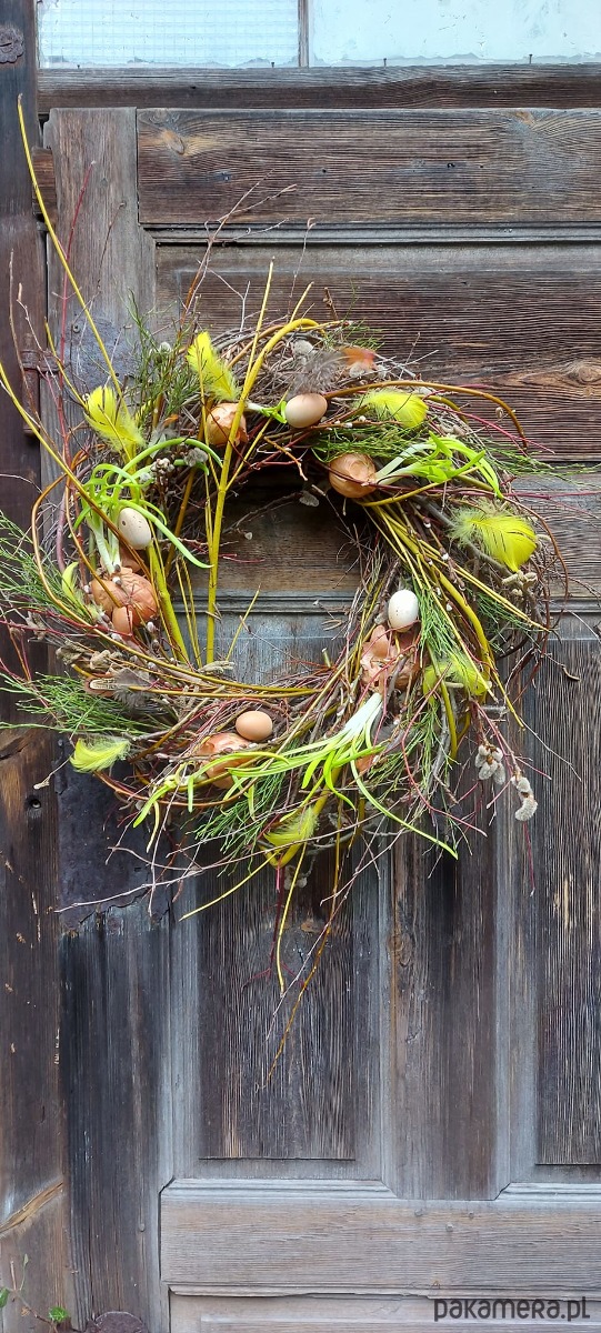 Wianek zrobiony z gałęzi brzozy , derenia zielonego , czerwonego ,bazi, cebuli , piór