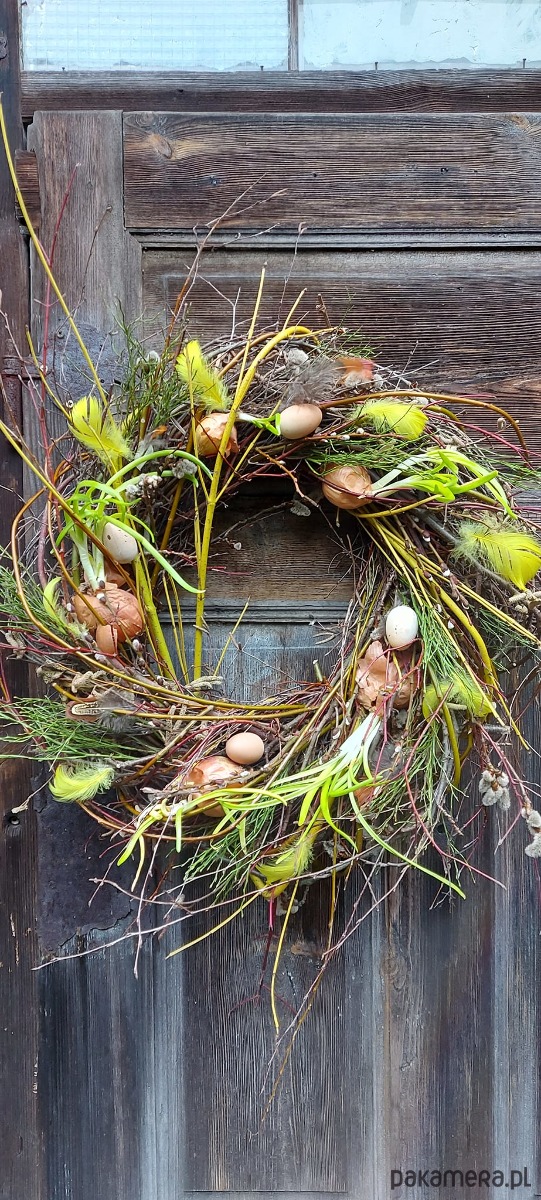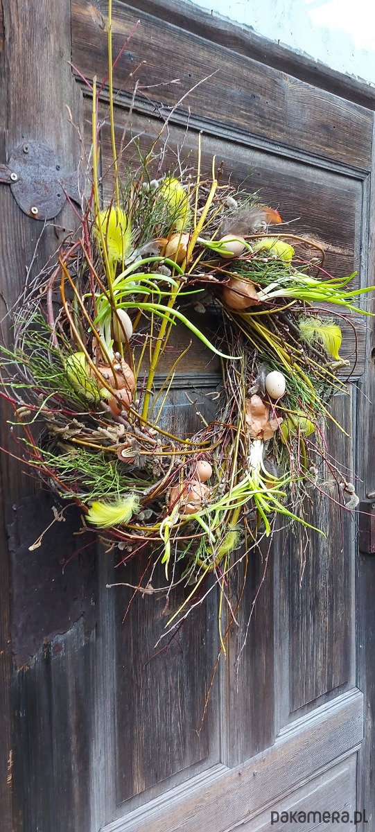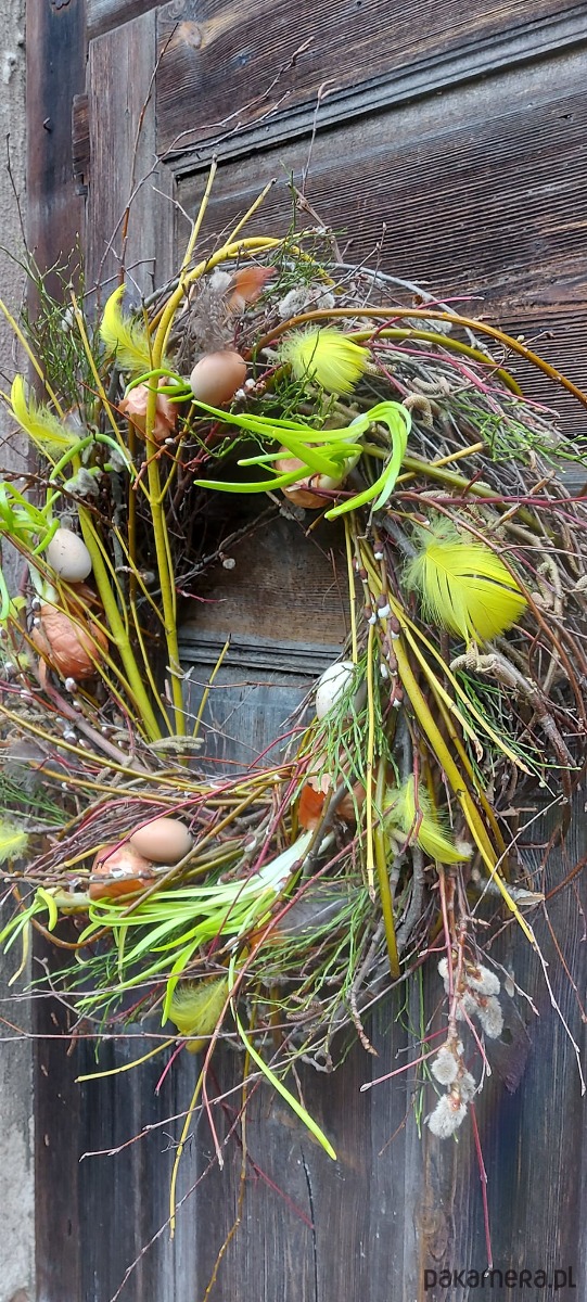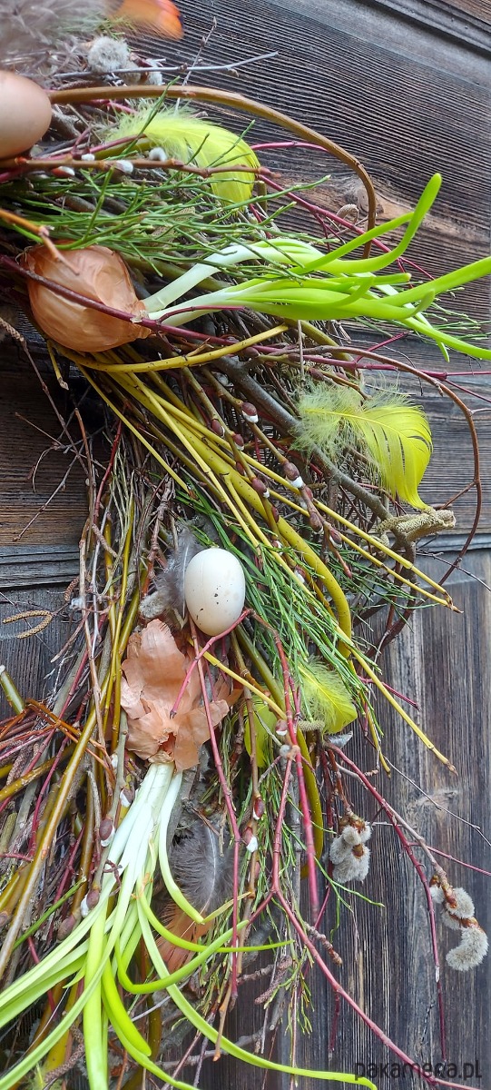 Wianek zrobiony z gałęzi brzozy , derenia zielonego , czerwonego ,bazi, cebuli , piór