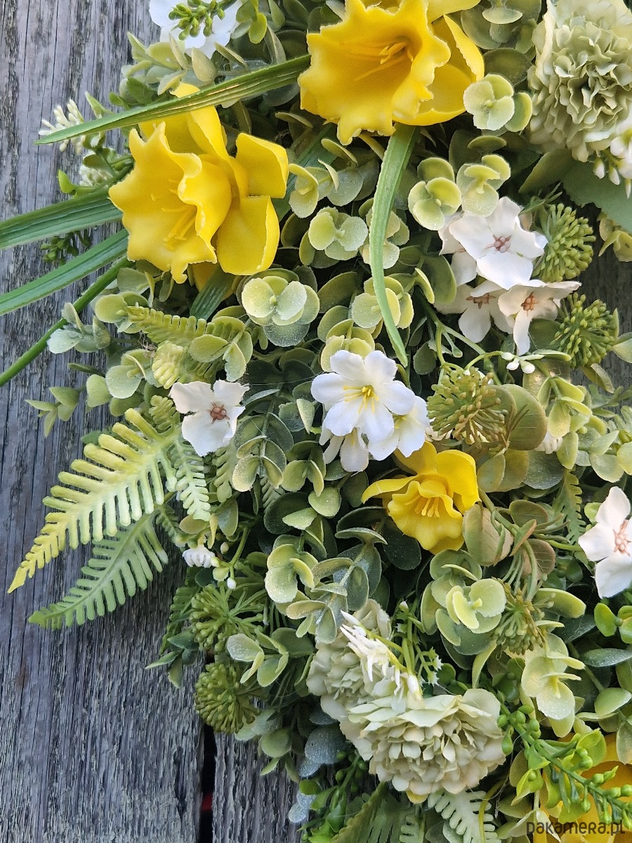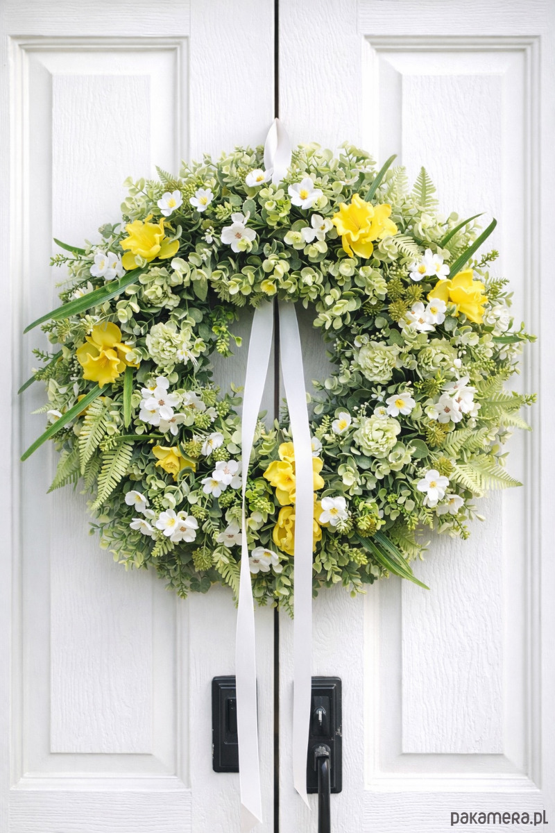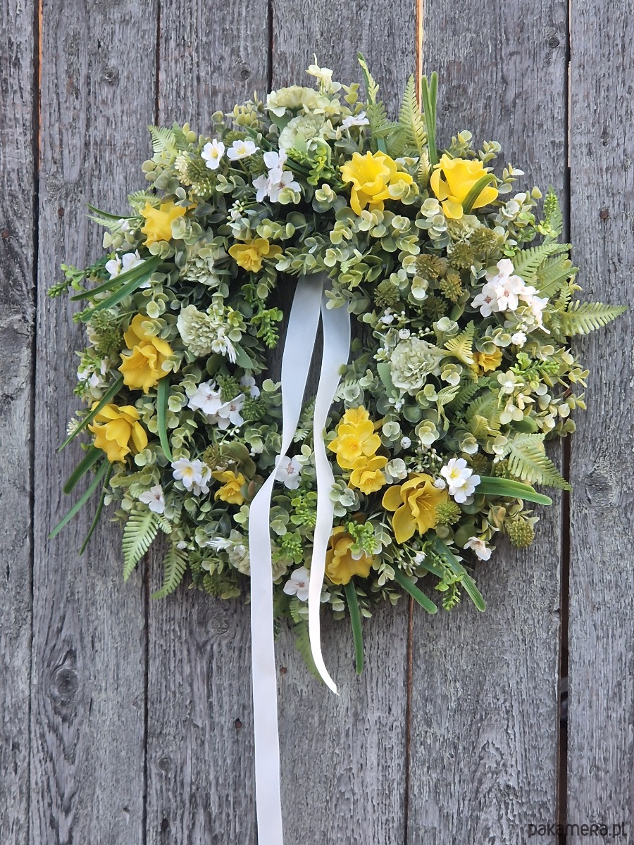Prezentowany wianek wykonany jest z wysokiej jakości sztucznych kwiatów i gałązek do złudzenia przypominających żywe.