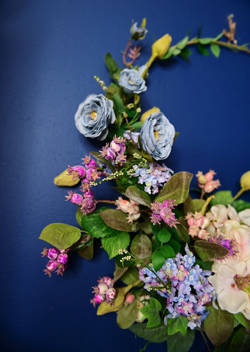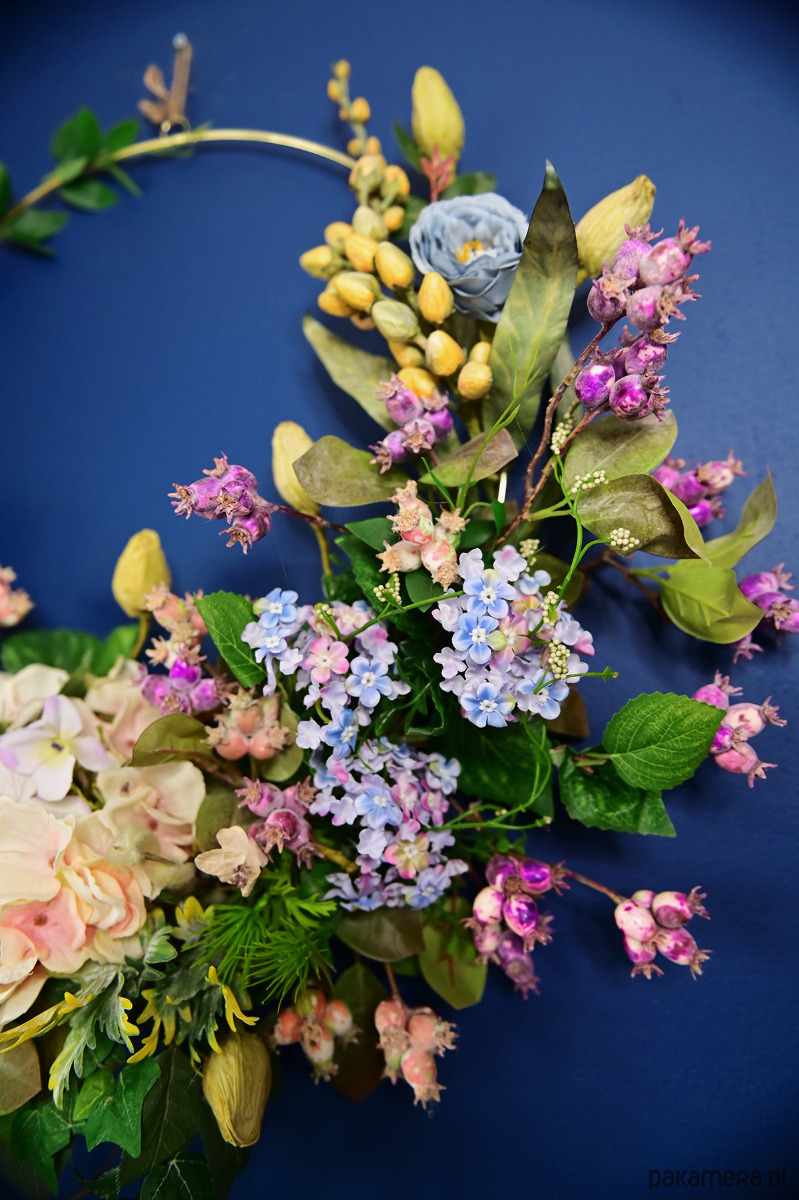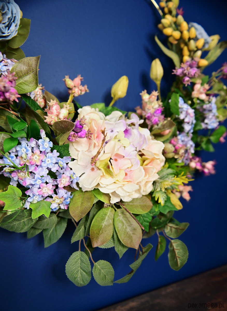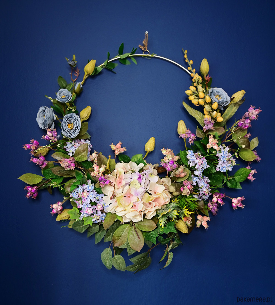 Uroczy wianek będzie stanowił niezwykłą ozdobę Twoich wnętrz. Wiosenny wianek na metalowej obręczy został udekorowany kwietną kompozycją. Powieszony na drzwiach lub ścianie będzie pozytywnym akcentem, który powita Cię od razu po wejściu do domu :) Średnica metalowego koła to 50 cm, całej kompozycji ok. 78 cm.