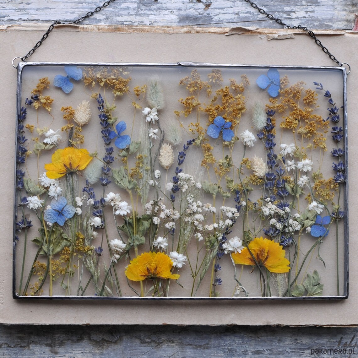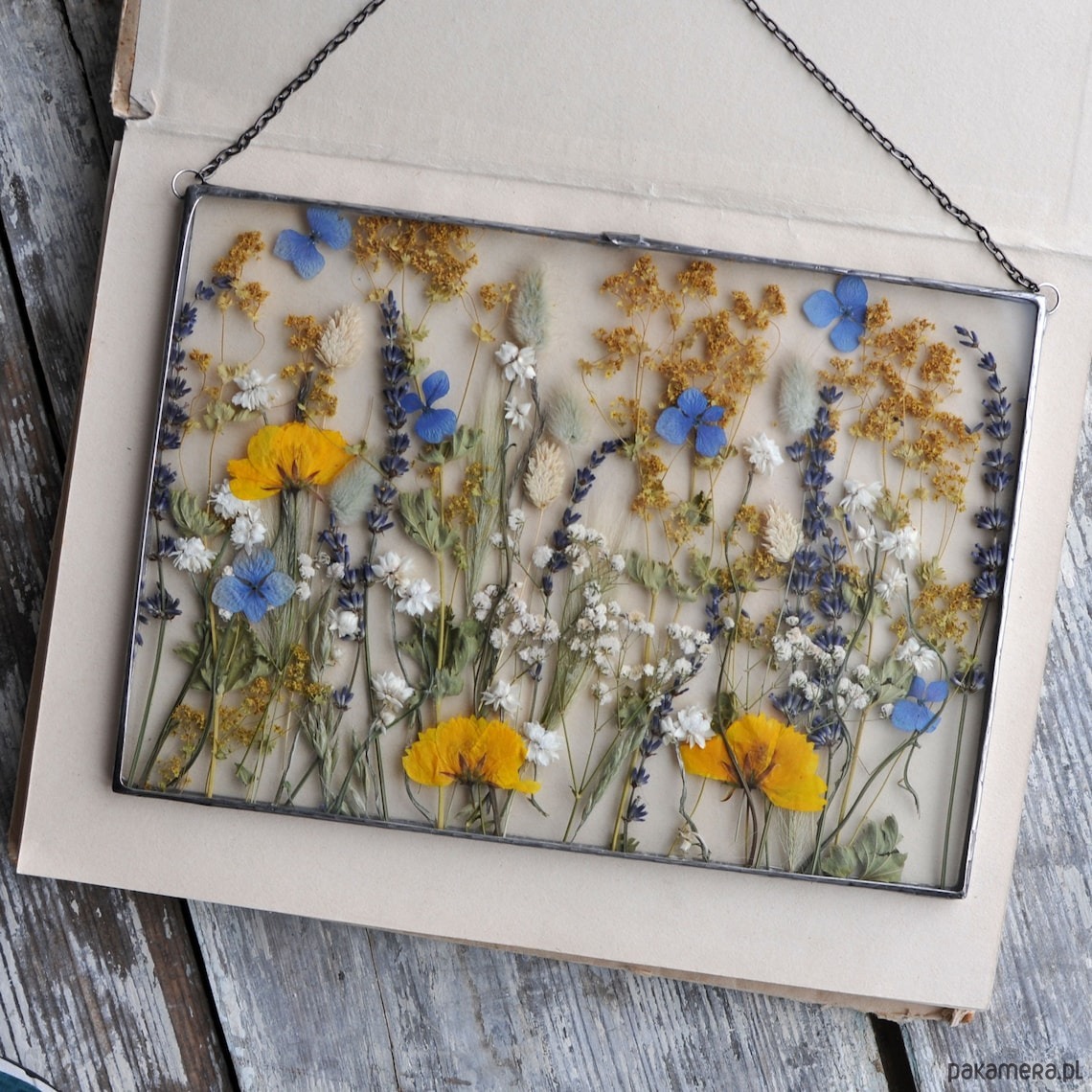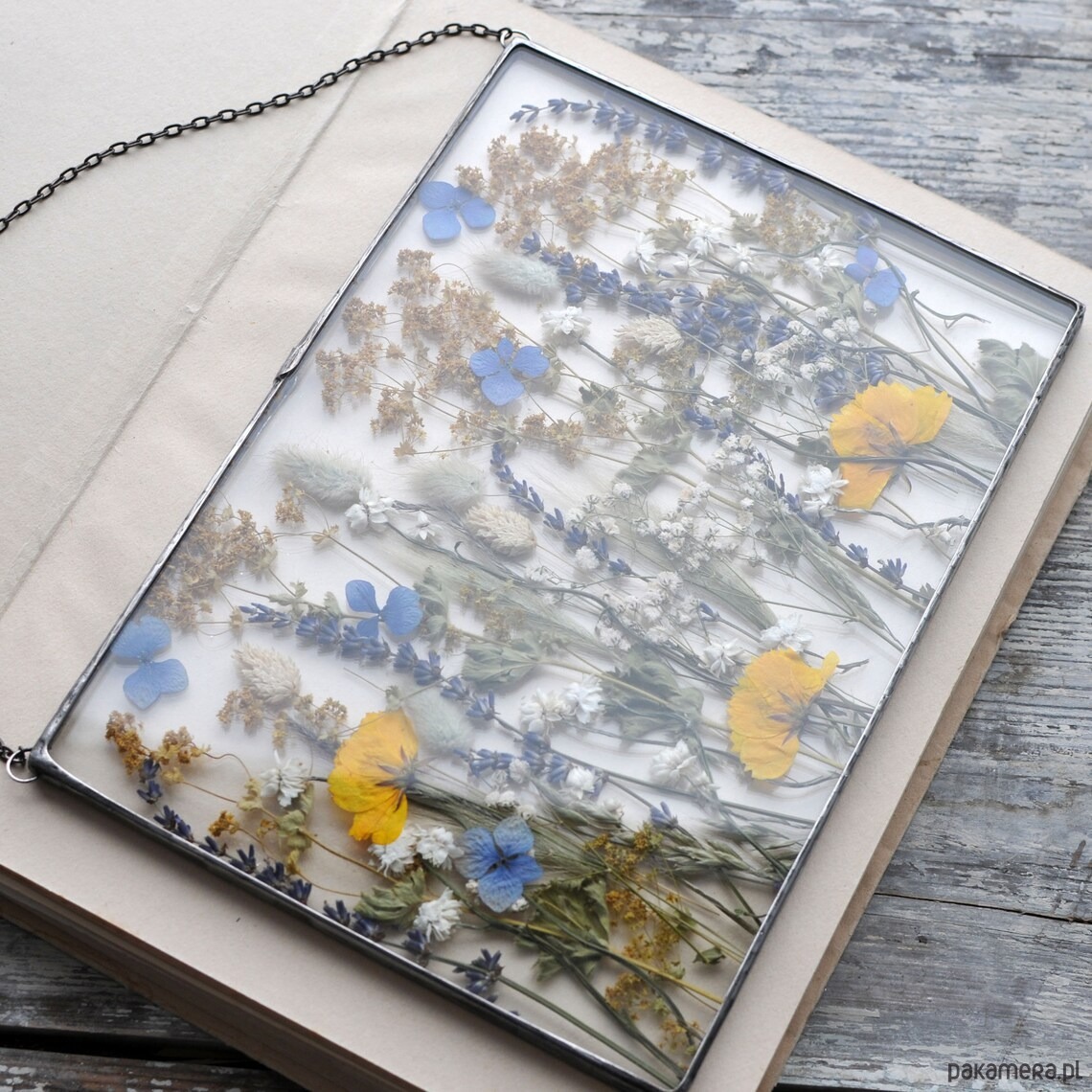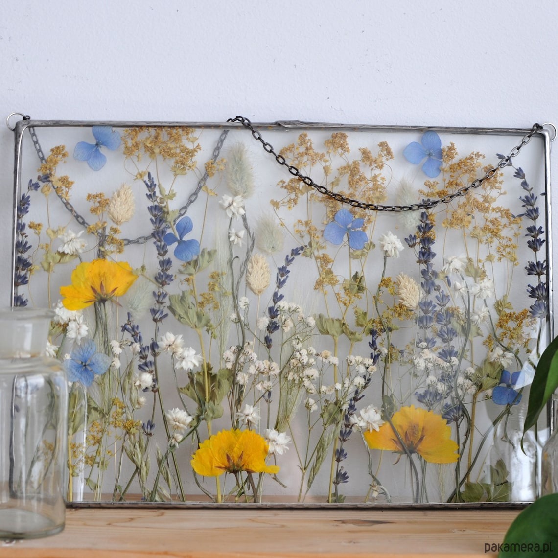 Szklany witraż formatu A4 z dekoracją z suszonych kwiatów i polnych roślin.