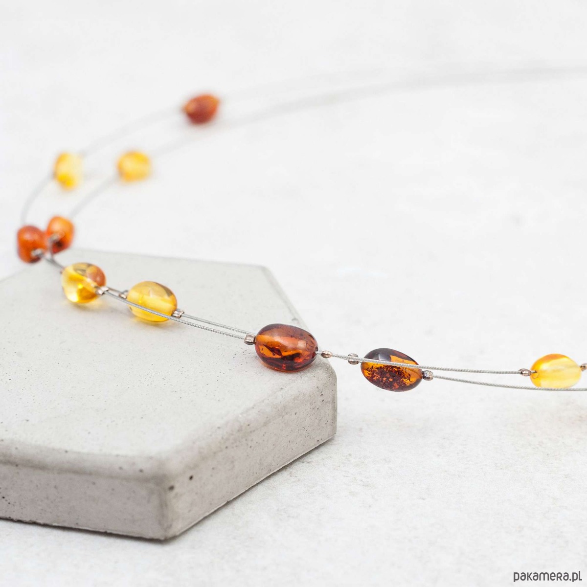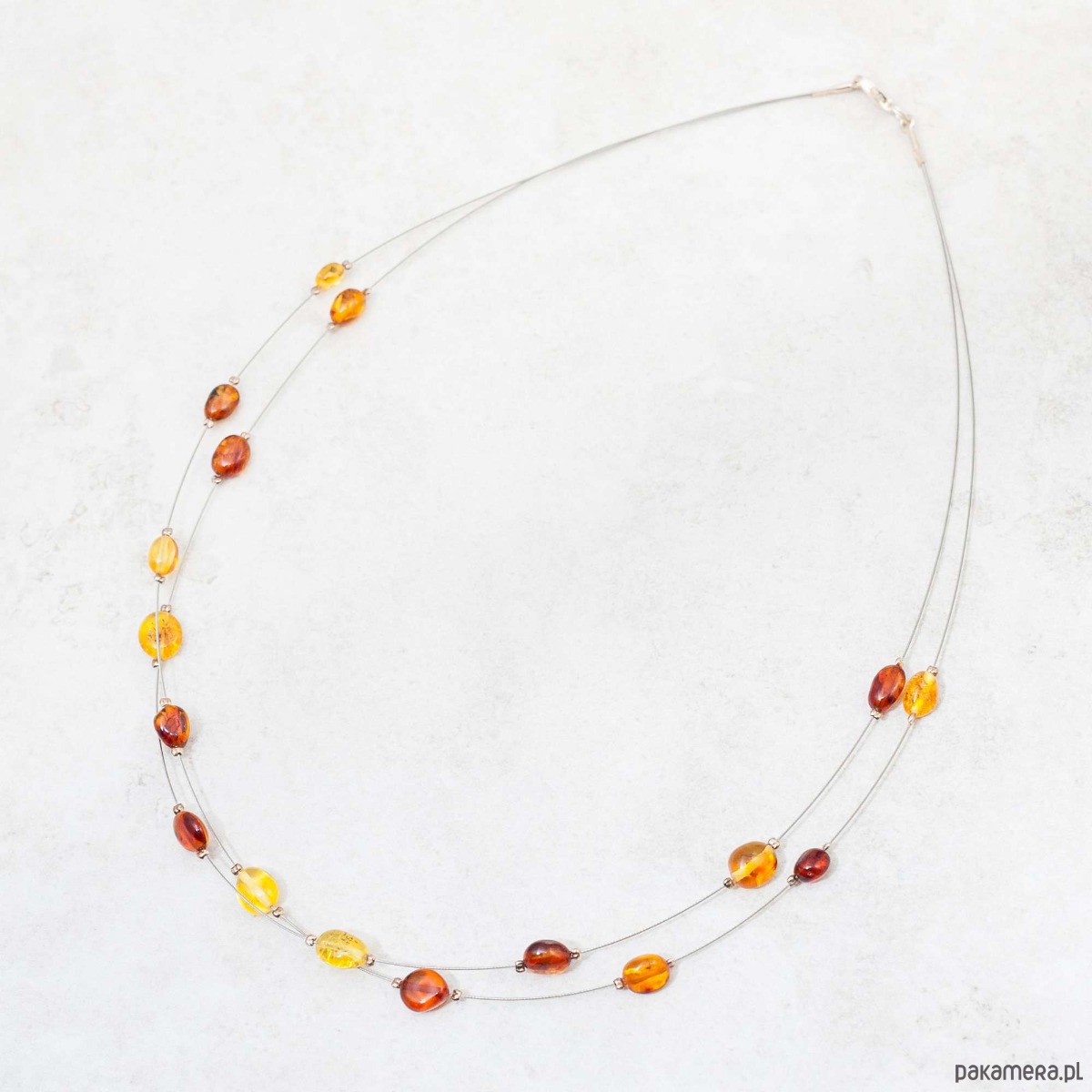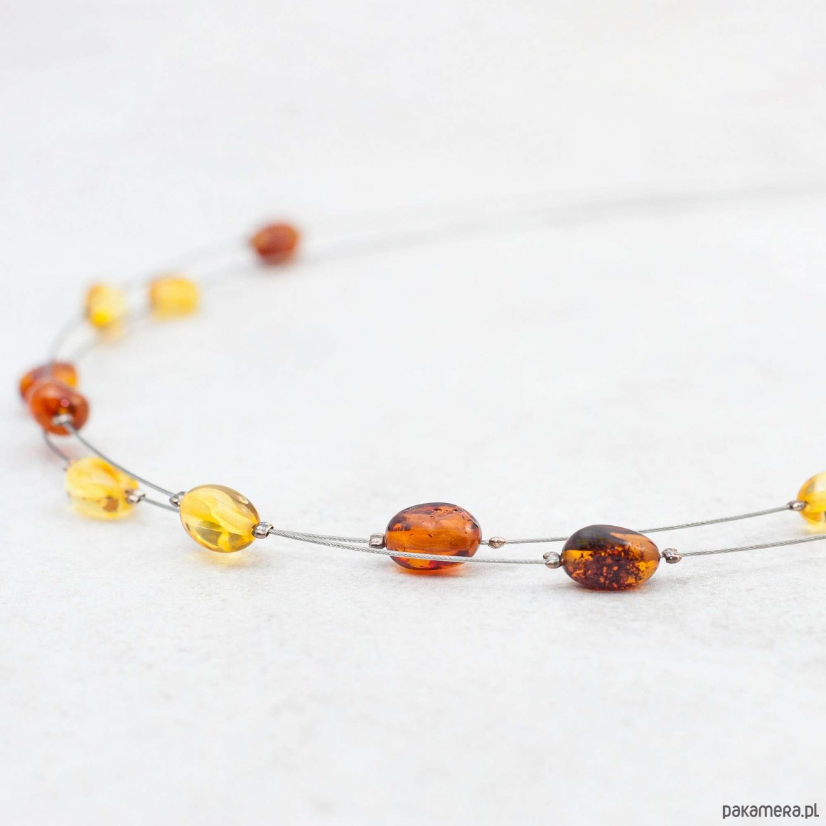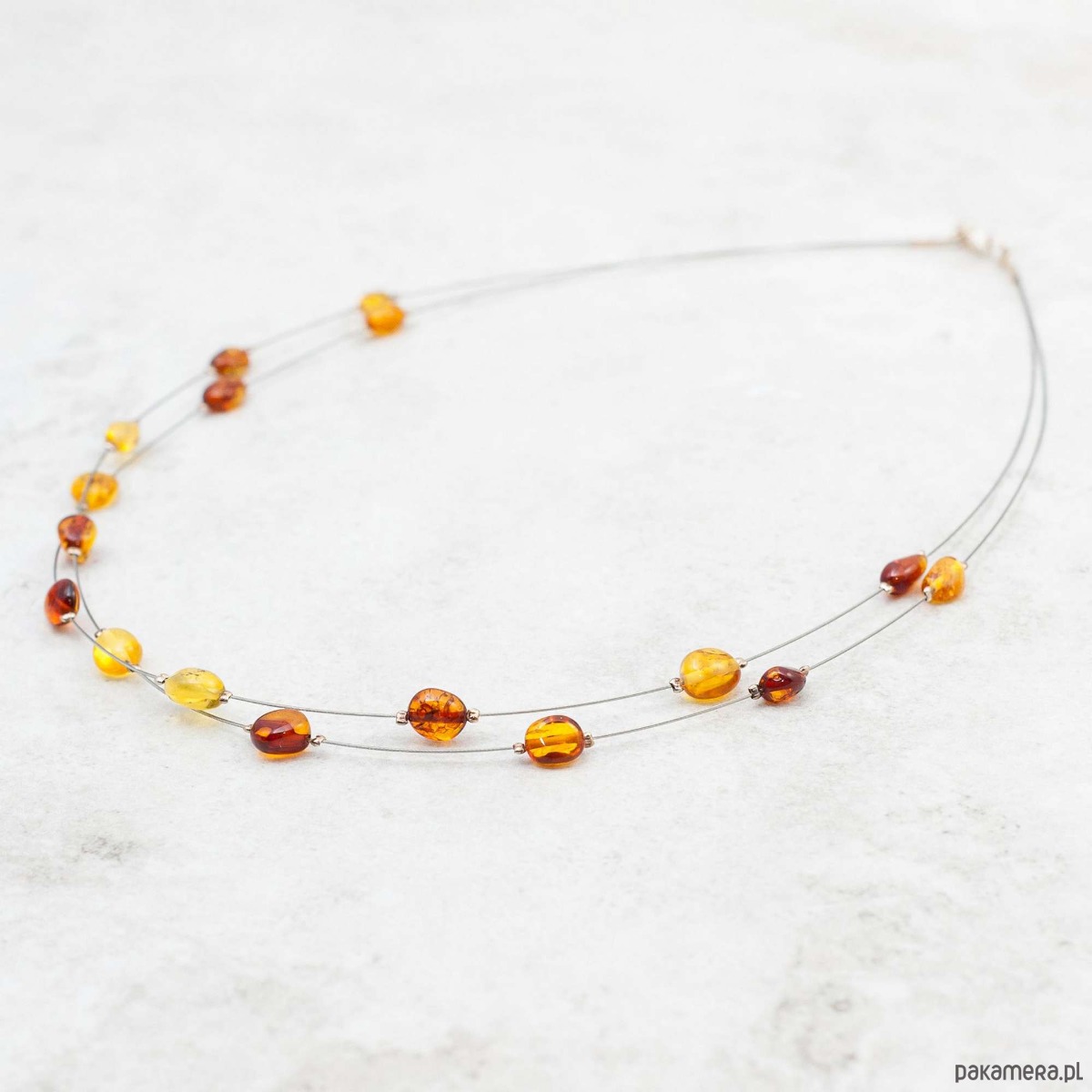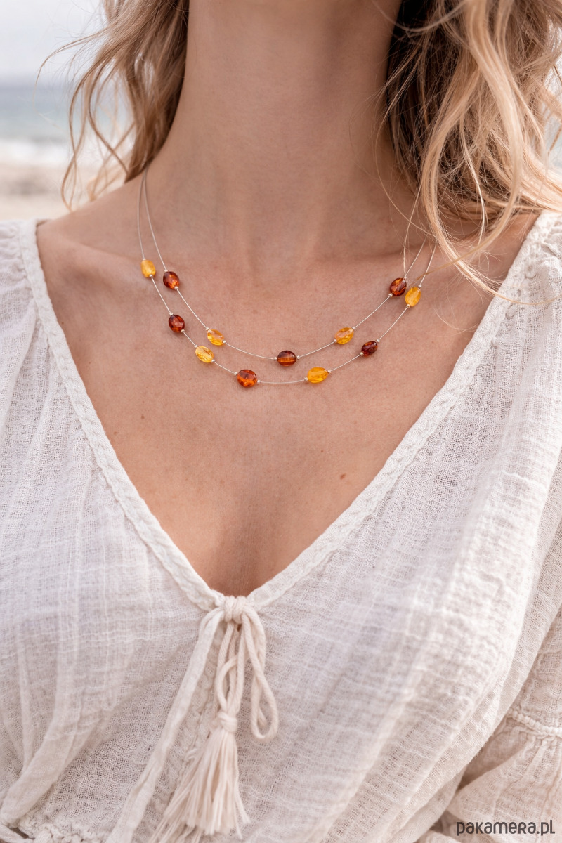 Minimalistyczny i elegancki naszyjnik z naturalnym bursztynem bałtyckim w ciepłych kolorach. Delikatna, nowoczesna forma oparta na dwóch stalowych linkach subtelnie podkreśla dekolt, a nieregularnie rozmieszczone bursztynowe koraliki nadają całości lekkości i naturalnego charakteru.
