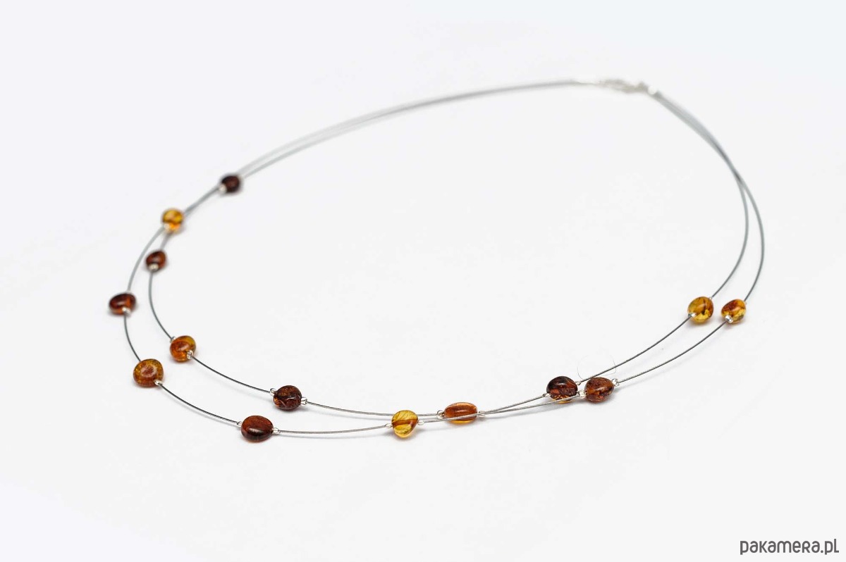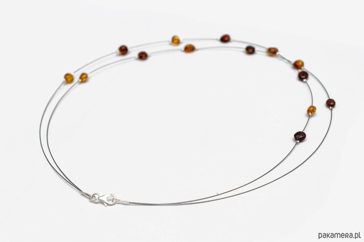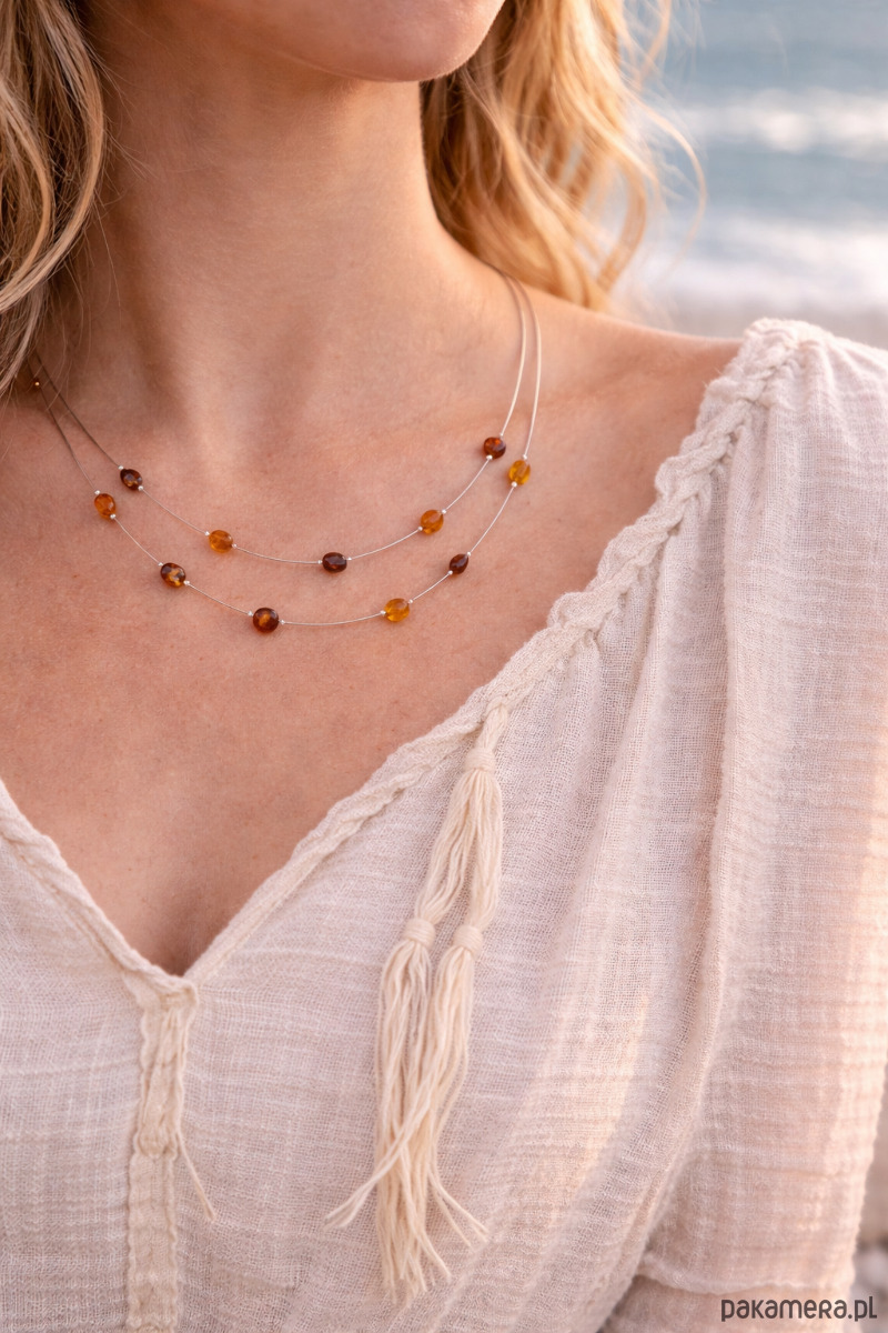 Minimalistyczny i elegancki naszyjnik z naturalnym bursztynem bałtyckim w ciepłym, koniakowym odcieniu. Delikatna, nowoczesna forma oparta na dwóch stalowych linkach subtelnie podkreśla dekolt, a nieregularnie rozmieszczone bursztynowe kulki nadają całości lekkości i naturalnego charakteru.