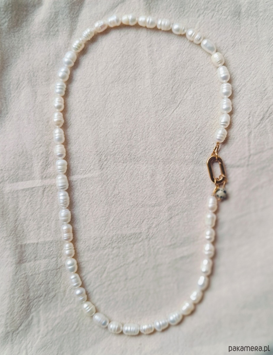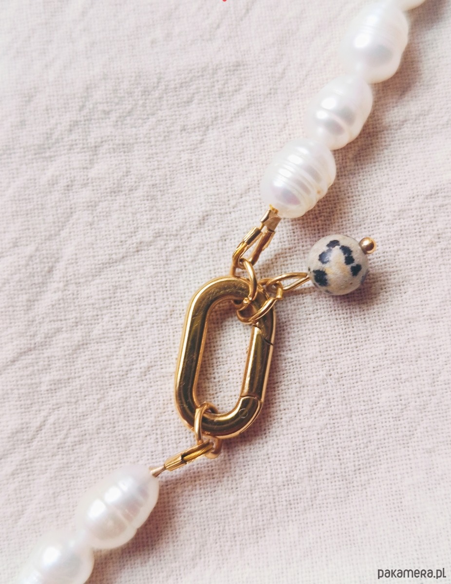 Naszyjnik z pereł hodowlanych na nici stalowej z efektownym zapięciem ze stali chirurgicznej. Jest tu też akcent z jaspisu dalmatyńskiego który można zdjąć lub dodać inny akcent.