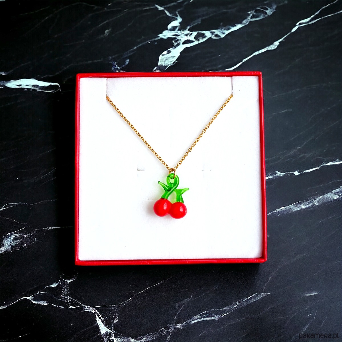 Wisienki : naszyjnik : klasyczny łańcuszek : czerwone pudełeczko
