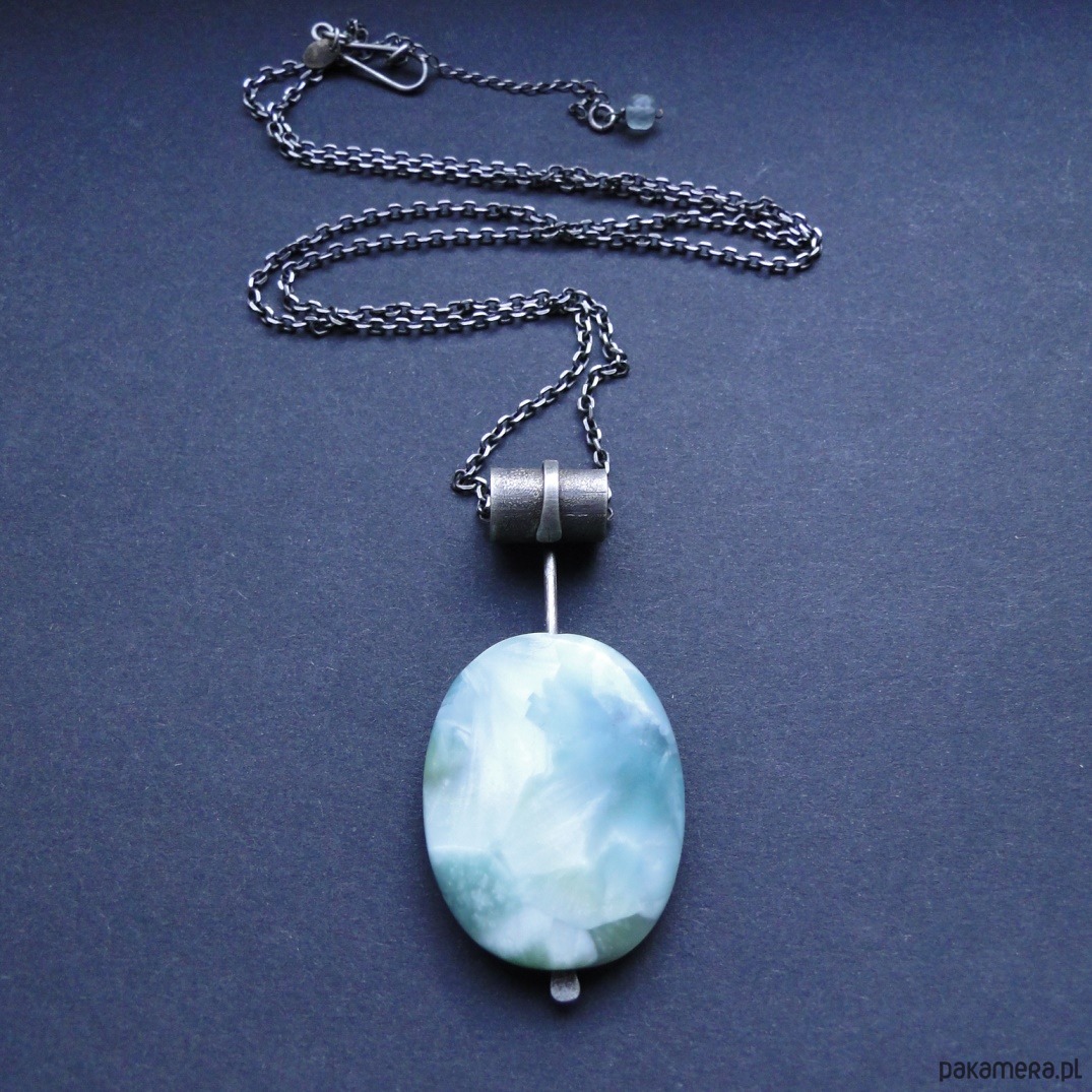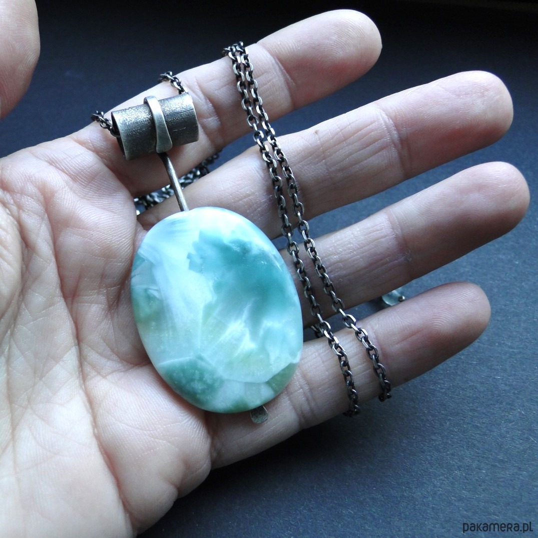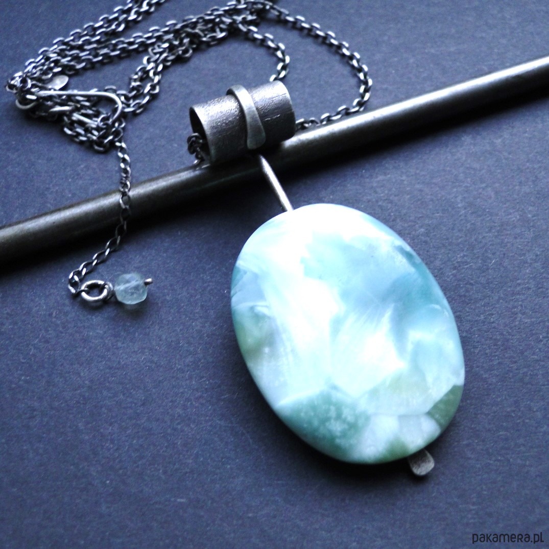 Surowy,efektowny wisior z pięknym kamieniem. Srebro pr.925,oksydowane i szorowane. Kamień: naturalny angelit w miętowym kolorze,długość 4 cm,różne odcienie mięty, piękna poświata niespotykana u innych minerałów. Masywny łańcuch dł.69 cm plus przedłużka 6 cm. Malutki fluoryt przy zapięciu.