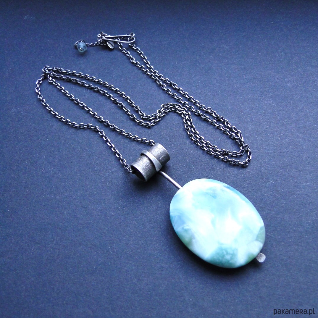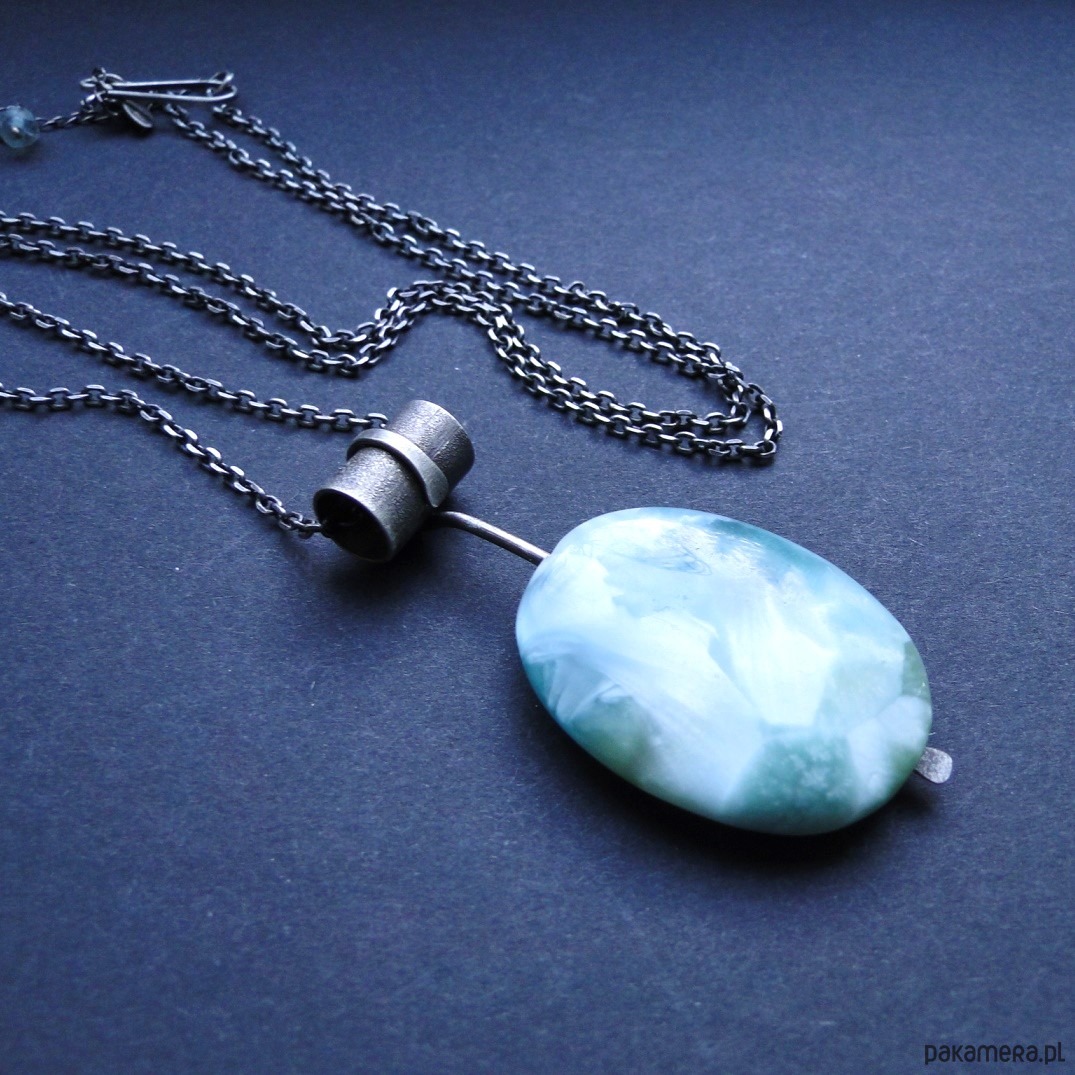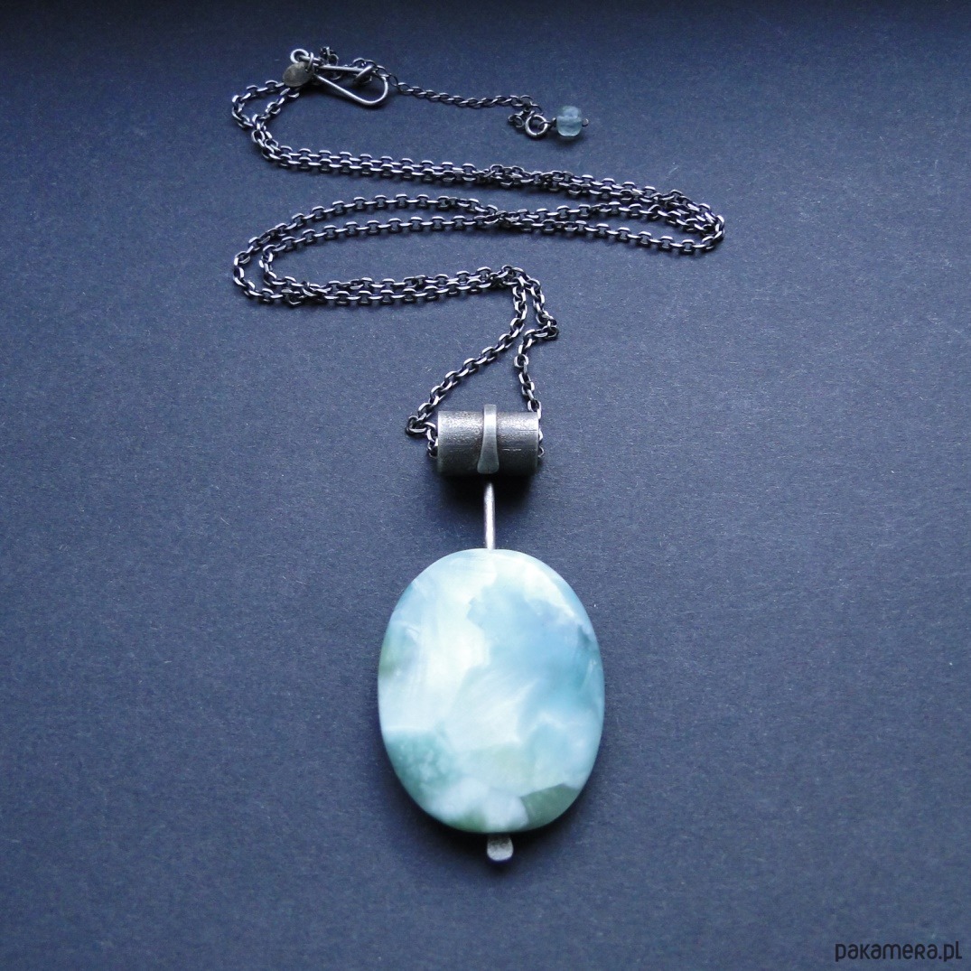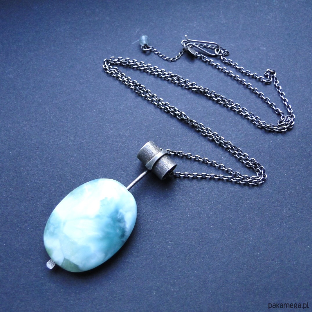 Surowy,efektowny wisior z pięknym kamieniem. Srebro pr.925,oksydowane i szorowane. Kamień: naturalny angelit w miętowym kolorze,długość 4 cm,różne odcienie mięty, piękna poświata niespotykana u innych minerałów. Masywny łańcuch dł.69 cm plus przedłużka 6 cm. Malutki fluoryt przy zapięciu.