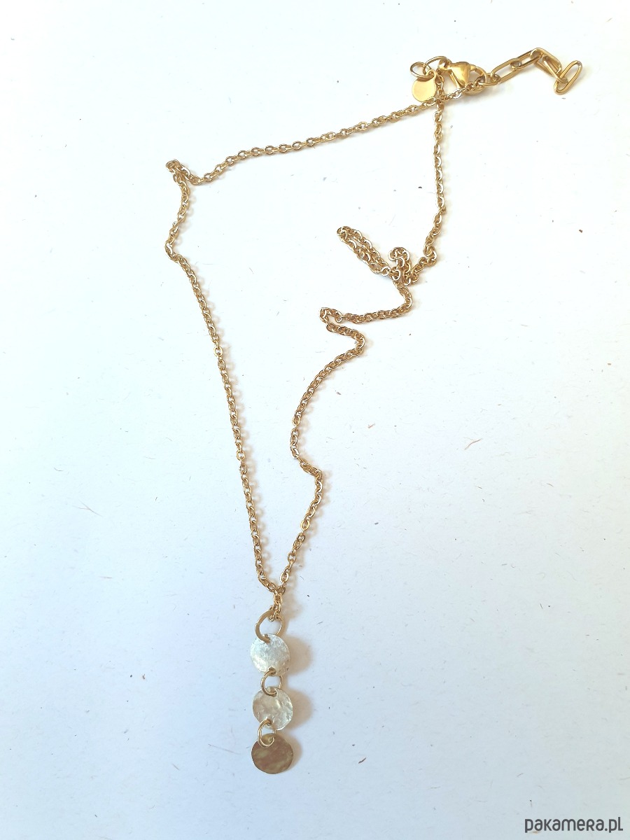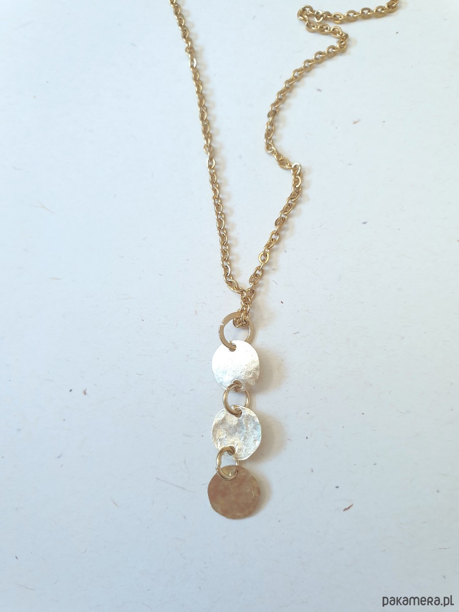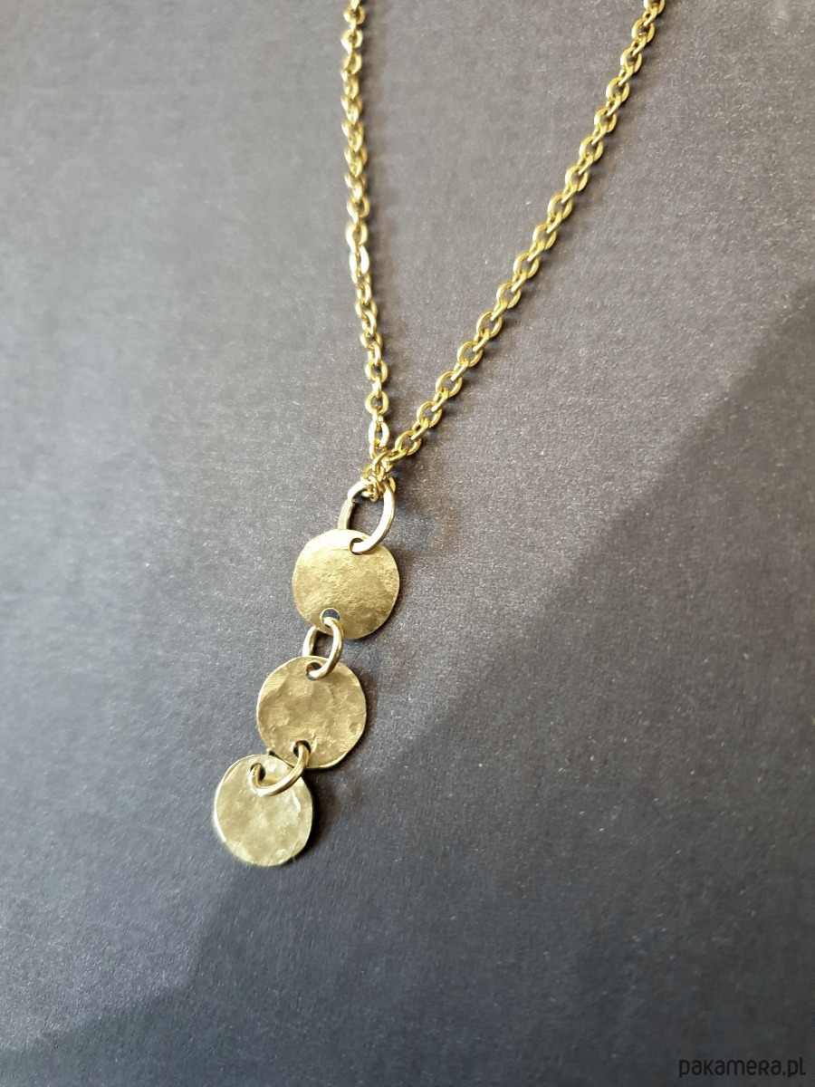 Minimalistyczny delikatny wisior na łańcuszku z kolekcji RAW ANTYK inspirowanej starożytnymi mozaikami, neolitycznymi płaskorzeźbami i starymi rycinami. Łańcuszek ze stali szlachetnej pozłacany z zawieszką w kółka, ręcznie młotkowaną z surowego mosiądzu.