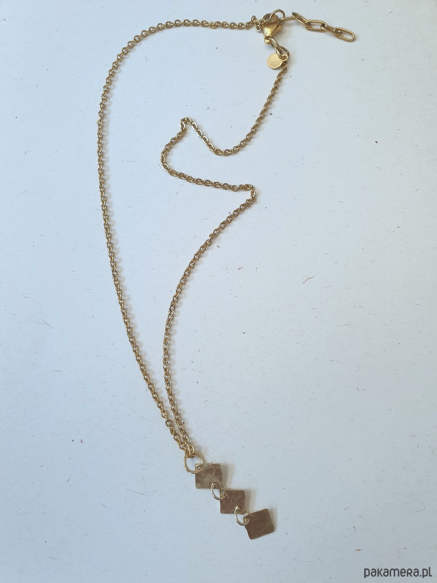 Minimalistyczny delikatny wisior na łańcuszku z kolekcji RAW ANTYK inspirowanej starożytnymi mozaikami, neolitycznymi płaskorzeźbami i starymi rycinami. Łańcuszek ze stali szlachetnej pozłacany z zawieszką w romby ręcznie młotkowaną z surowego mosiądzu.