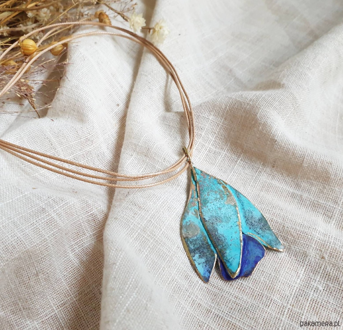 Botaniczny wyrazisty naszyjnik - tulipan z patynowanego mosiądzu.