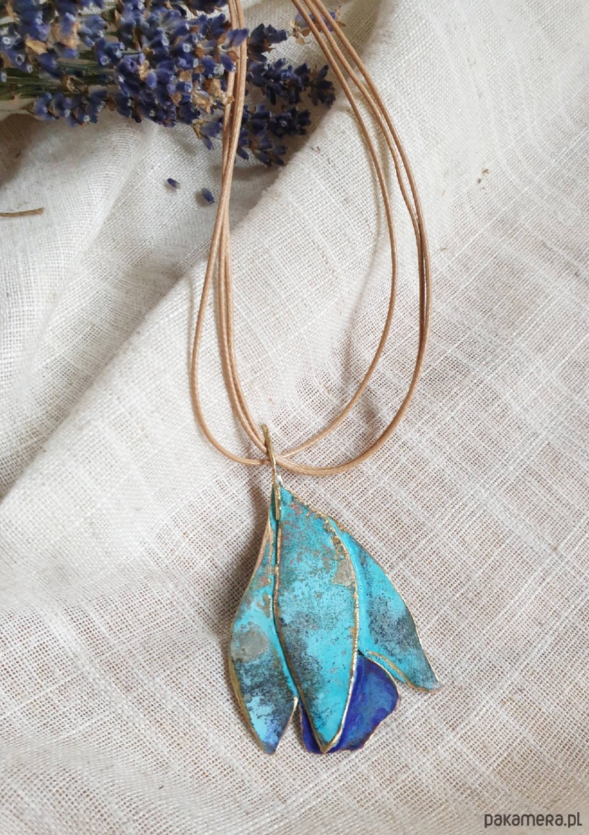 Całość zawieszona na potrójnym jubilerskim sznurku, który pięknie podkreśla naturalny charakter biżuterii i zapewnia wygodę noszenia.