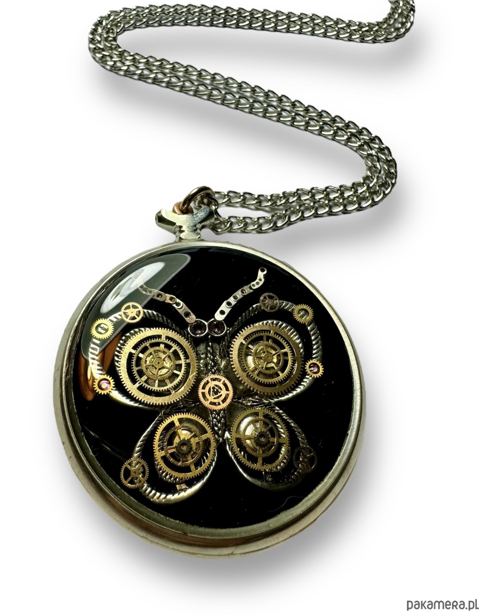 - Materiał: trybiki i elementy ze starego mechanizmu zegarka ułożone w trójwymiarowego motyla. Całość zatopiona w starej, srebrnej bazie po zegarku kopertowym. Koperta zdobiona motywem kwiatowym.