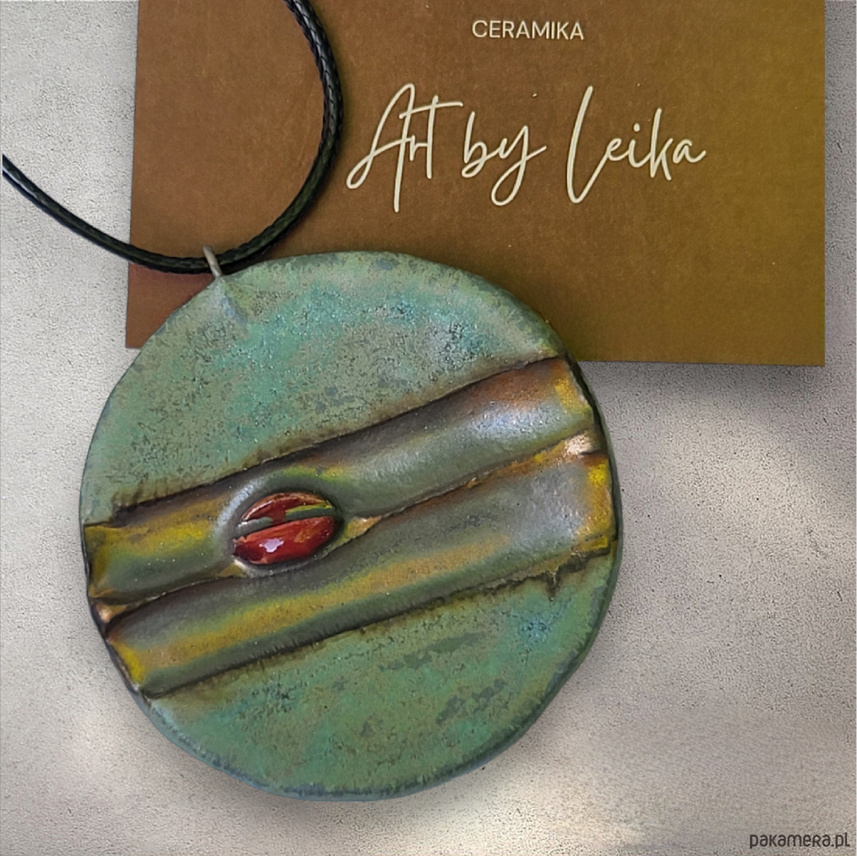 Ręcznie formowany ceramiczny wisior o średnicy okolo 5,5 cm